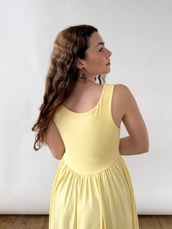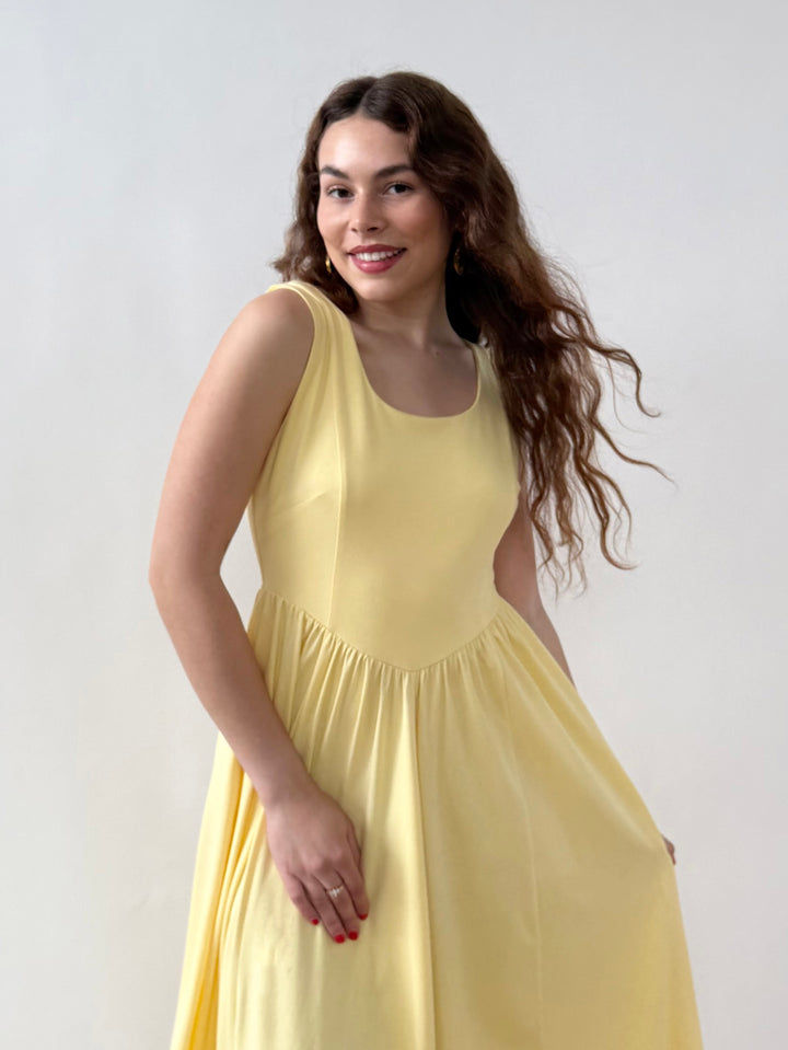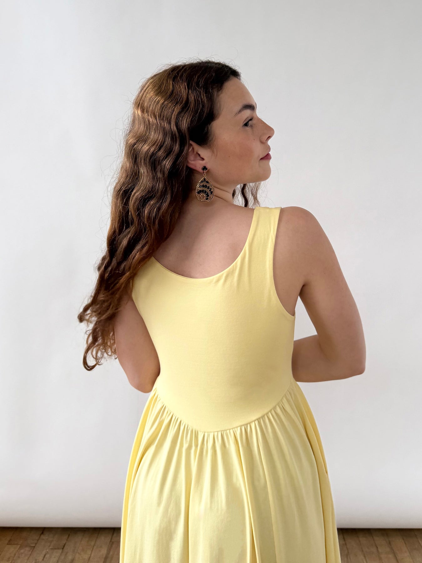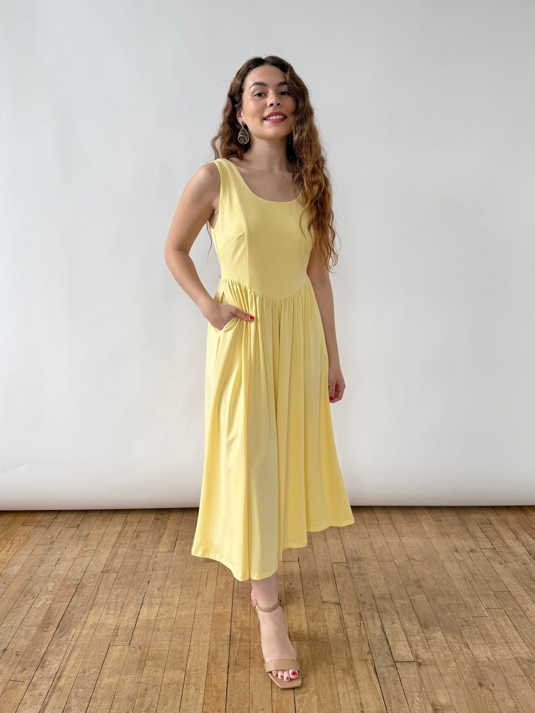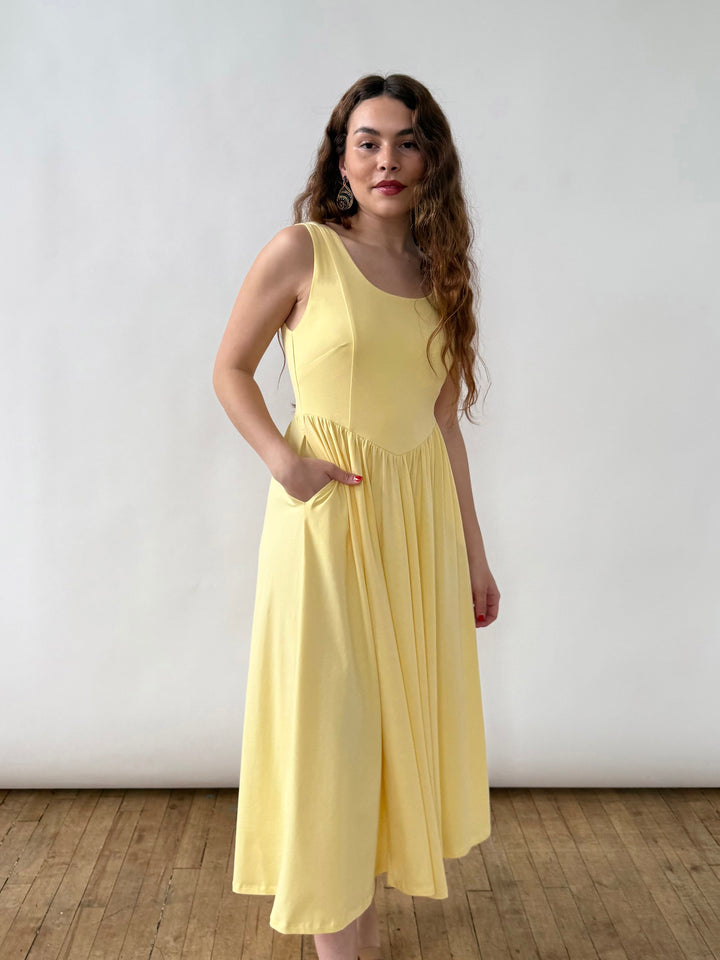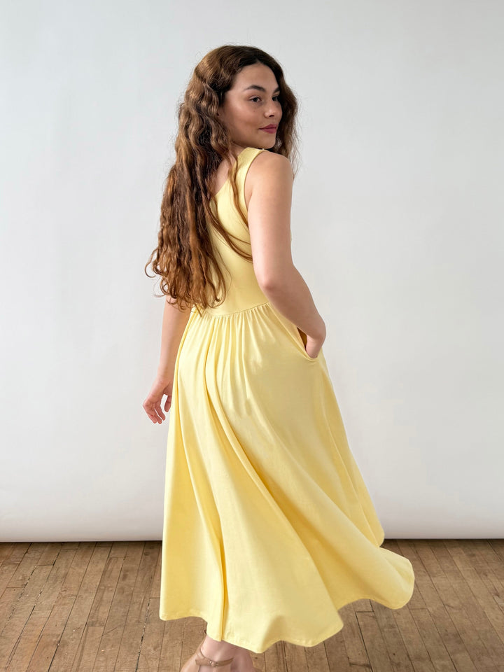 The Esther dress features a fitted lined bodice with elegant princess seams that flatter your silhouette. A gathered V-shaped waistband flows into a full skirt, creating a flattering and feminine silhouette. Side pockets are carefully positioned for convenience without added bulk, perfect for dressing up or down.