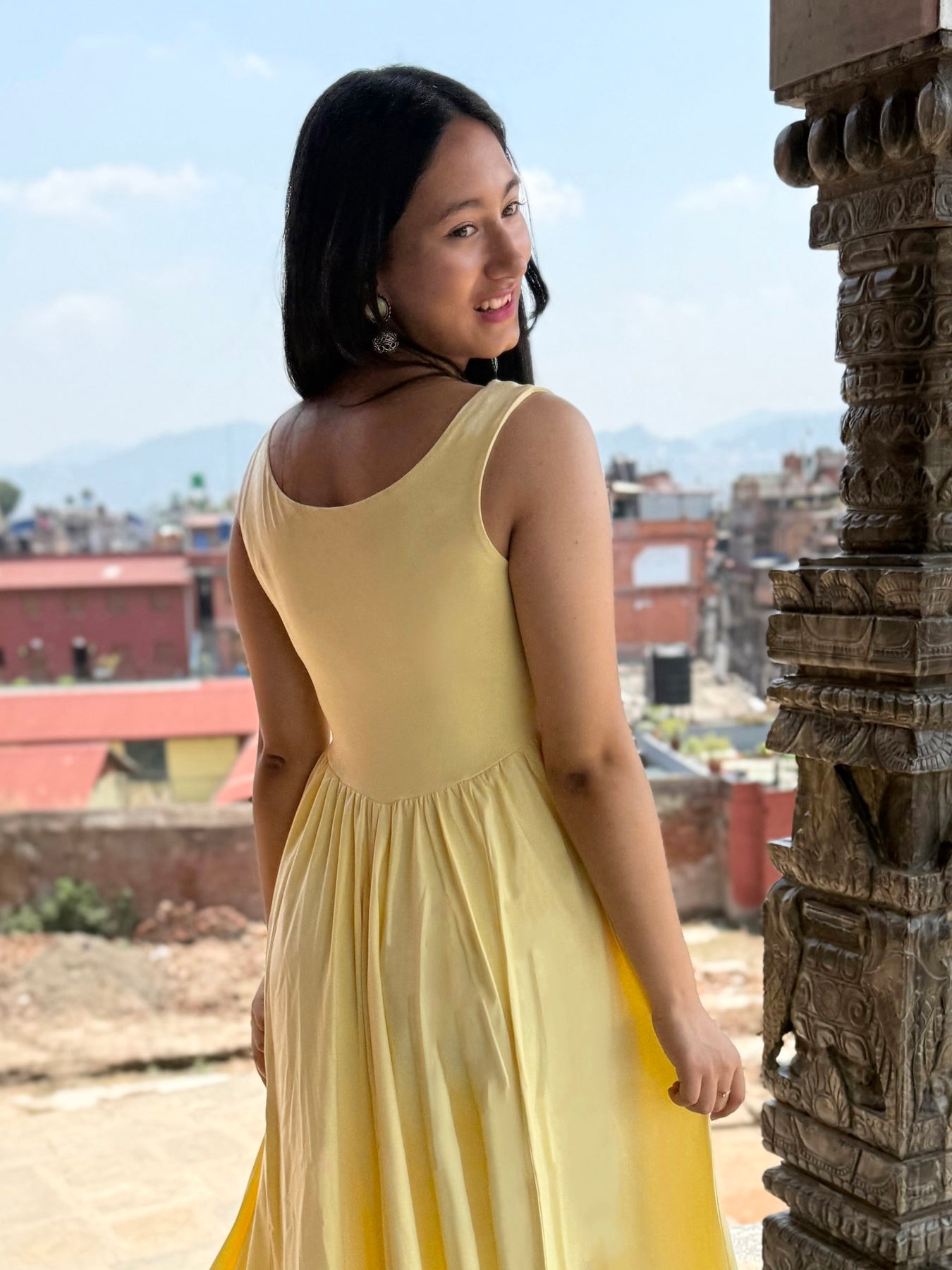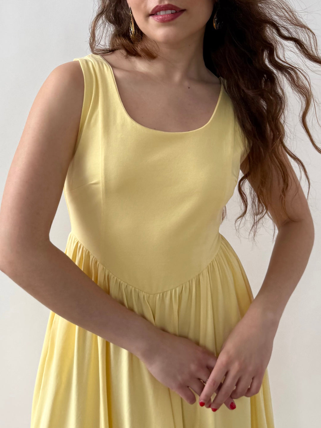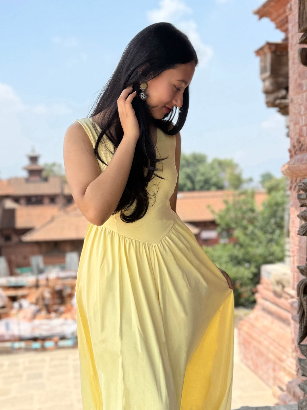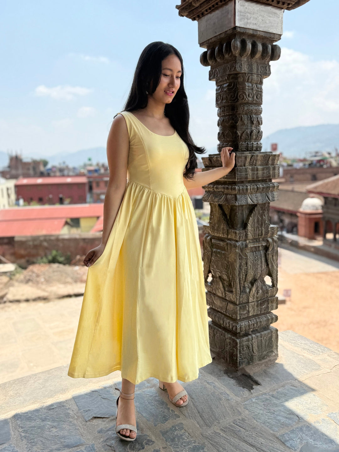 The Esther dress features a fitted lined bodice with elegant princess seams that flatter your silhouette. A gathered V-shaped waistband flows into a full skirt, creating a flattering and feminine silhouette. Side pockets are carefully positioned for convenience without added bulk, perfect for dressing up or down.