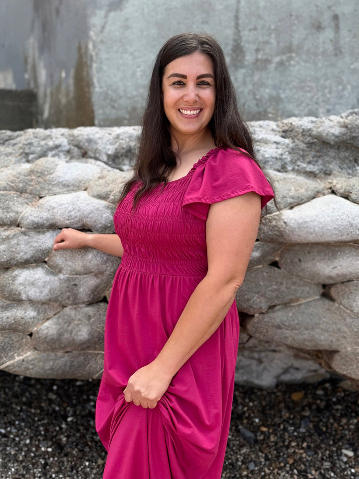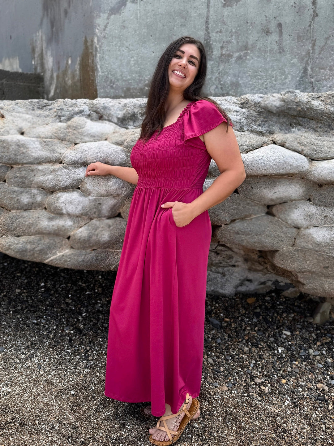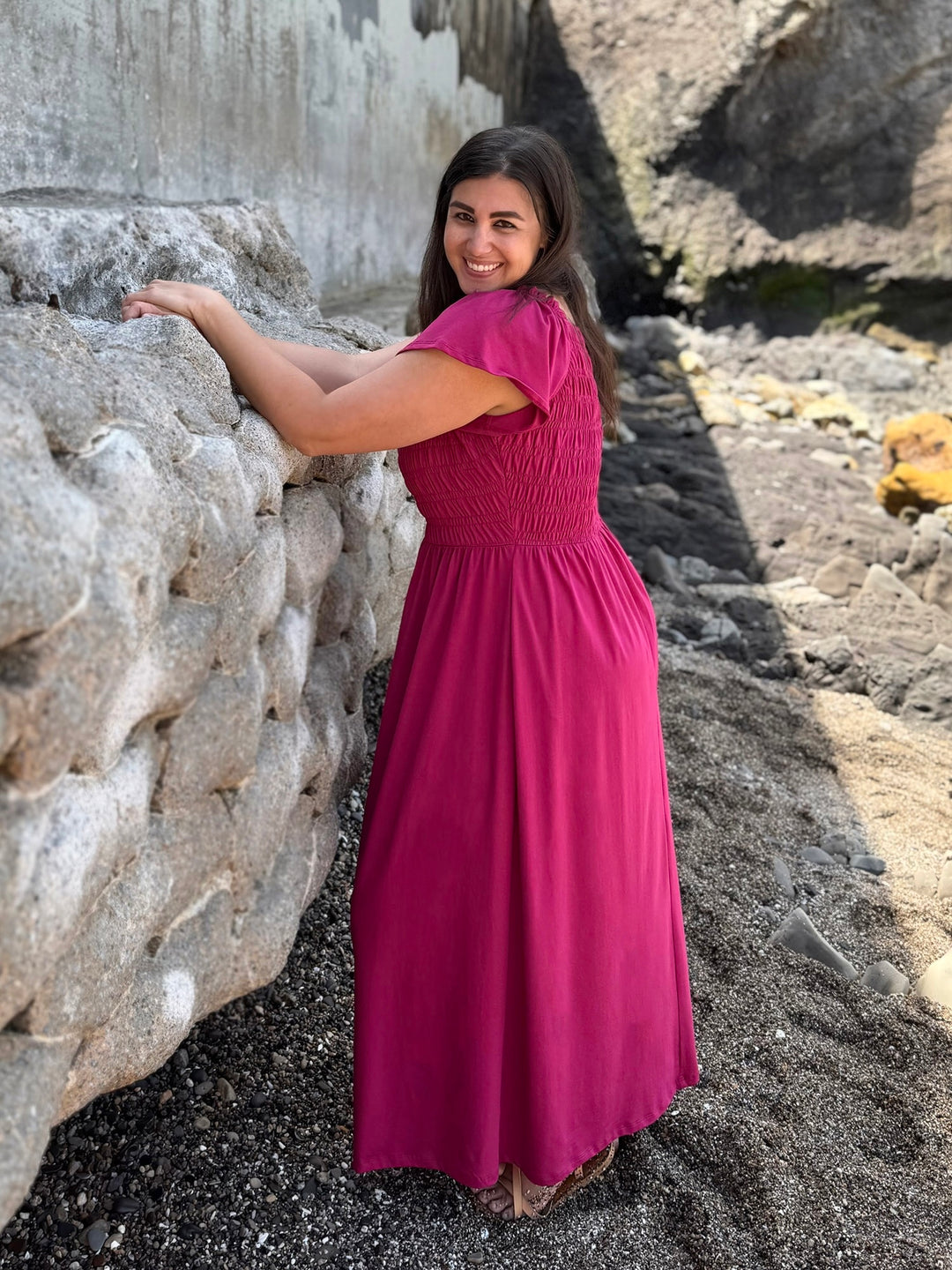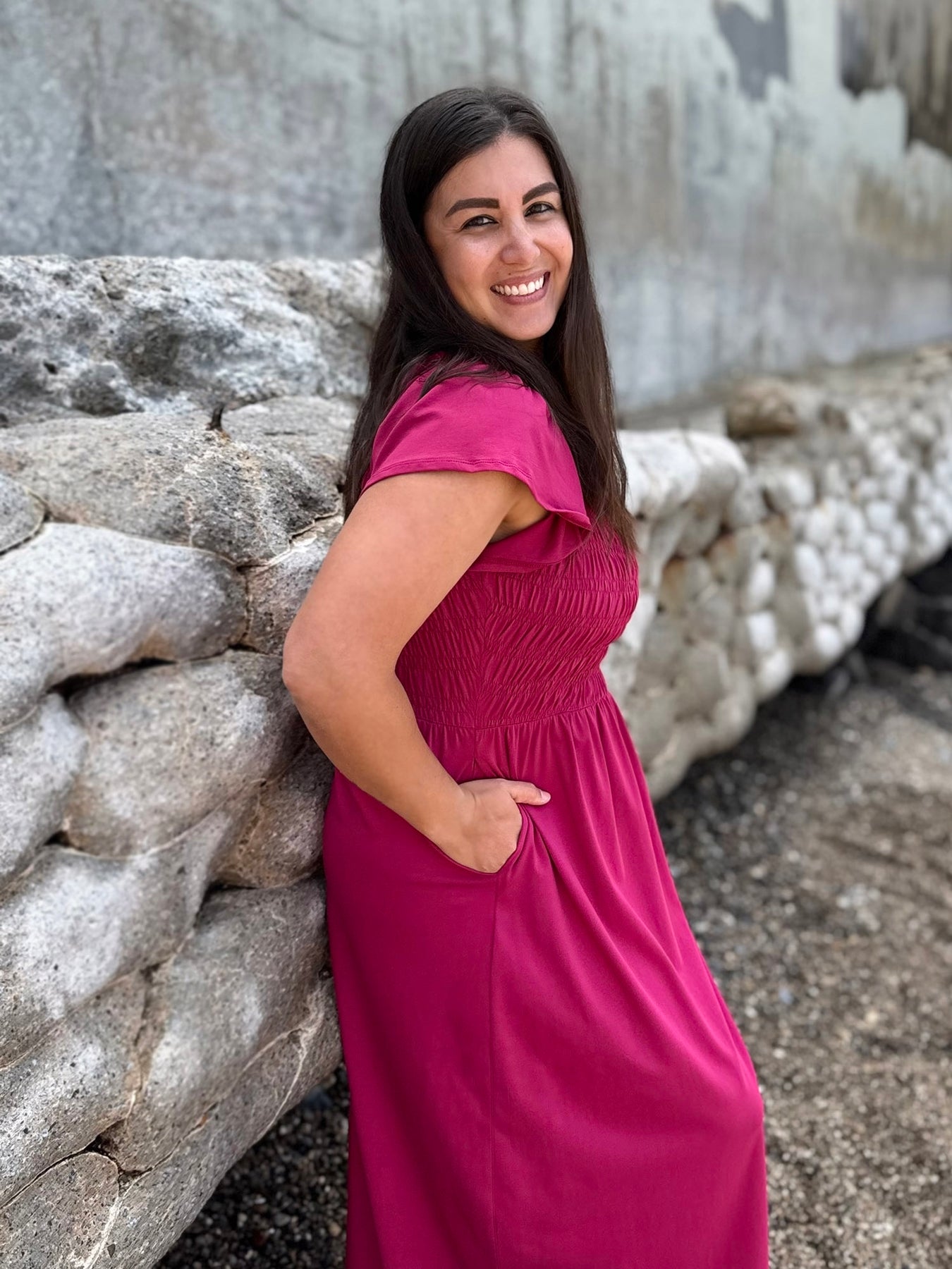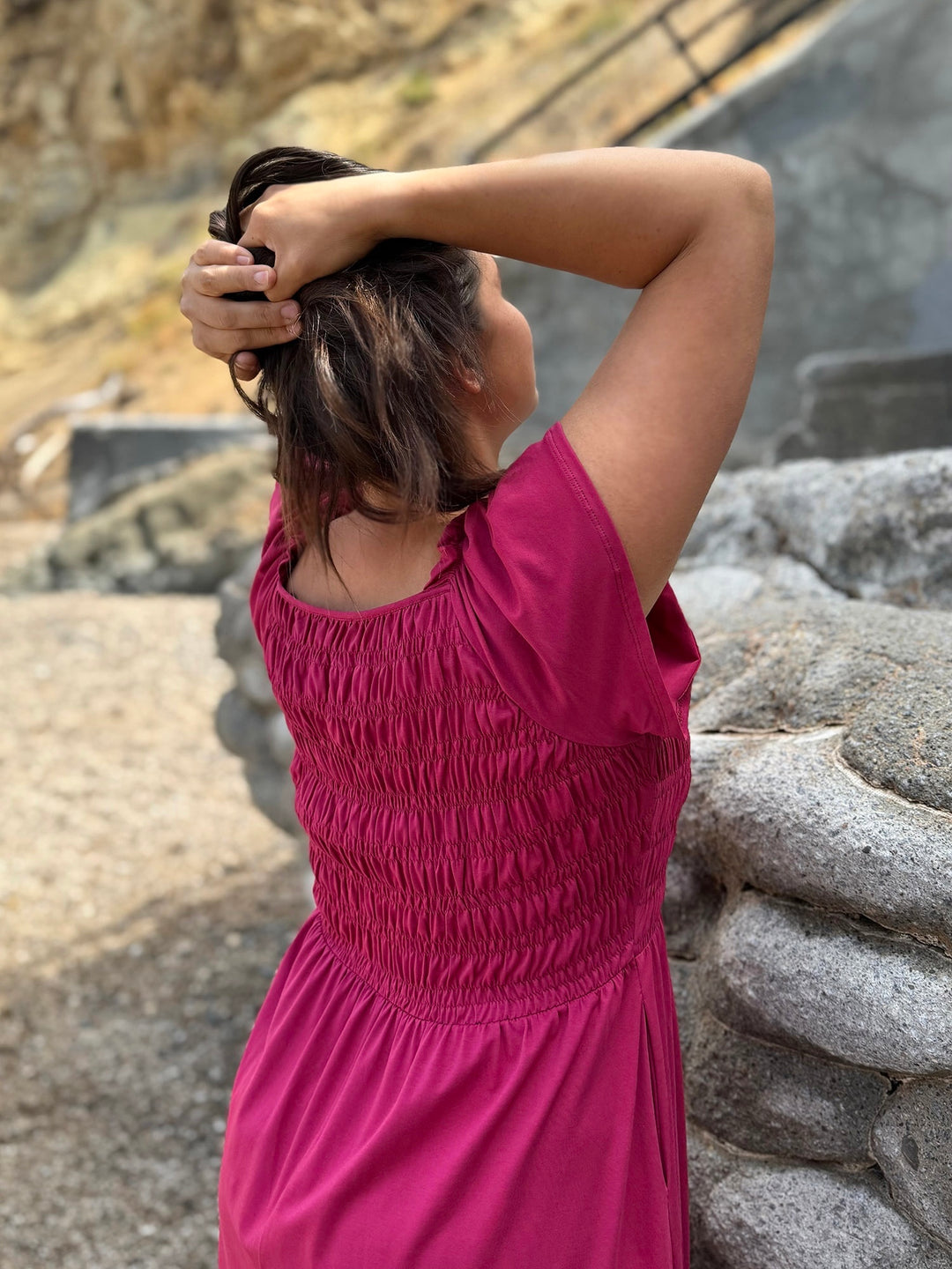 The smocking is completed by hand, and provides a texture that is forgiving to wear. Nursing friendly with stretchy shoulders. Completed to perfection with pockets. Length is about 52"