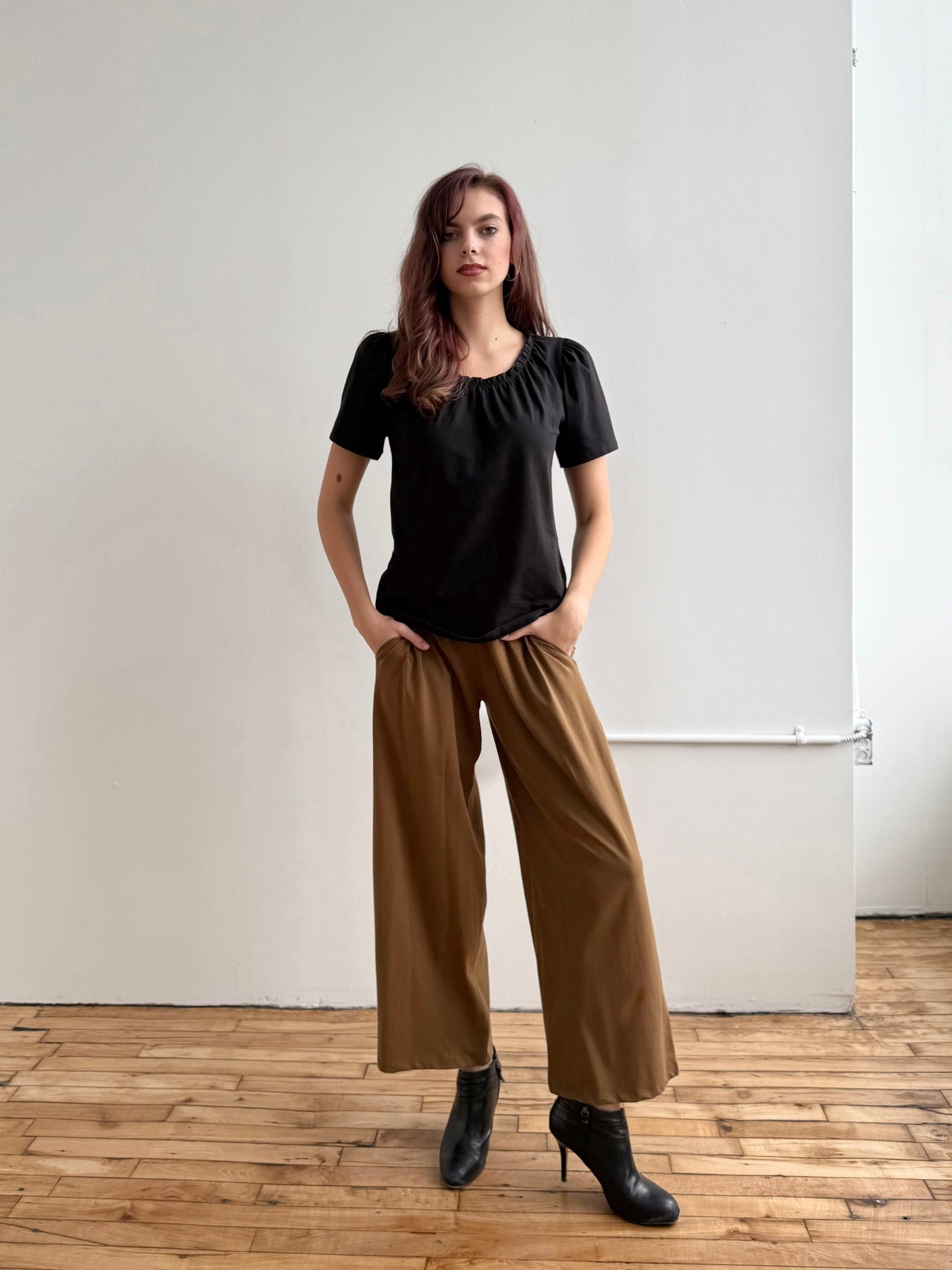 These high-rise pants feature a versatile wide-leg cut and pockets at the side seams. The 1" tall elastic waistband is stretchy, and there is ease through the hip and thigh. A flattering fit for all body types! The high quality lightweight cotton fabric makes these as soft as pajamas, and polished enough for the office.