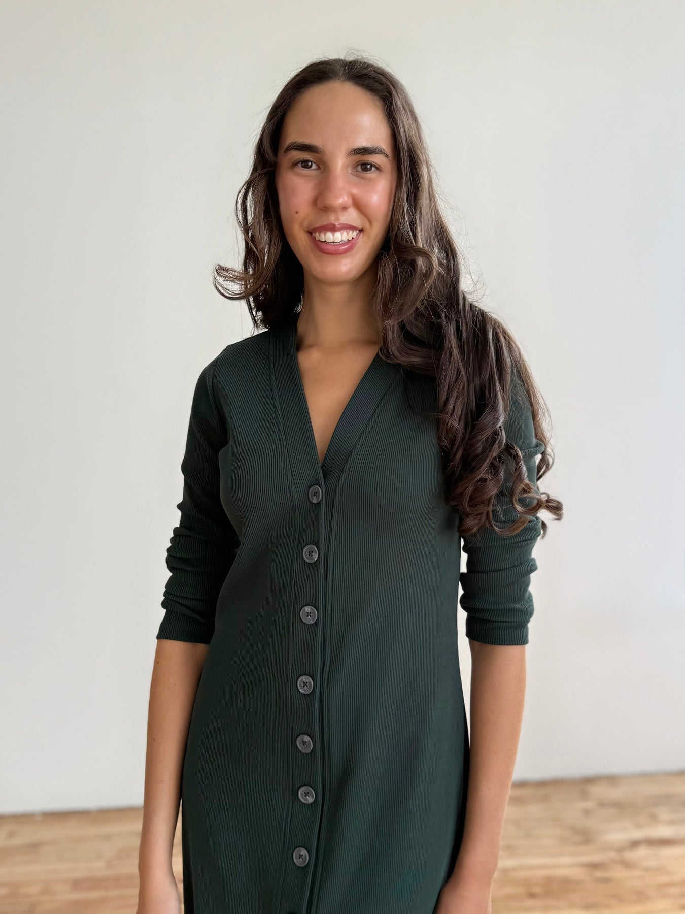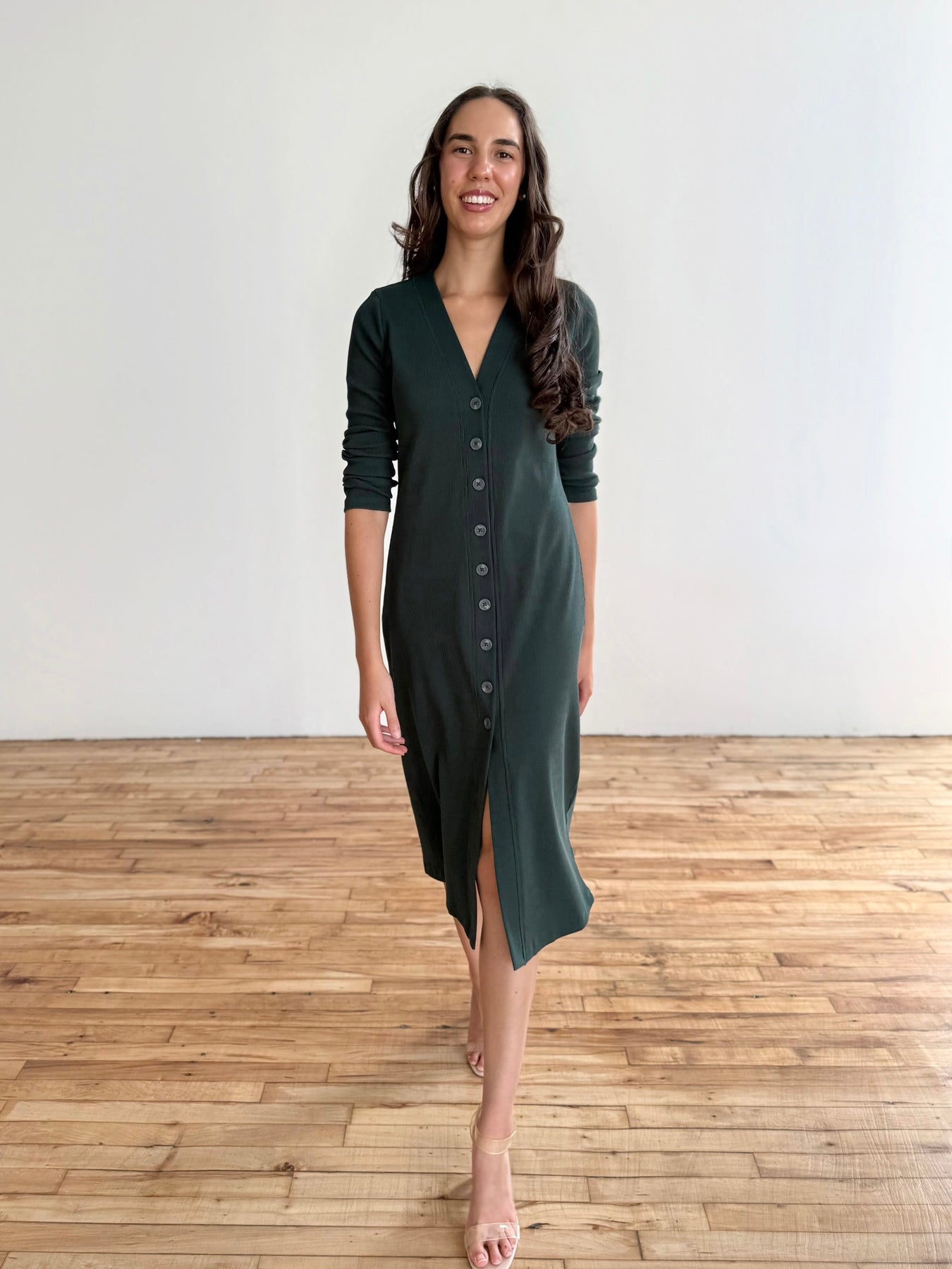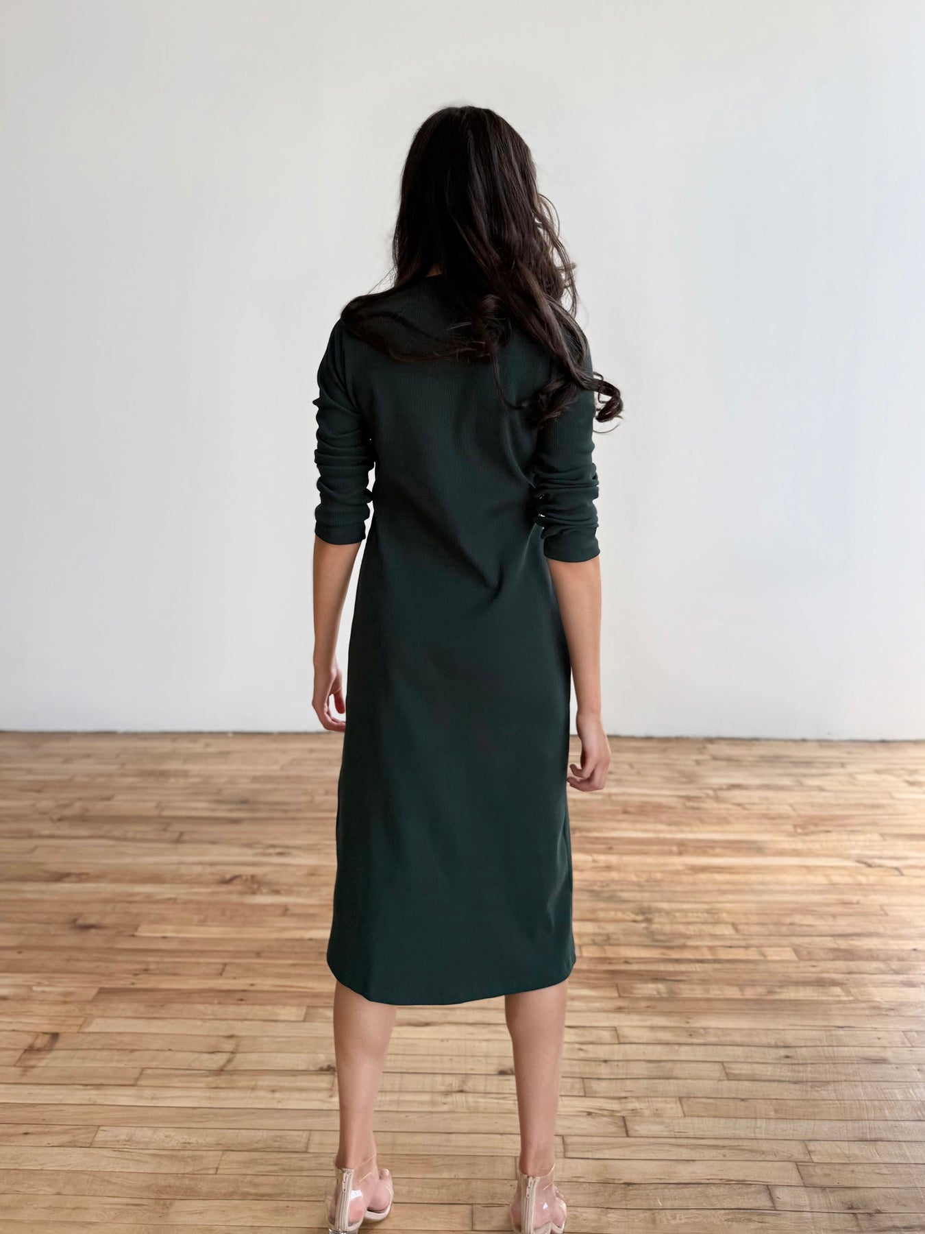 Elena is a dress in thick rib-knit fabric, with a boxy silhouette. With the contouring fabric, your curves can be accentuated! It can be fully buttoned for work, unbuttoned on the bottom for a slit-like effect with jeans, or worn completely open as a duster with jeans and the Kim tee. We chose shades that pair well with a lot of what’s already in your closet, making this the perfect dual-role item.