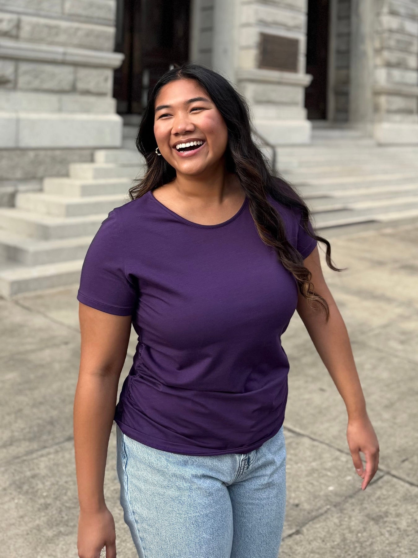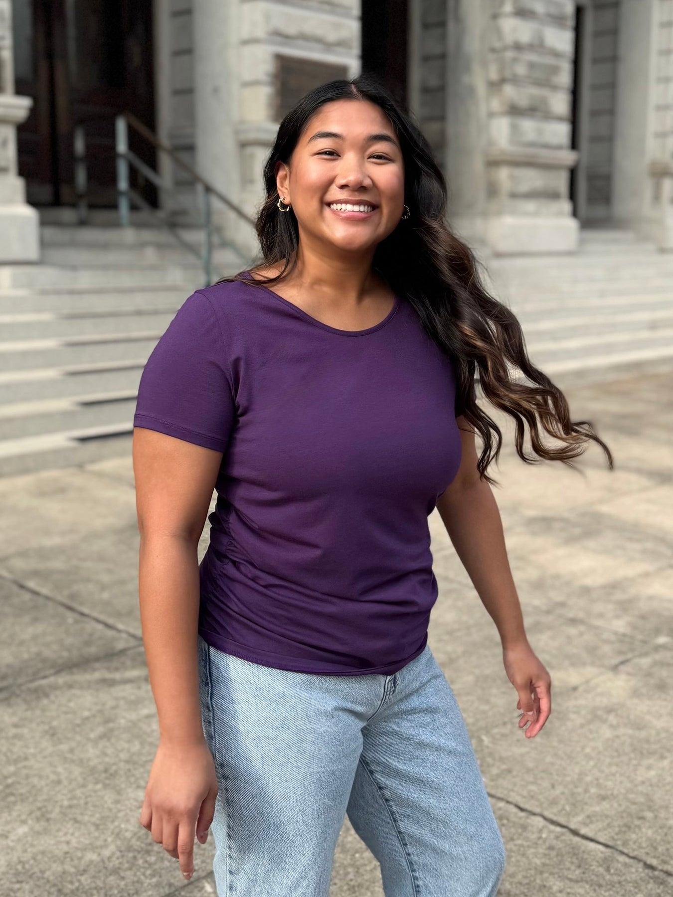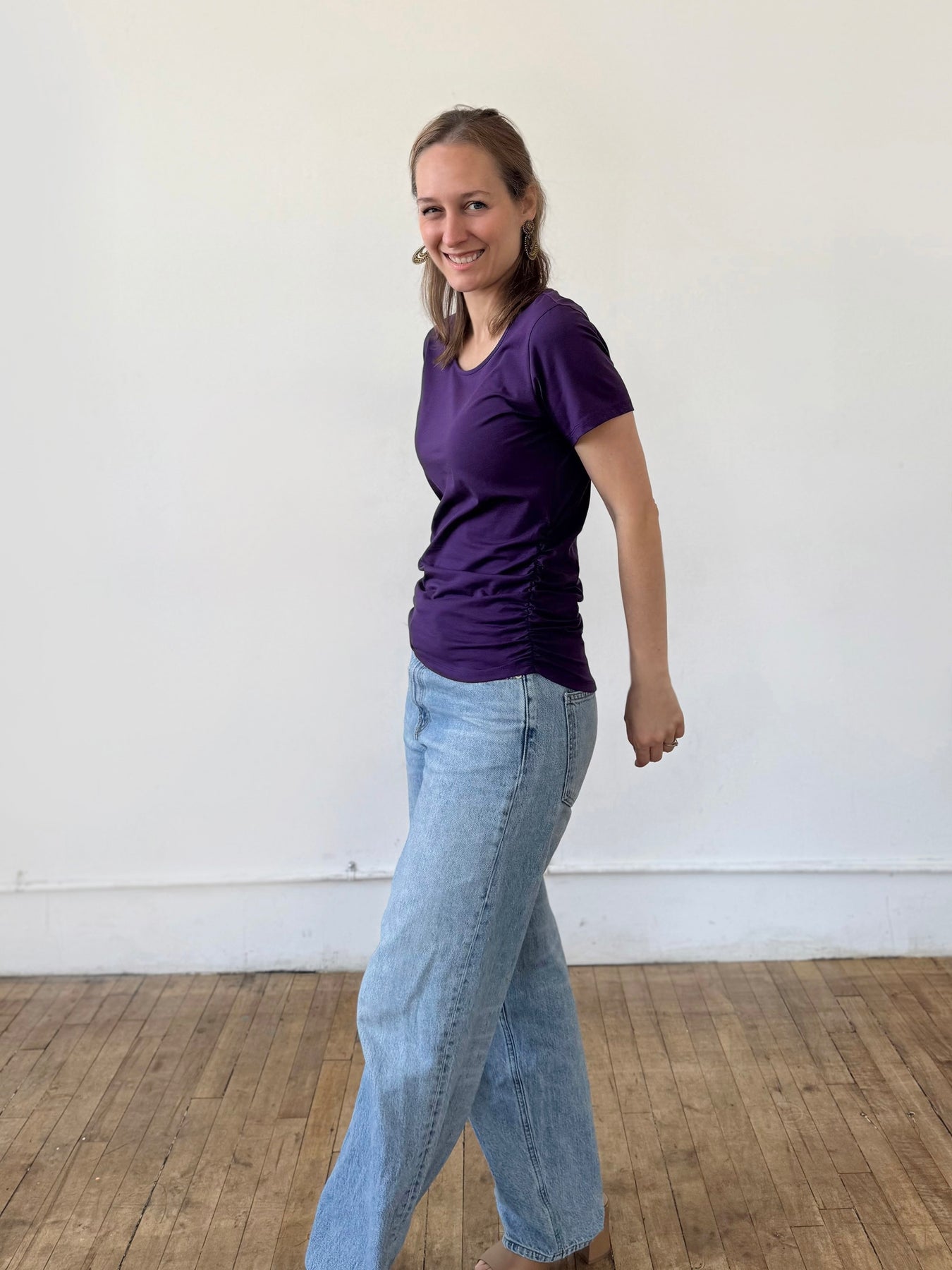 The Janey tee is an elevated basic you'll reach for over and over. It accentuates your figure, while the ruching beautifully masks the tummy. Elastic sewn into the side seams means they can stretch and stay in place, if you wish to tuck into bottoms.