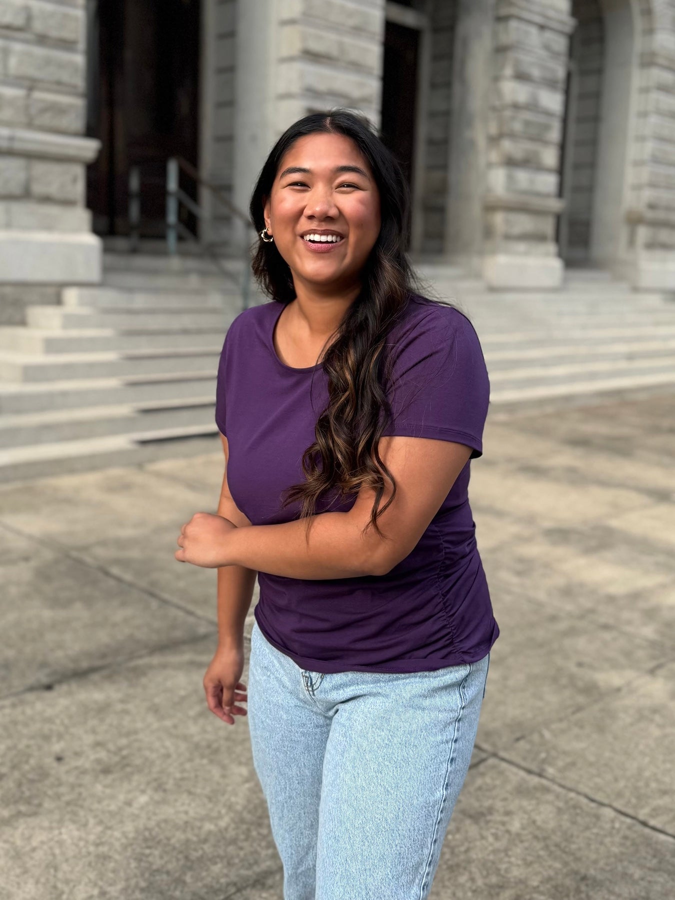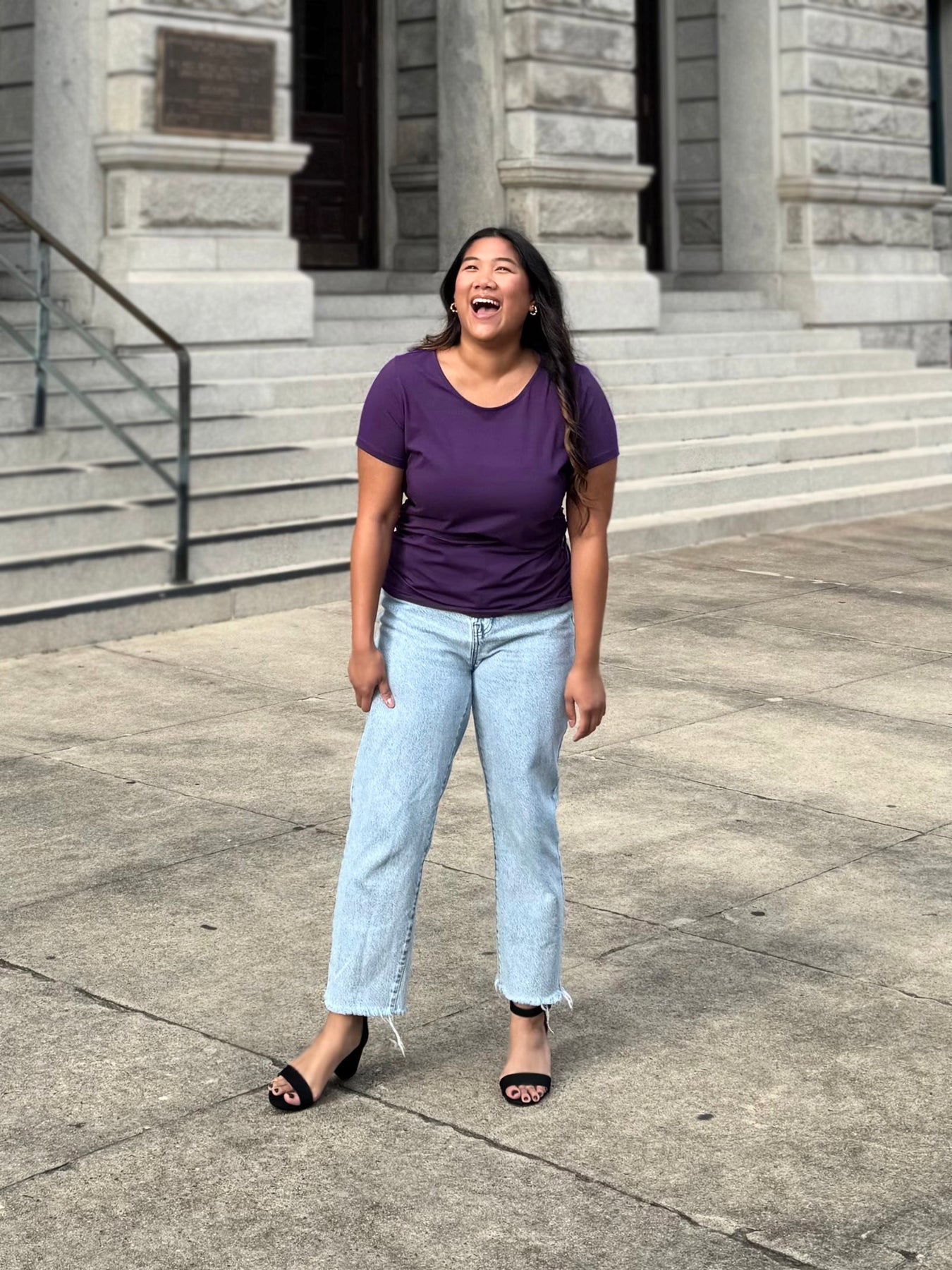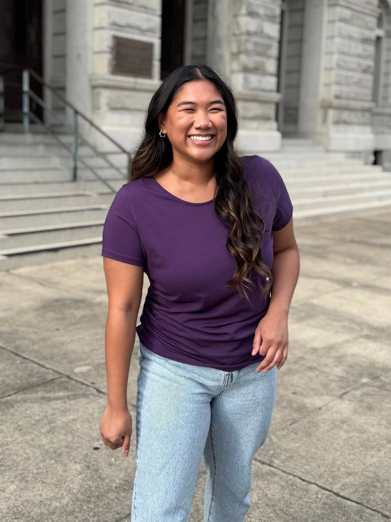 The Janey tee is an elevated basic you'll reach for over and over. It accentuates your figure, while the ruching beautifully masks the tummy. Elastic sewn into the side seams means they can stretch and stay in place, if you wish to tuck into bottoms.