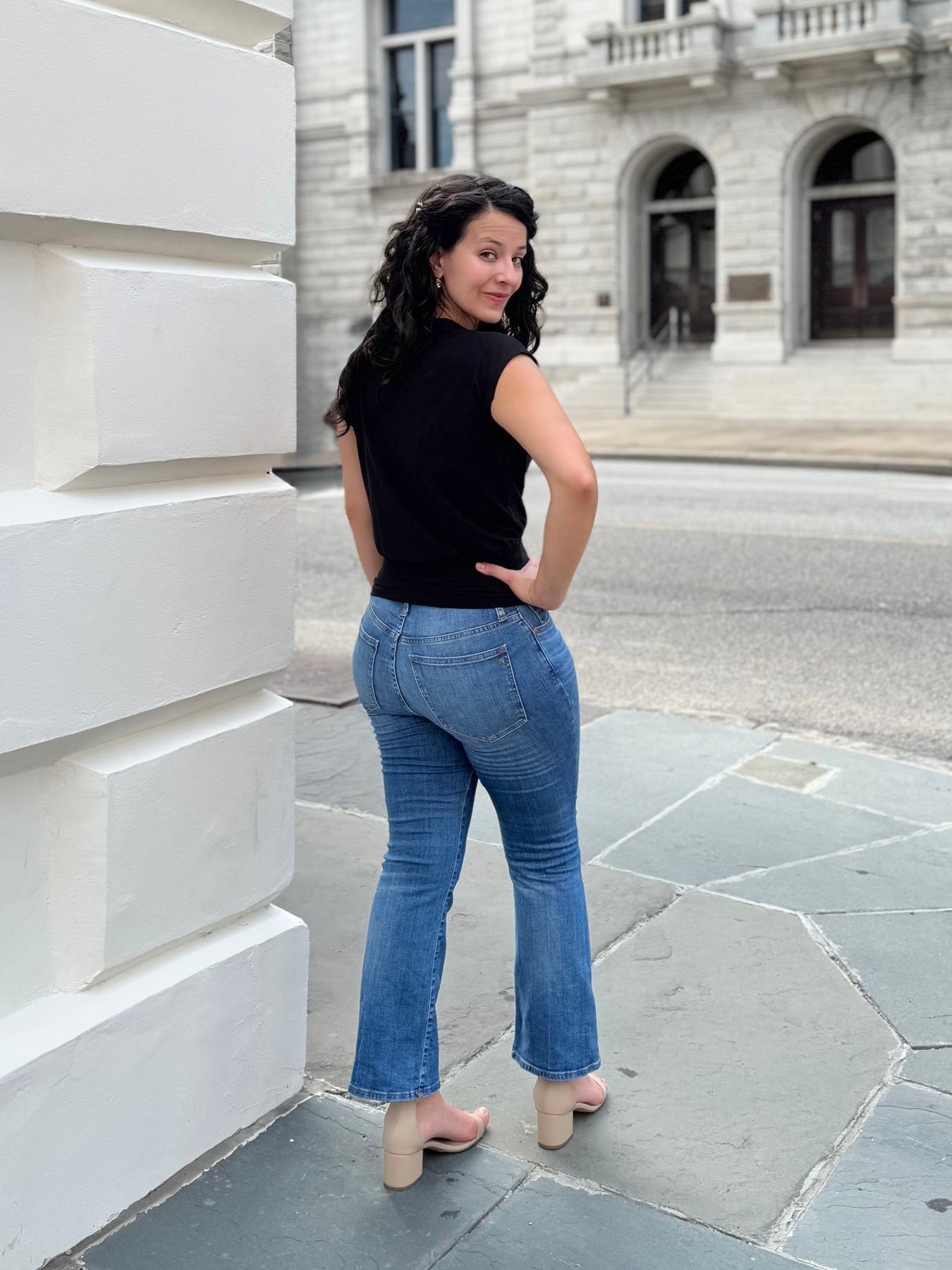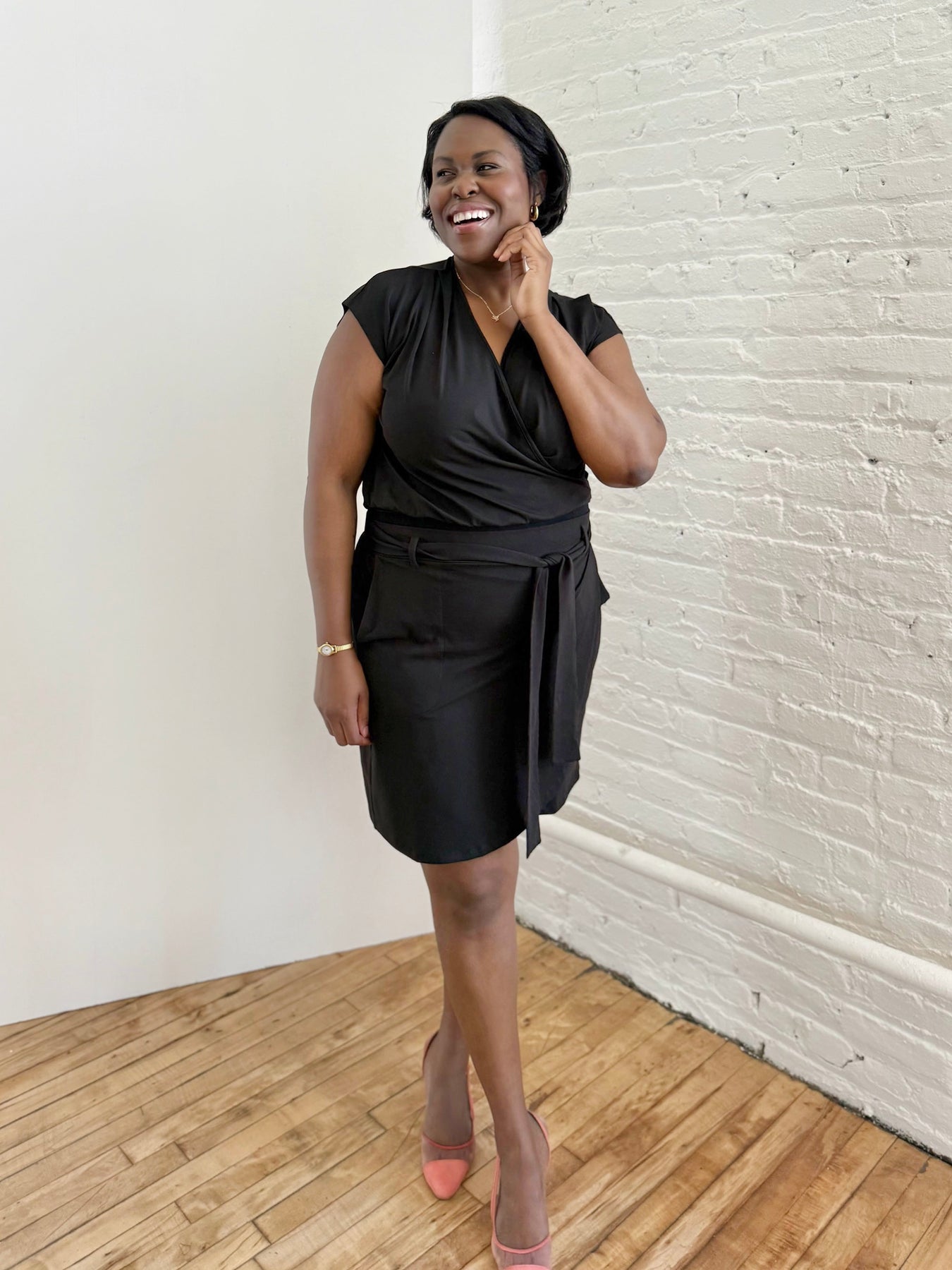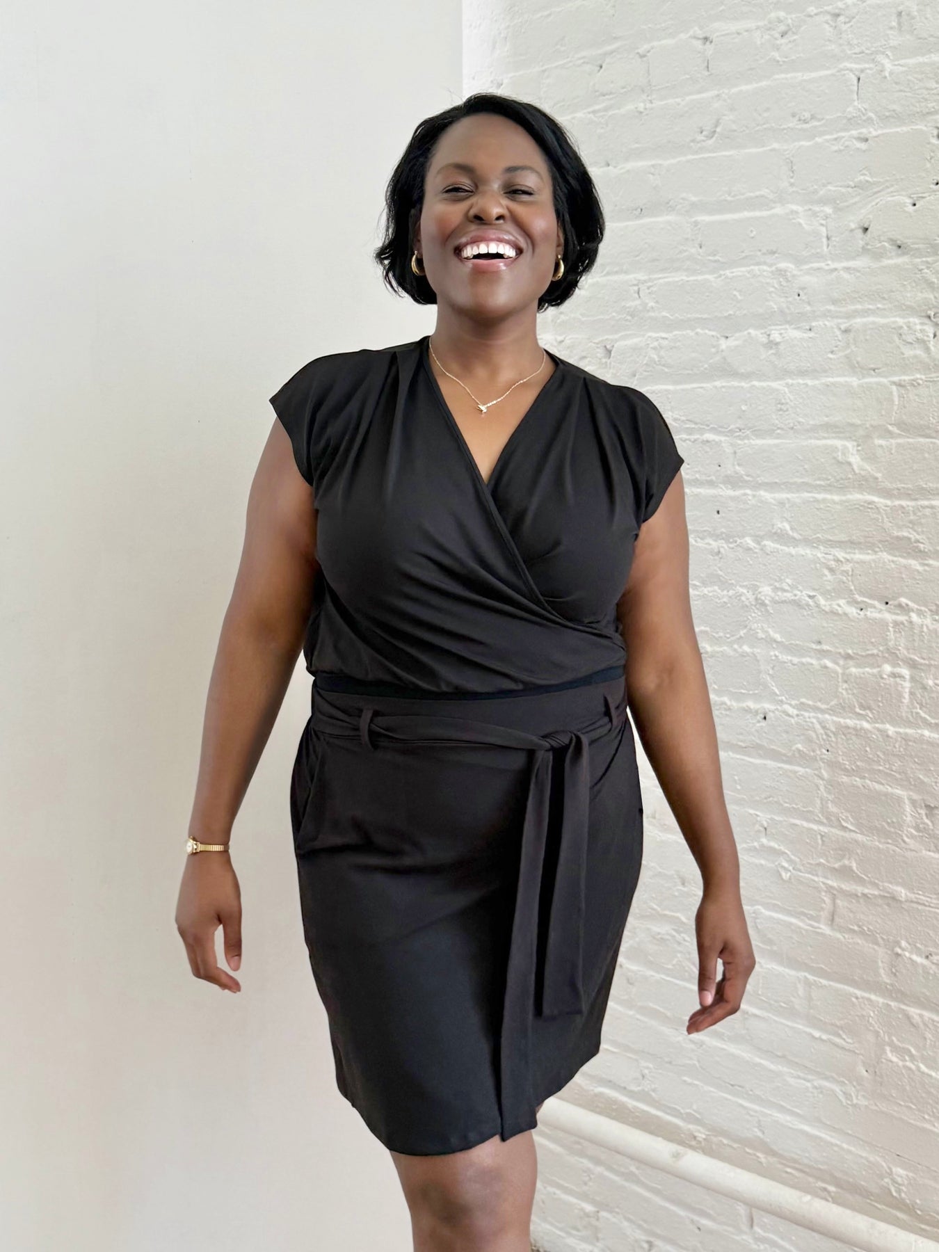 • Don't overthink it.  We have a low return rate overall because most designs are flattering in a size up or down. Our knit fabrics drape in all the right ways!