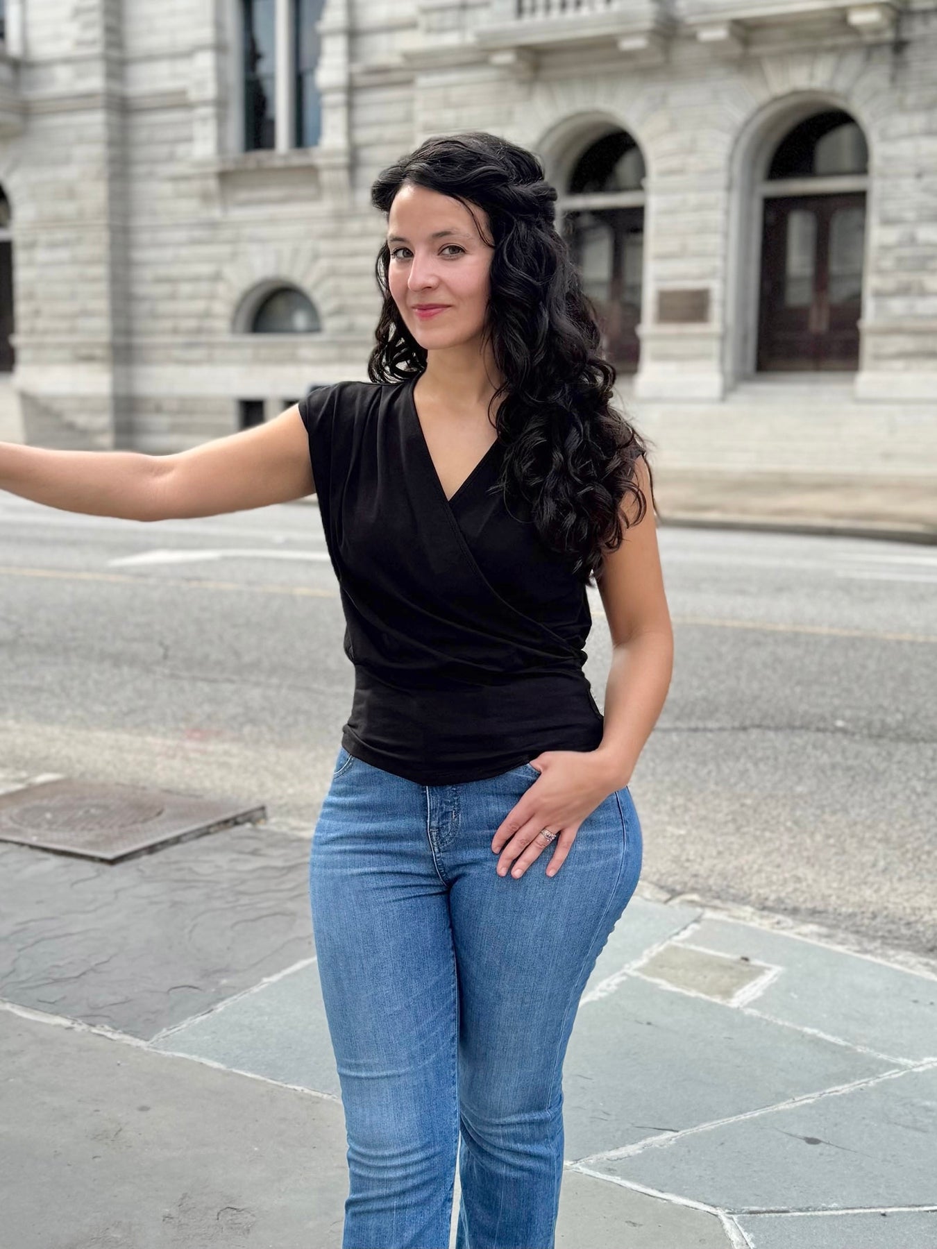 The Jolie has the look of a wrap top, but the ease of a pullover silhouette, making it a stylish and effortless choice.  The wide banded hem can adjust to sit higher or lower for your desired proportion. The armholes have the breezy feel of a sleeveless style, but with coverage. The wrap style makes it a great nursing-friendly option.