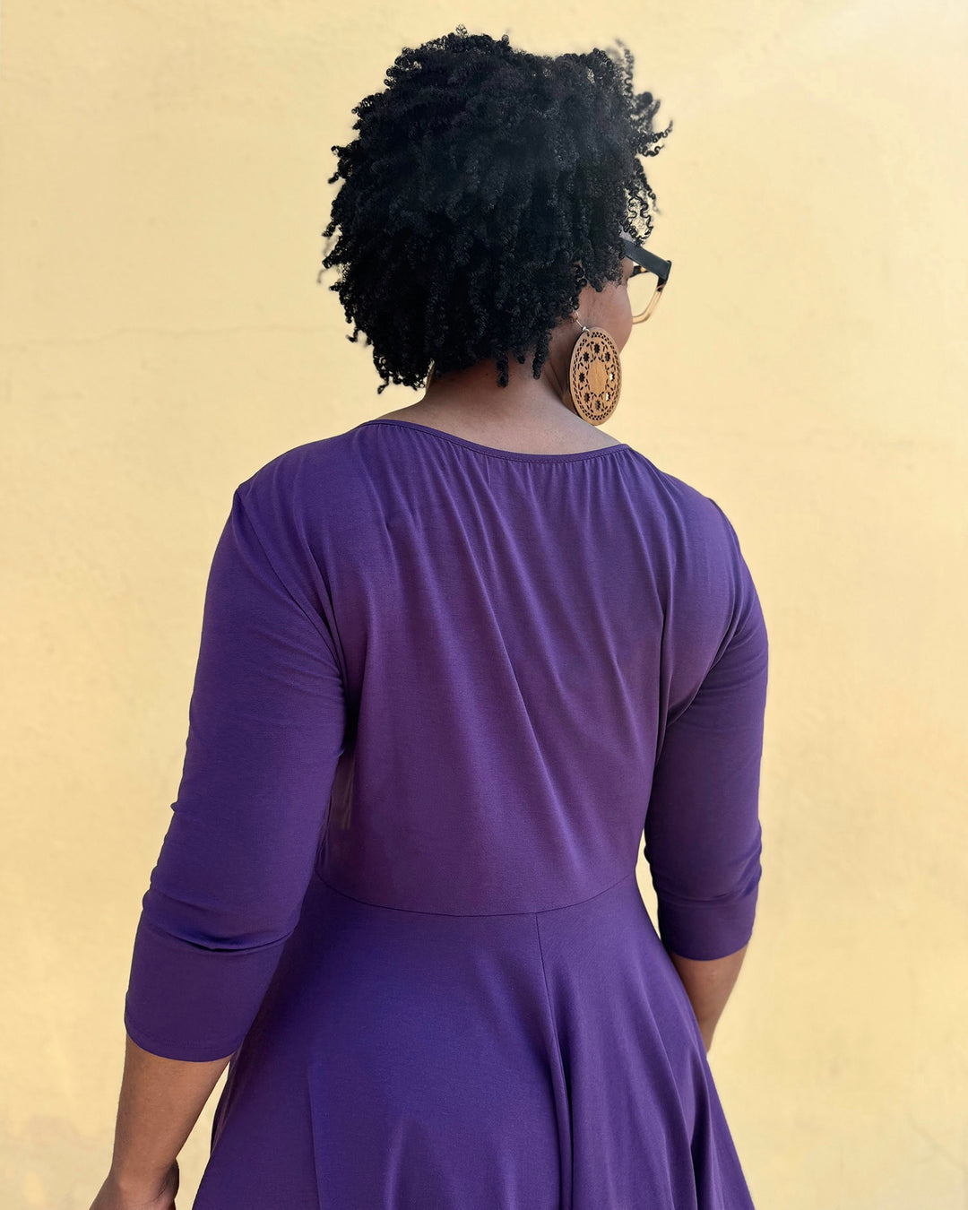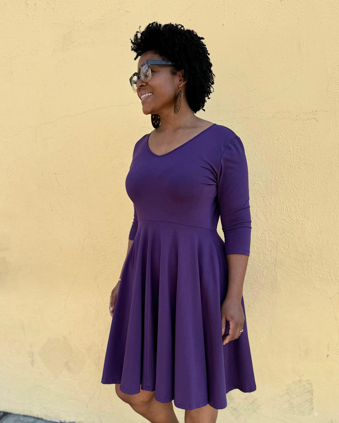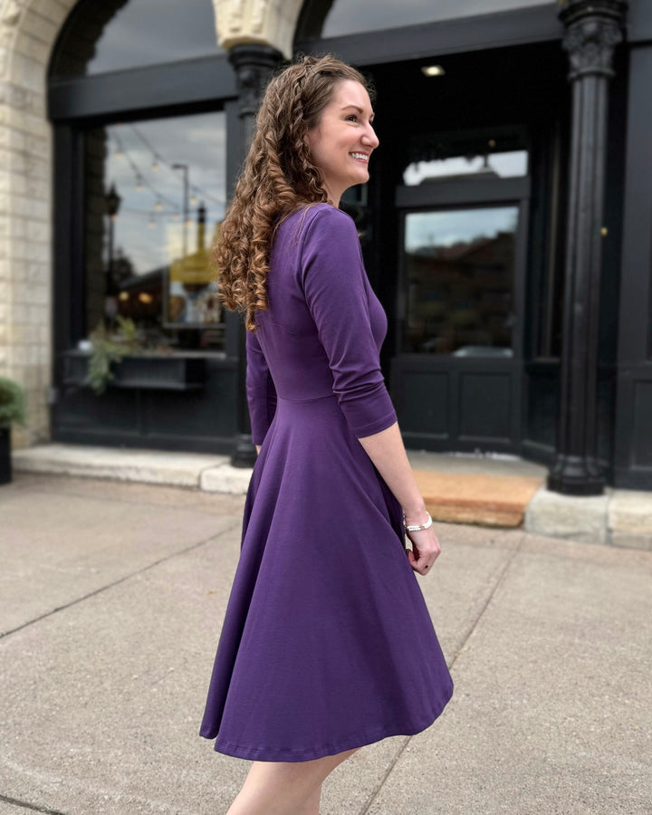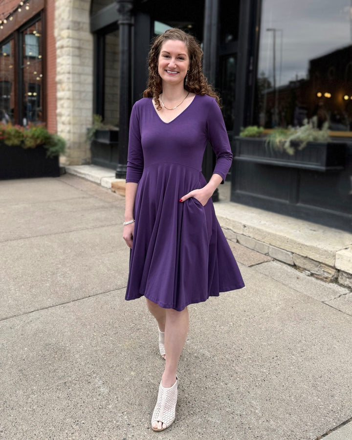 This twirly 4-panel dress is an elegant choice for any occasion. Enjoy hidden pockets in the side seams. Layer this season with these fitted 3/4 length sleeves under cardigans and sweaters.