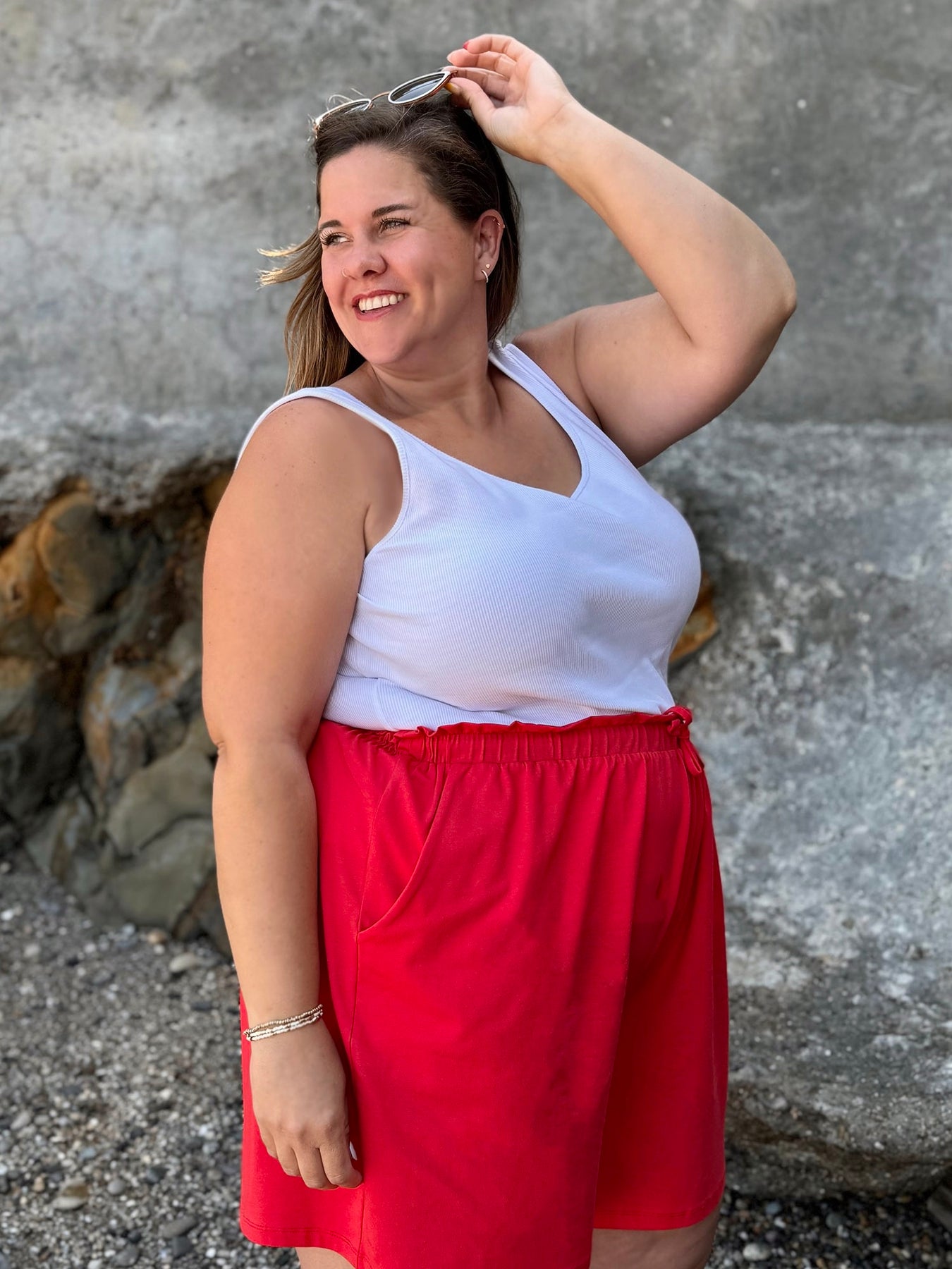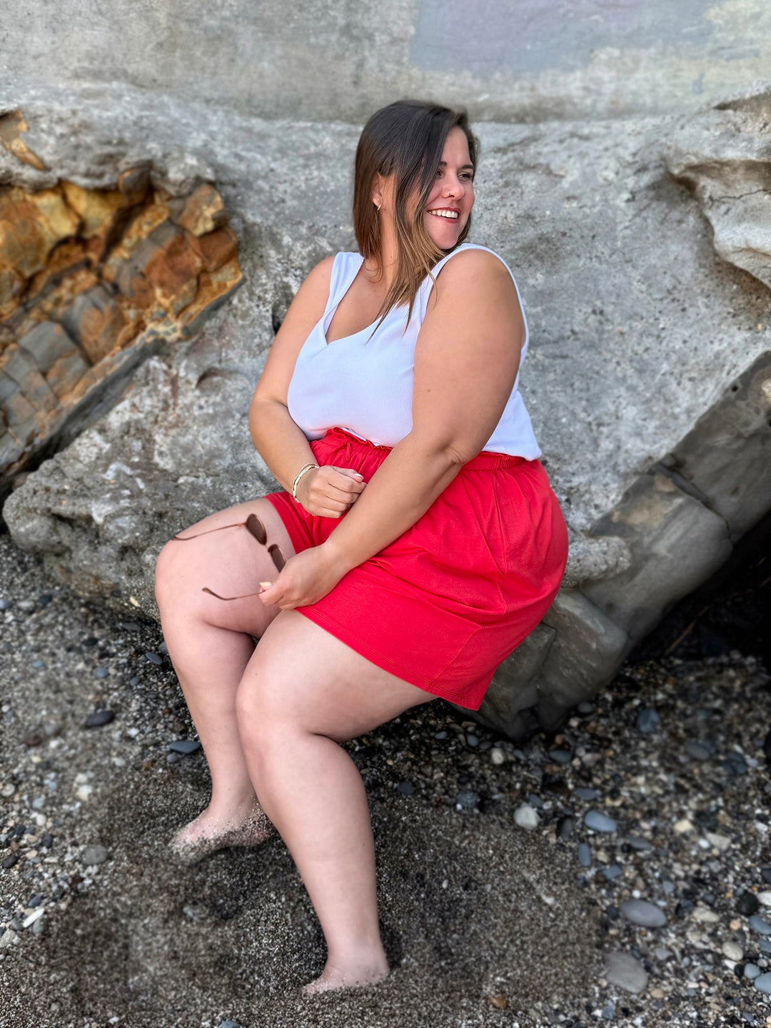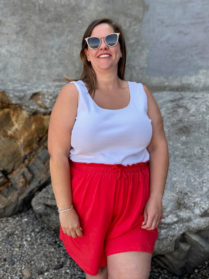 • Compared to the Jojo pants, the Malibu shorts are flowier than Jojo, and the rise is 2.75" longer.