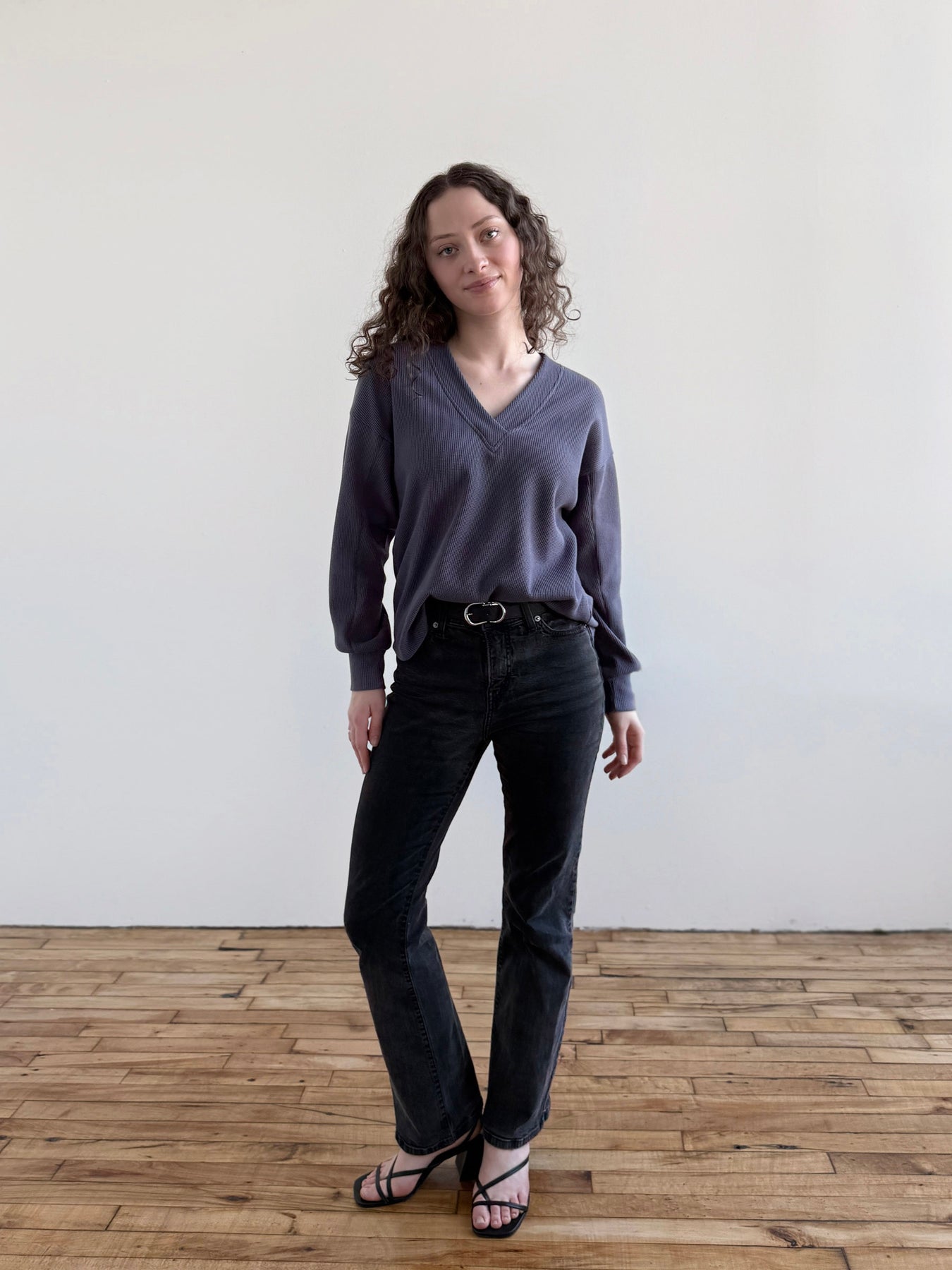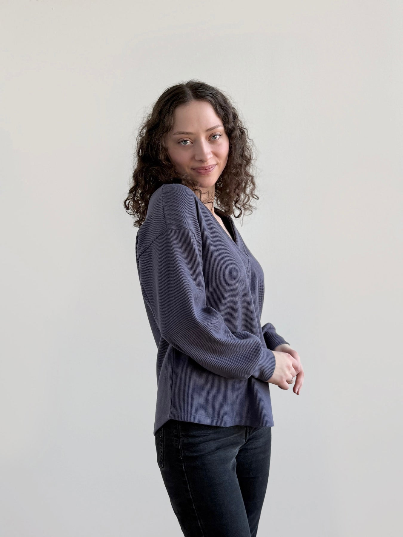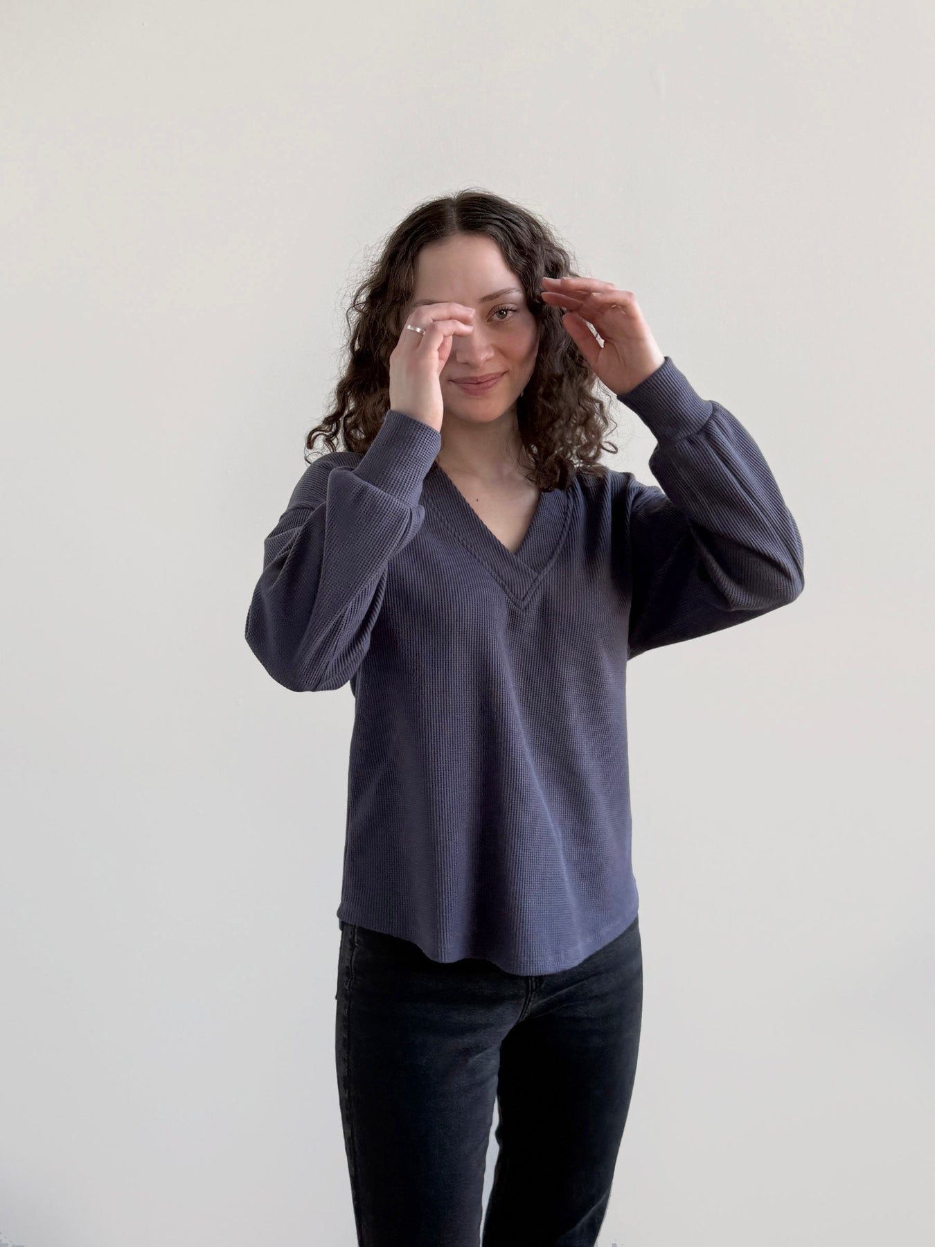 Megane is a waffle knit top that will be your cold-weather relaxed basic. The V-neckline is deeper so you can layer with a collared shirt in style. Delicate design details include a fitted sleeve cuff,  dropped shoulder, and curved hem.