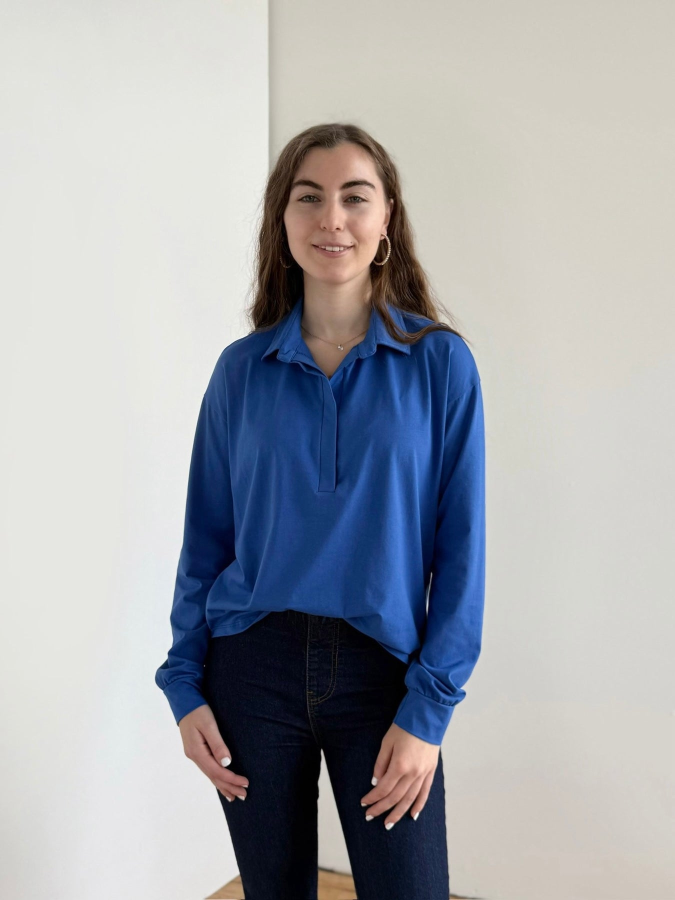 Meet the Micah jersey top—a piece designed to work as hard as you do. The boxy cut gives you room to move and breathe, while the buttery-soft cotton feels like a second skin. A thoughtful half placket collar and long sleeves with delicate feminine cuffs add polish without fuss. You'll reach for this top to support your day, whether you're working, creating, or simply being yourself.