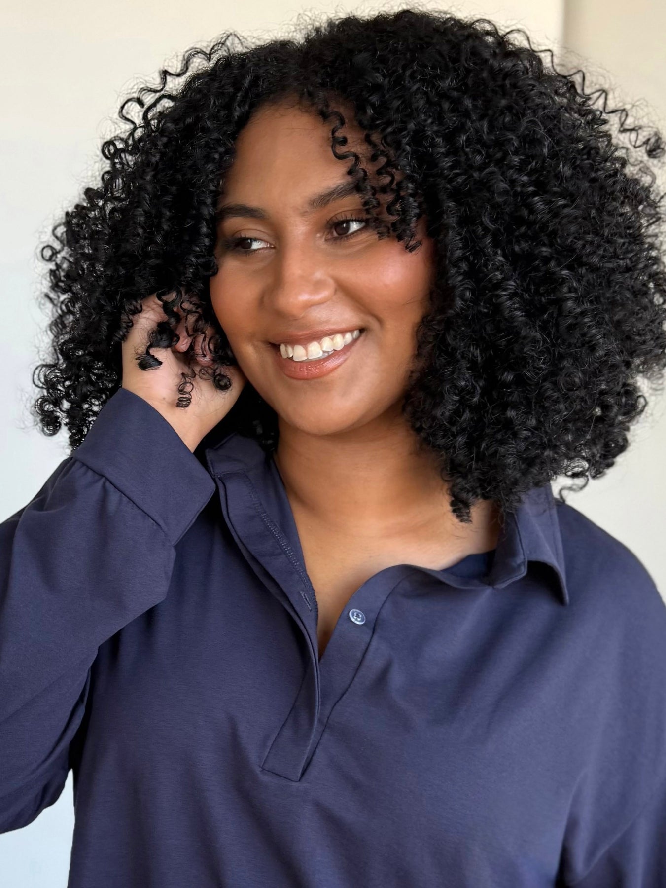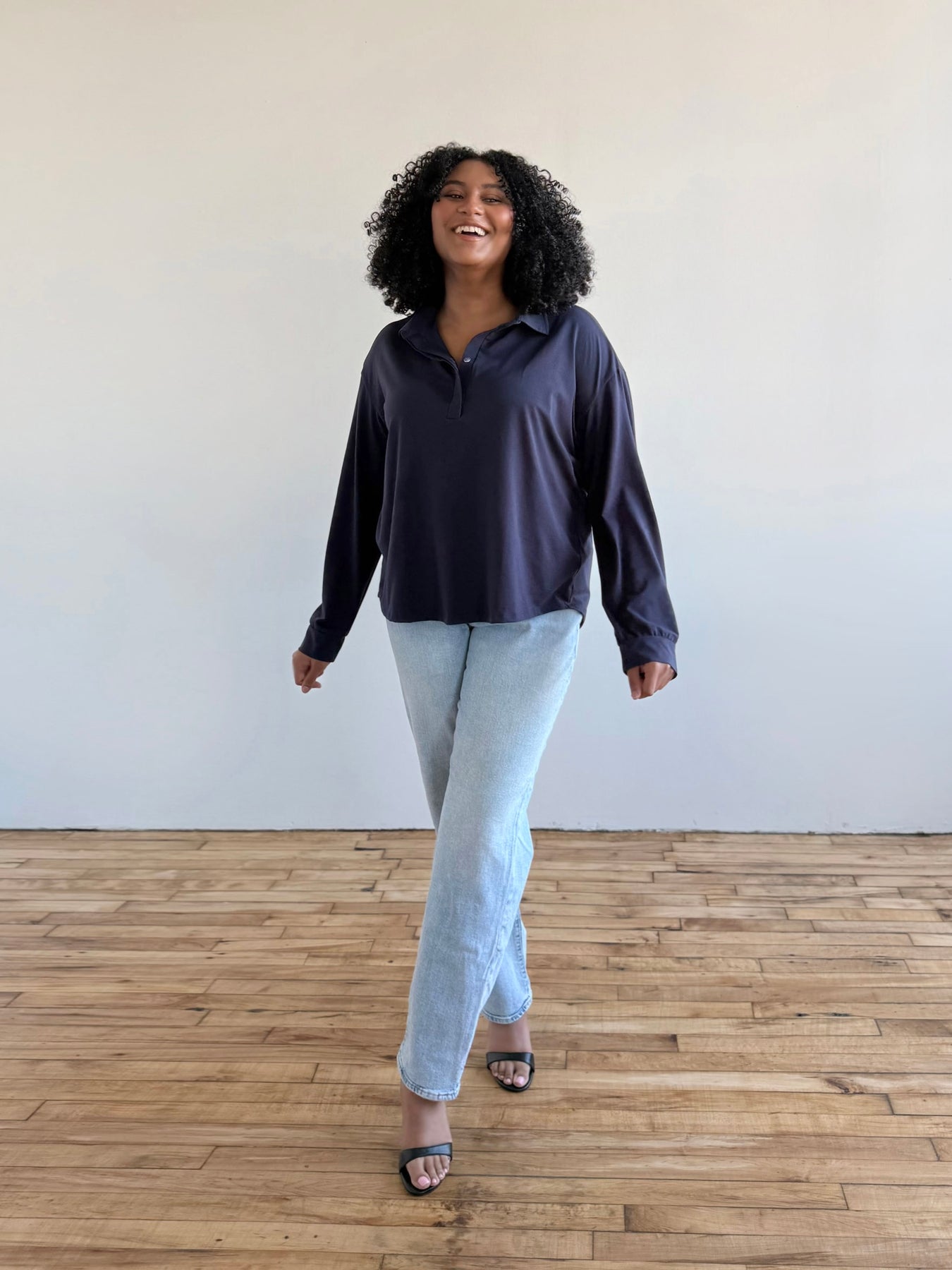 Meet the Micah jersey top—a piece designed to work as hard as you do. The boxy cut gives you room to move and breathe, while the buttery-soft cotton feels like a second skin. A thoughtful half placket collar and long sleeves with delicate feminine cuffs add polish without fuss. You'll reach for this top to support your day, whether you're working, creating, or simply being yourself.