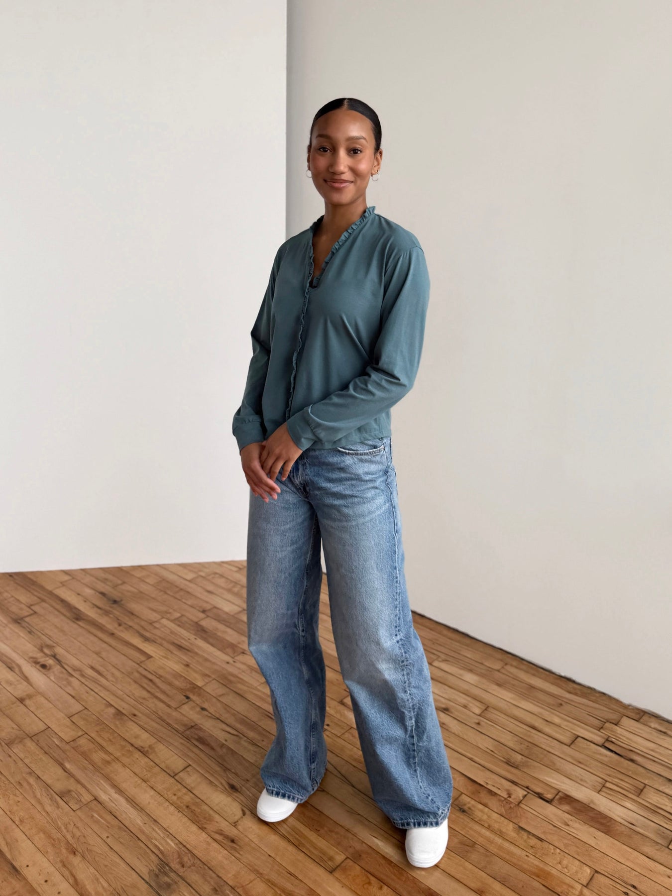 The Pietra top is a wardrobe essential to bring joy to your daily rotation. Delicate ruffles frame the neckline and cascade down the center front to transform a simple tee into something special. Crafted from soft jersey fabric, it's perfect for dressing up casual moments or layering under your favorite pieces.