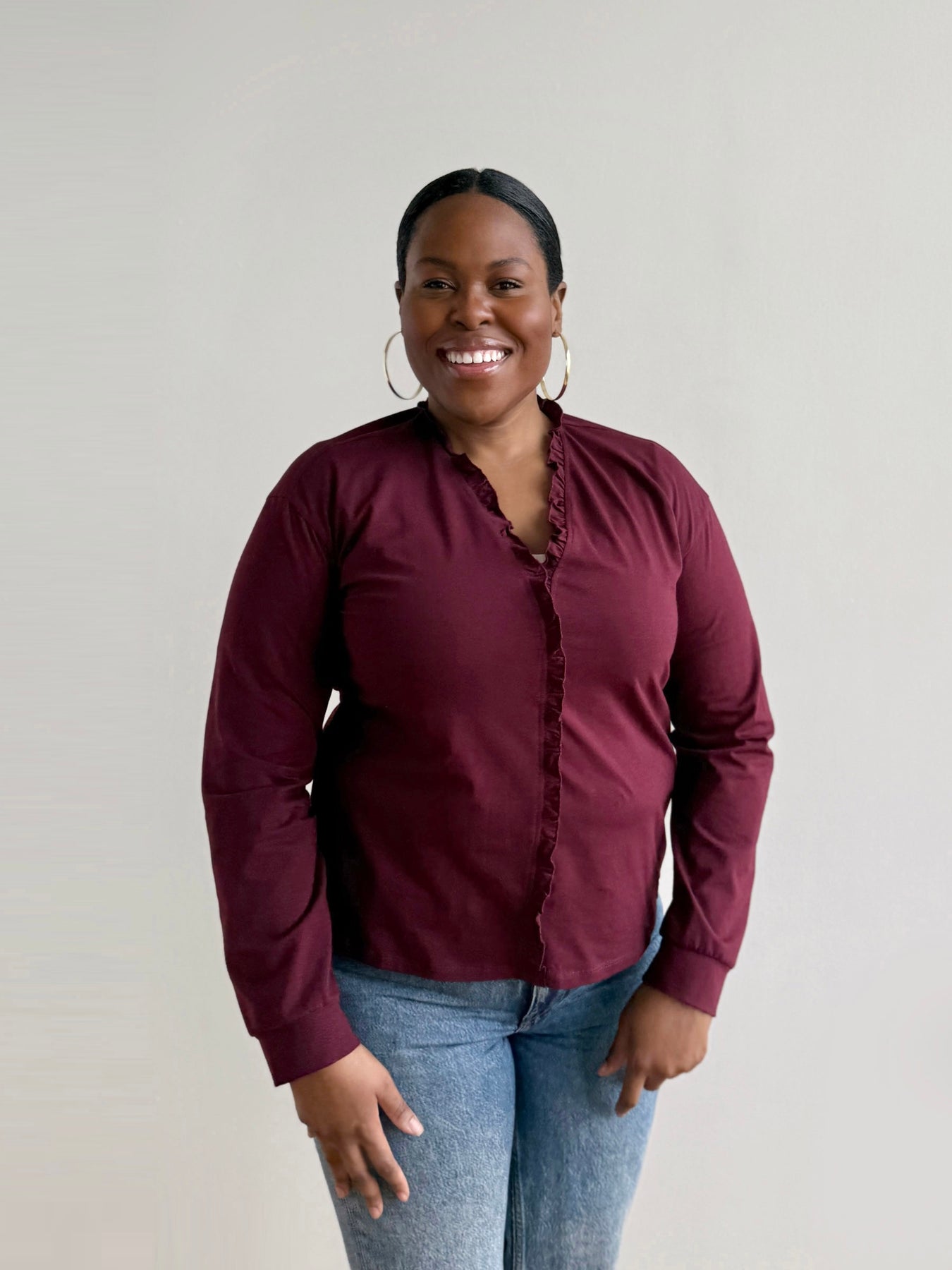 The Pietra top is a wardrobe essential to bring joy to your daily rotation. Delicate ruffles frame the neckline and cascade down the center front to transform a simple tee into something special. Crafted from soft jersey fabric, it's perfect for dressing up casual moments or layering under your favorite pieces.