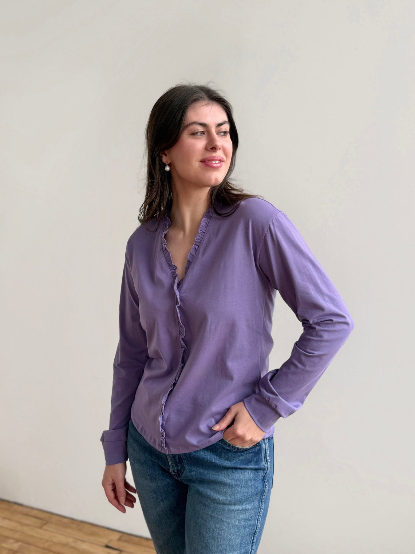 The Pietra top is a wardrobe essential to bring joy to your daily rotation. Delicate ruffles frame the neckline and cascade down the center front to transform a simple tee into something special. Crafted from soft jersey fabric, it's perfect for dressing up casual moments or layering under your favorite pieces.