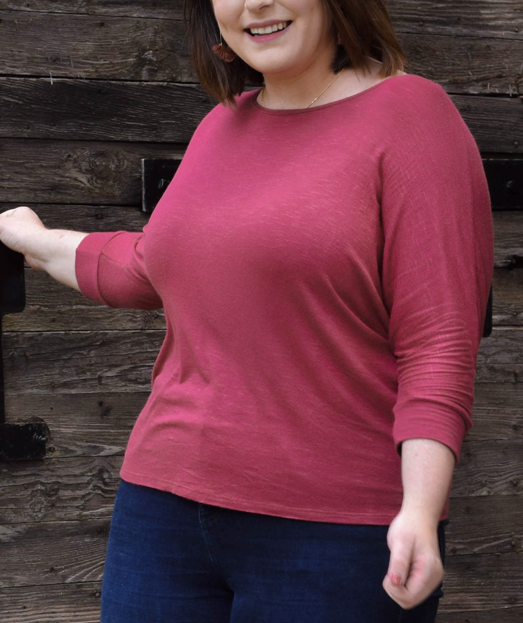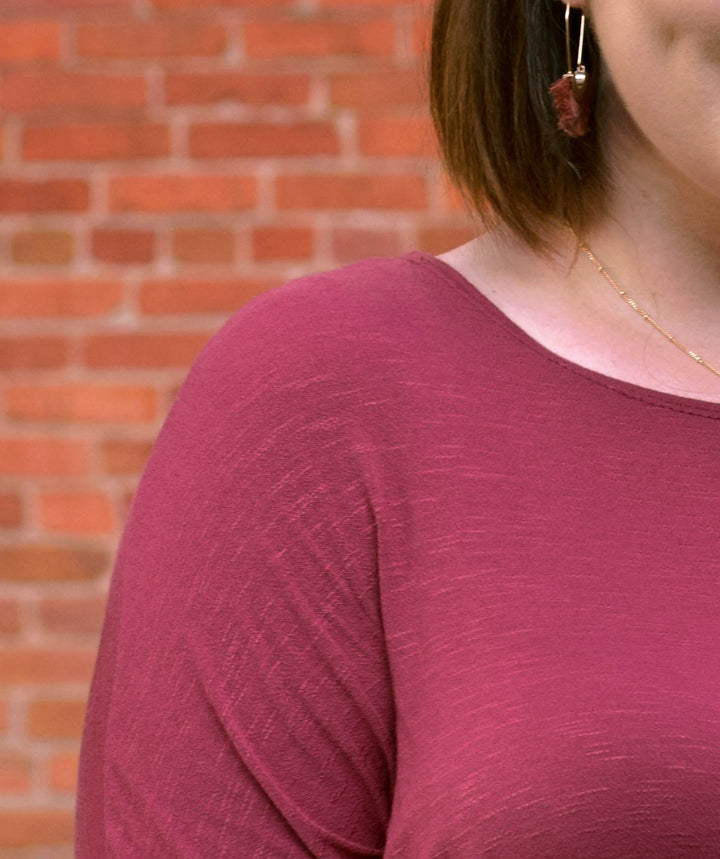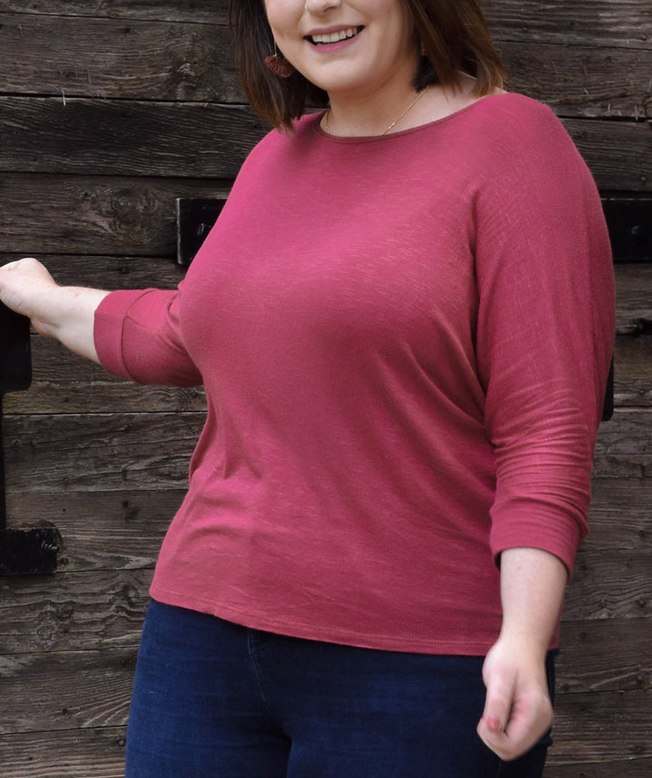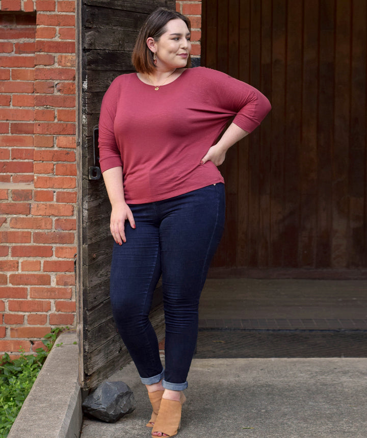 • Don't overthink it.  We have a low return rate overall because most designs are flattering in a size up or down. Our knit fabrics drape in all the right ways!