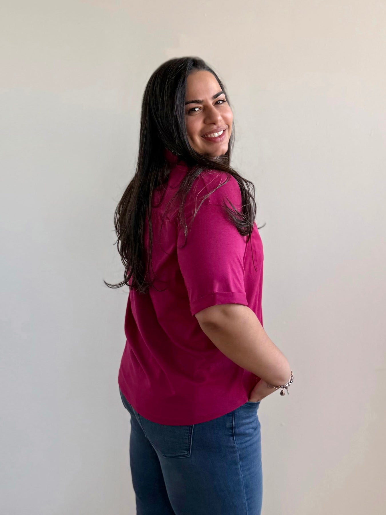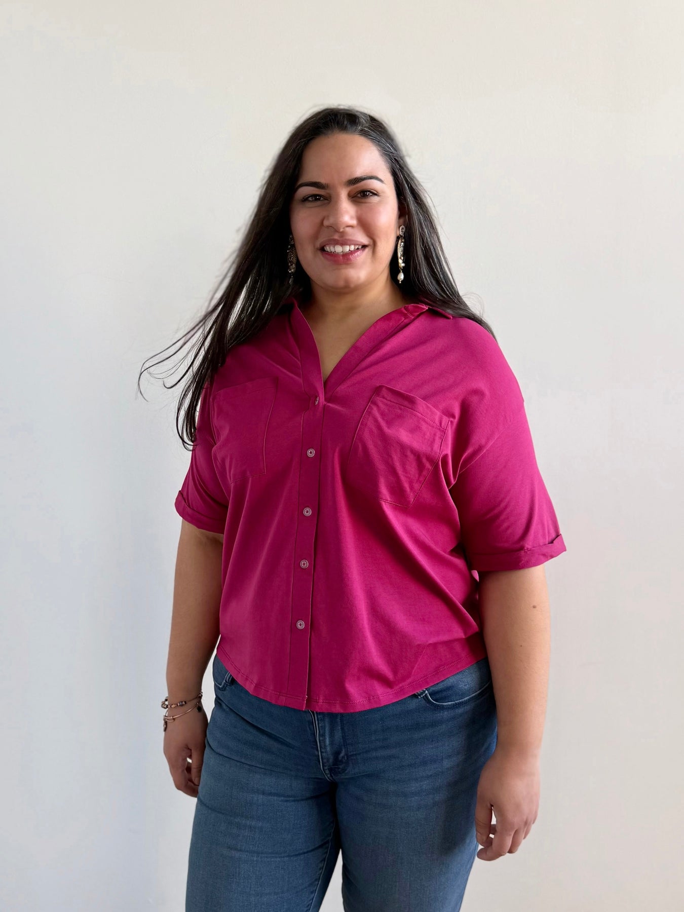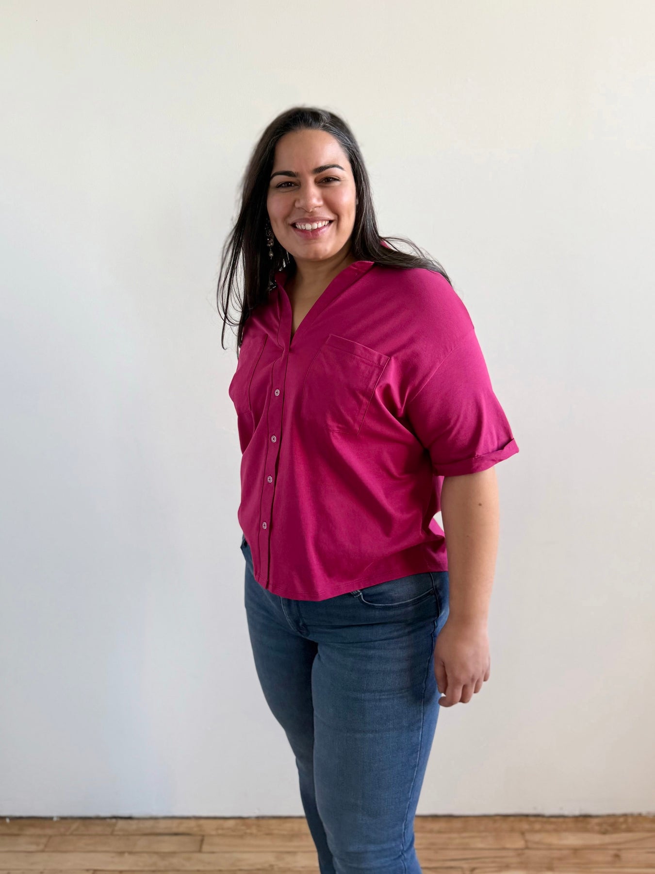 The Beverly top is a versatile classic, complete with chest pockets and rolled sleeve cuffs. Sleeve length is at the elbow and permanently rolled. Easily roll it another time for a shorter style. The functional buttons provide ease for nursing moms.