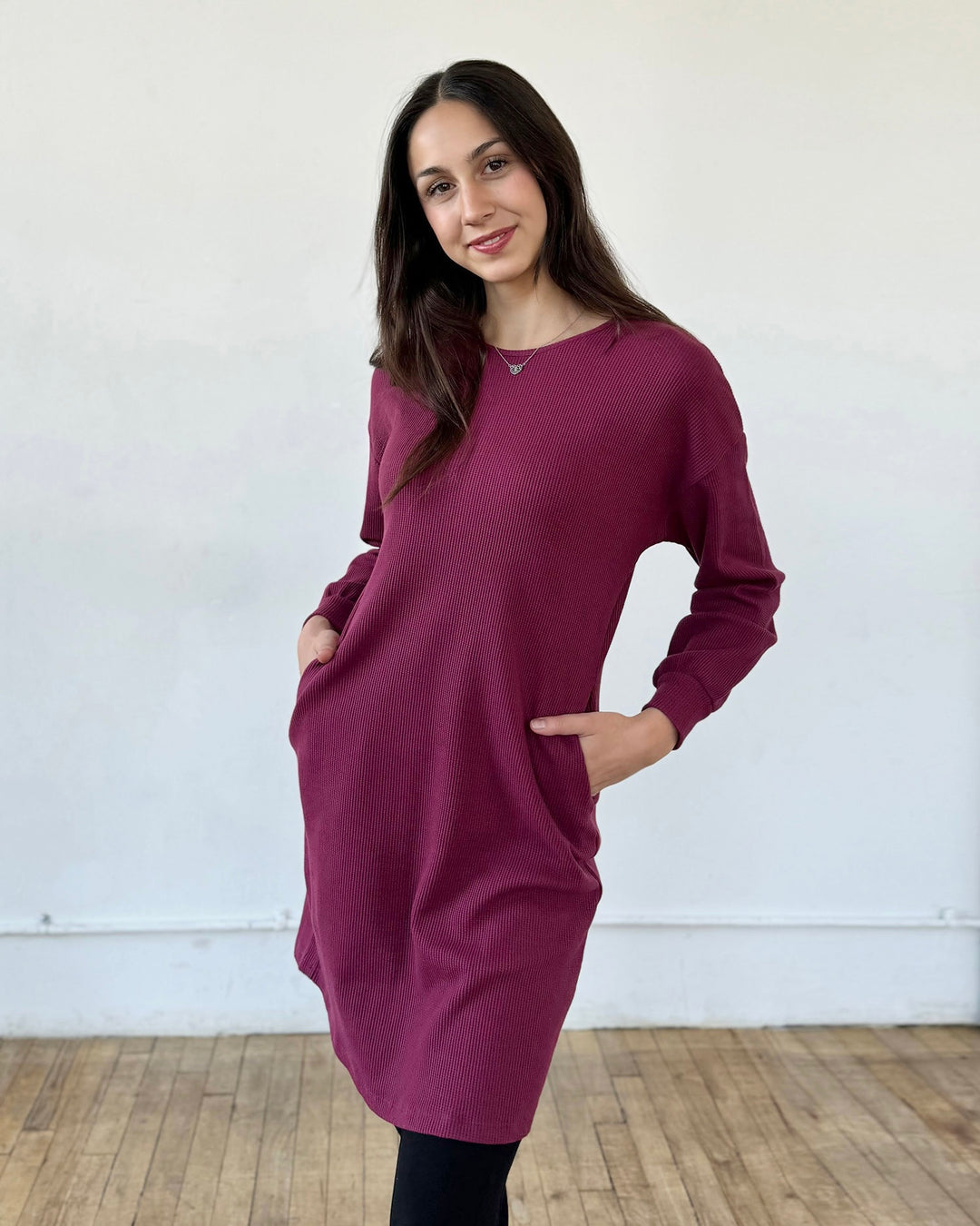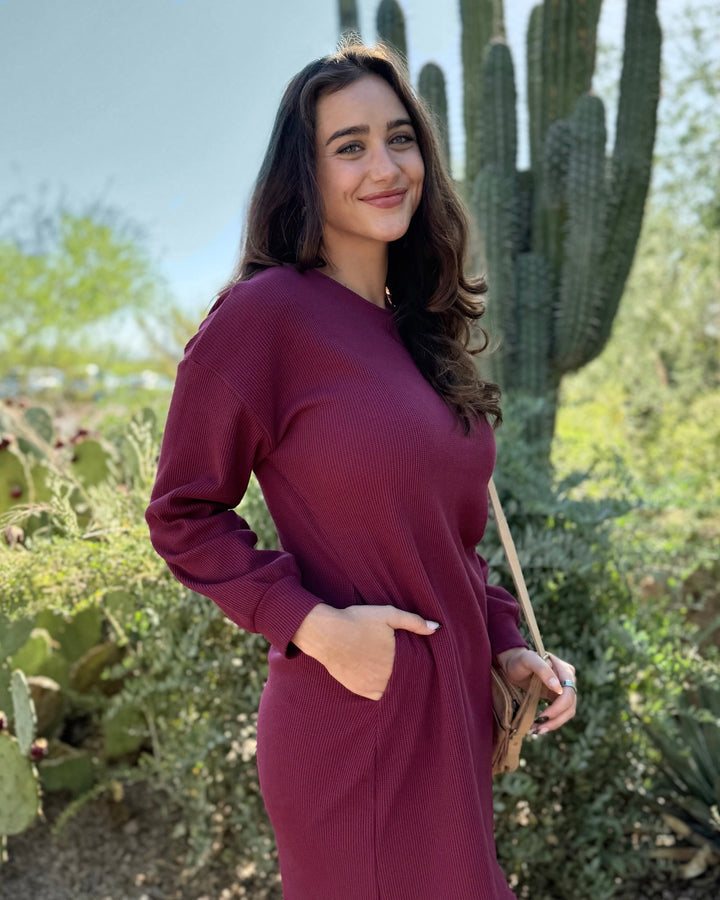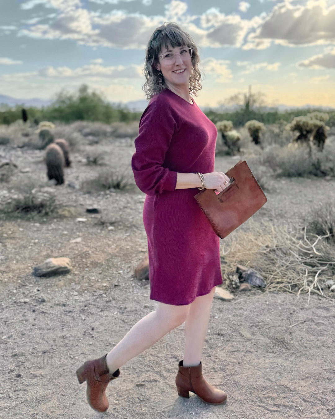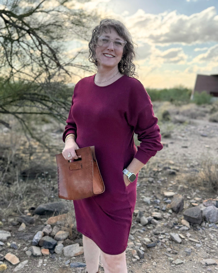 • Don't overthink it.  We have a low return rate overall because most designs are flattering in a size up or down. Our knit fabrics drape in all the right ways!