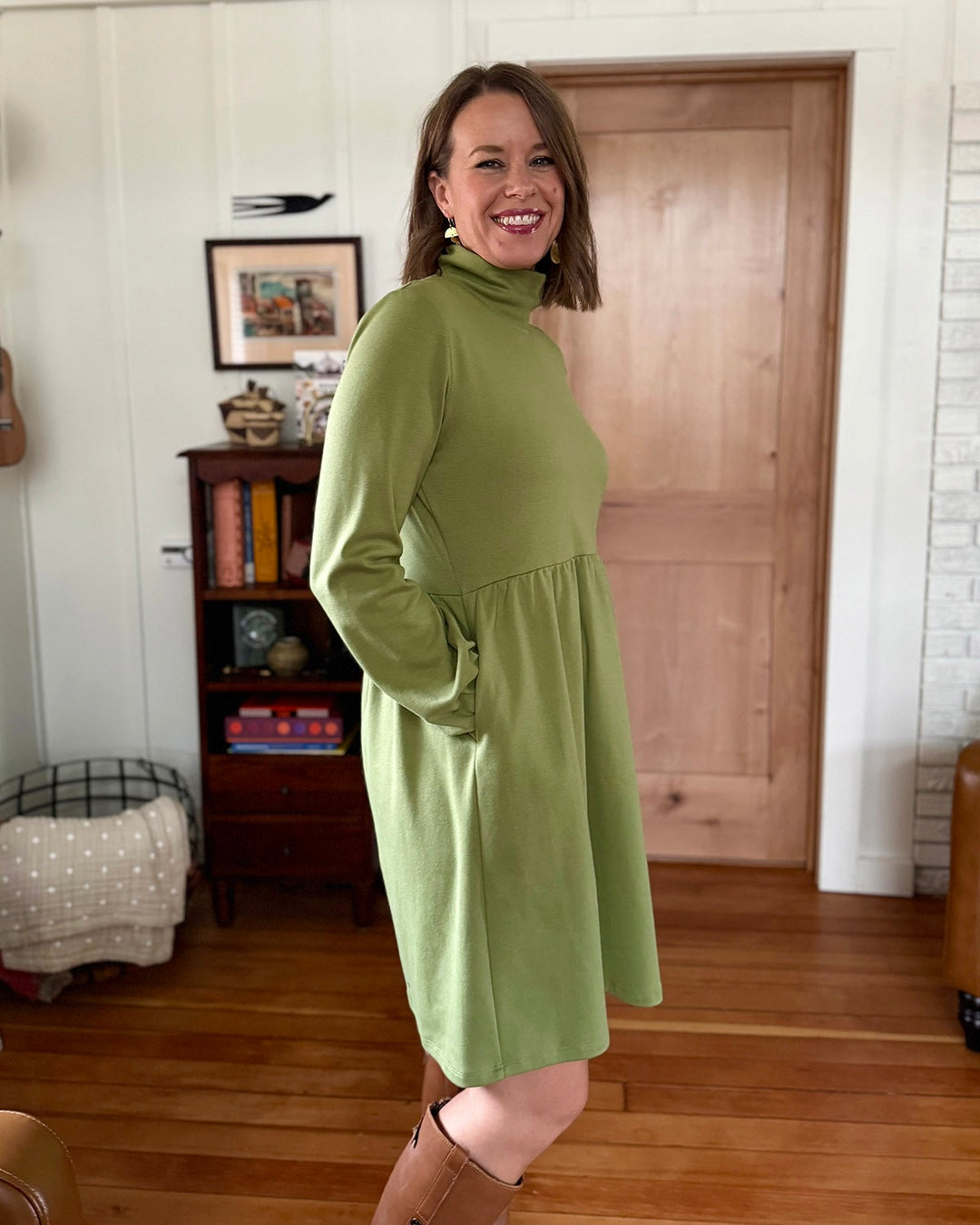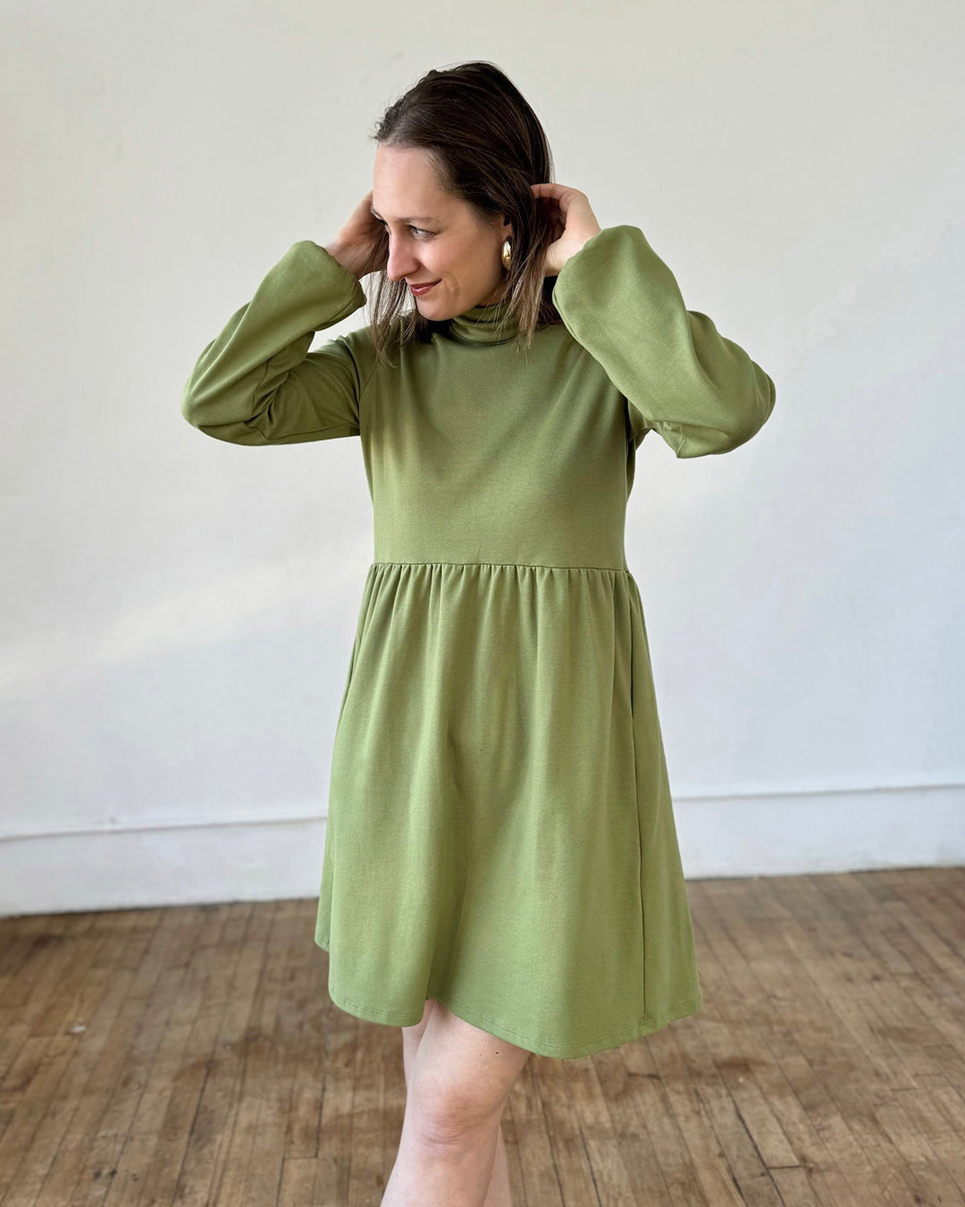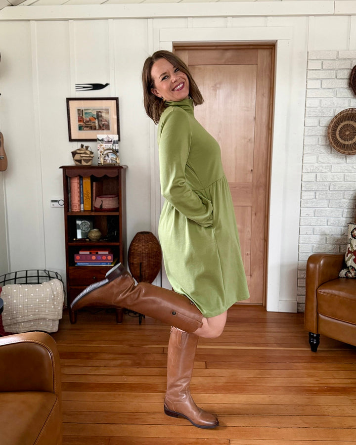 The perfect winter dress. The mockneck, gently loose sleeves, boxy waist, and pockets are the details of this essential cold-weather dress. Add leggings and boots, and you'll feel extra warm in this thicker doubleknit jersey.