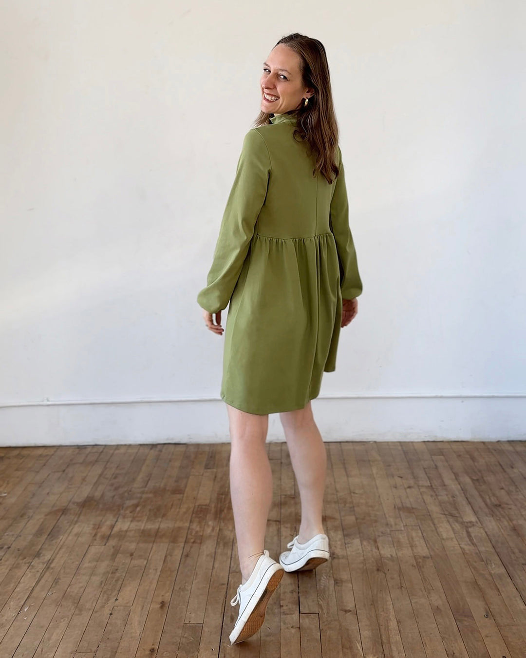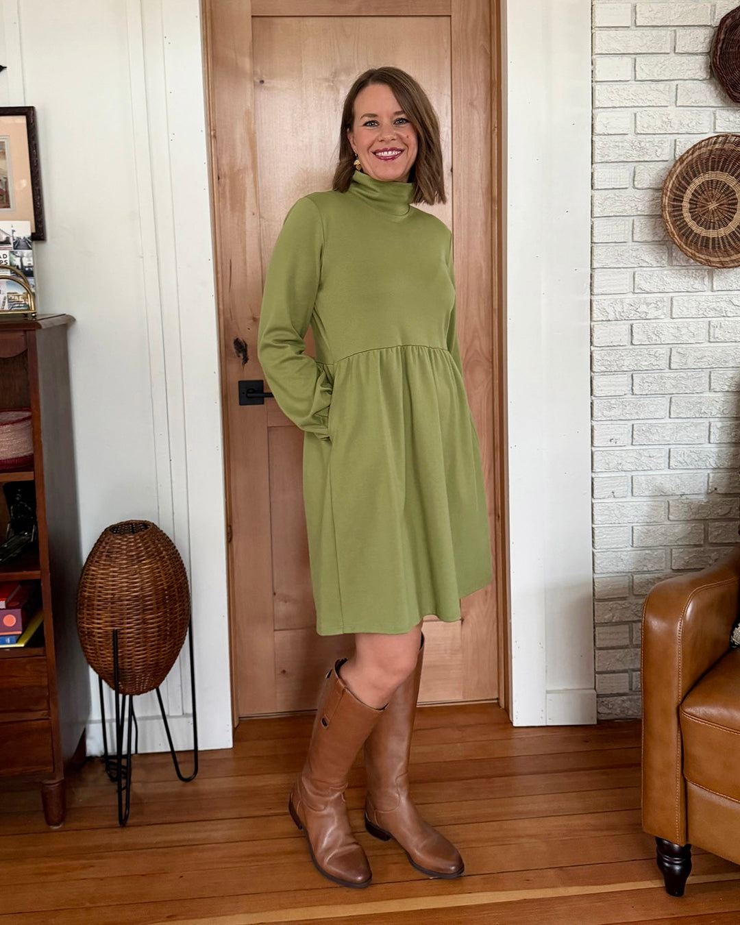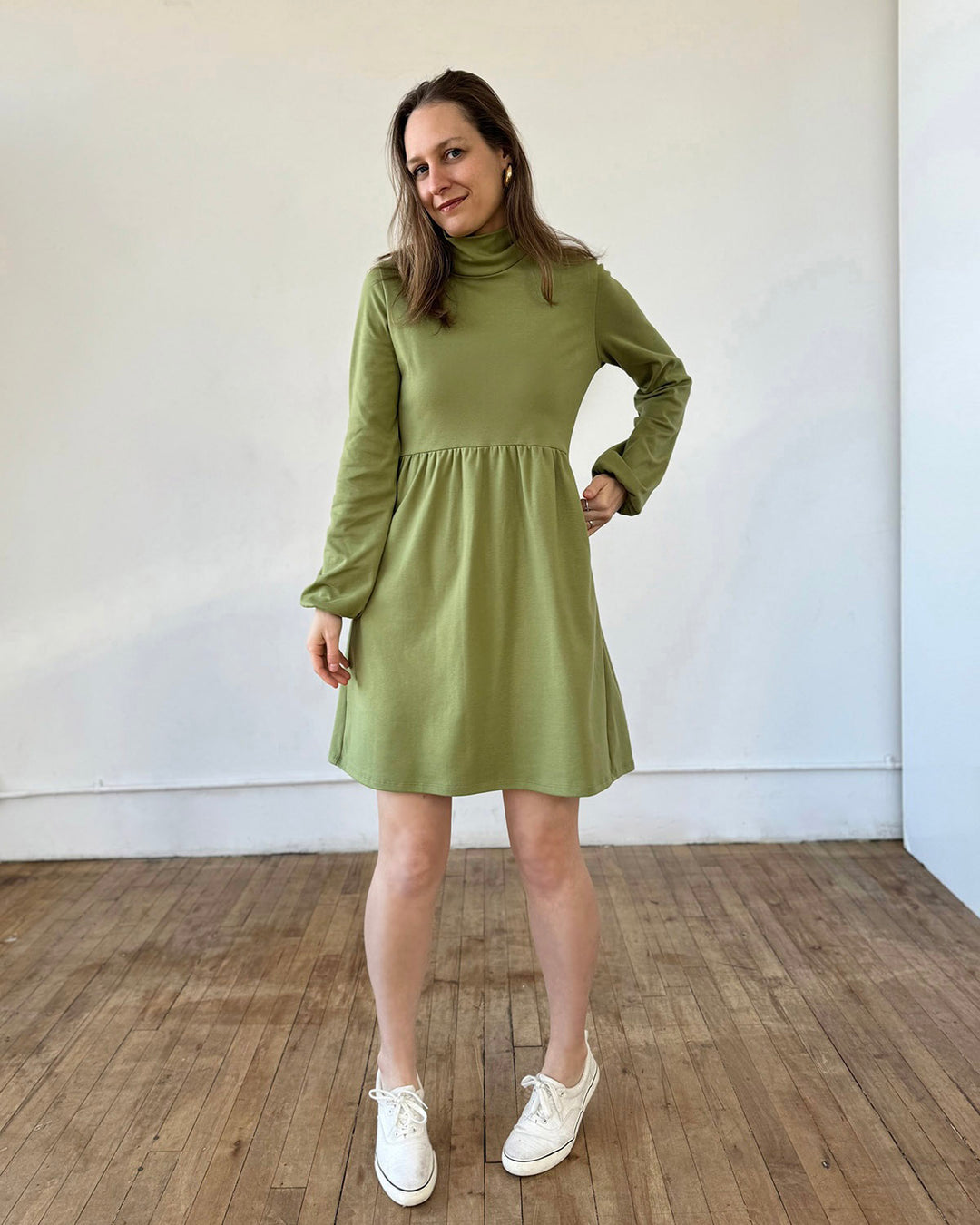 The perfect winter dress. The mockneck, gently loose sleeves, boxy waist, and pockets are the details of this essential cold-weather dress. Add leggings and boots, and you'll feel extra warm in this thicker doubleknit jersey.