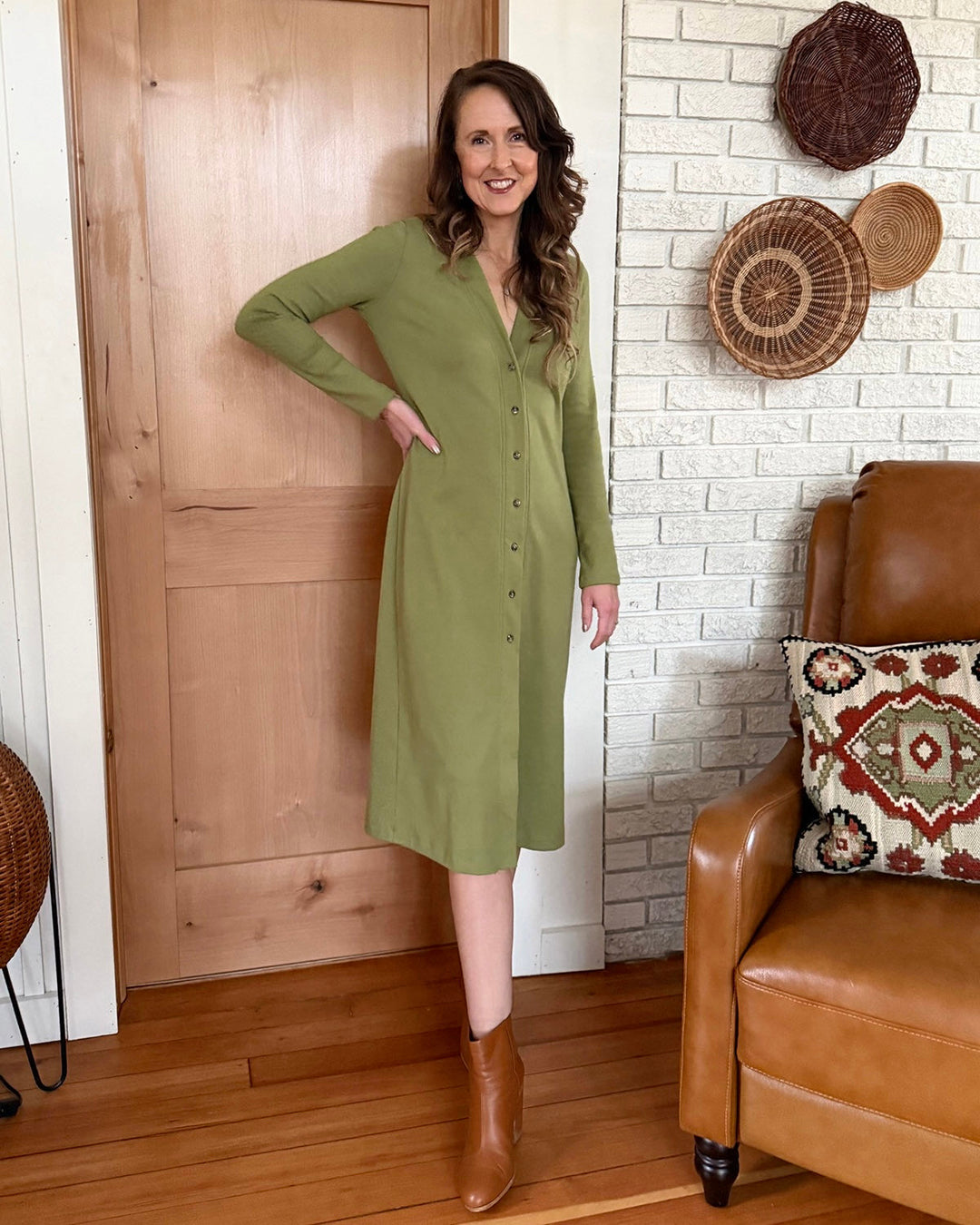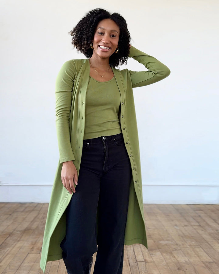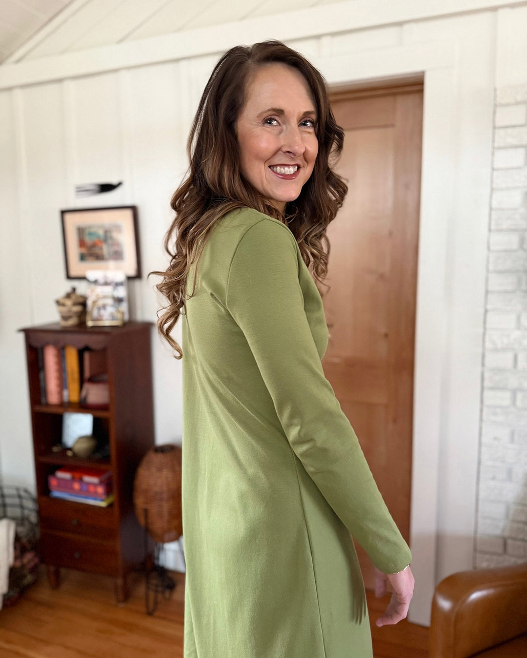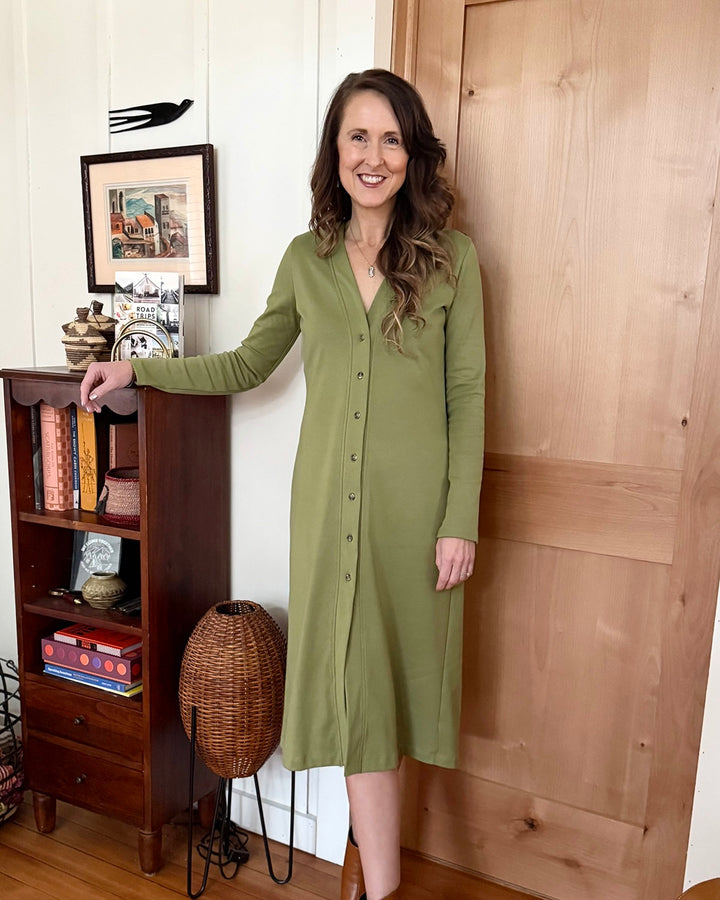 The Lena is a versatile design that can be a duster or a dress. To wear as a dress, close the buttons fully. This offers a more structured fit because of the thicker doubleknit jersey.