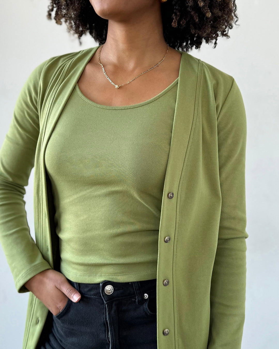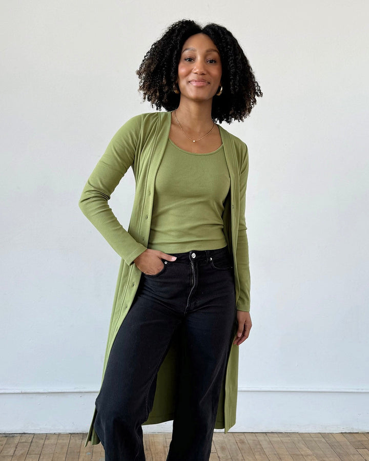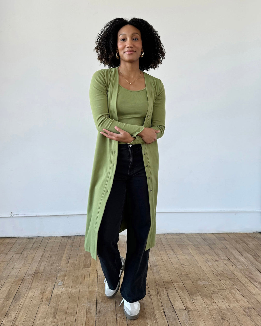 The Lena is a versatile design that can be a duster or a dress. To wear as a dress, close the buttons fully. This offers a more structured fit because of the thicker doubleknit jersey.