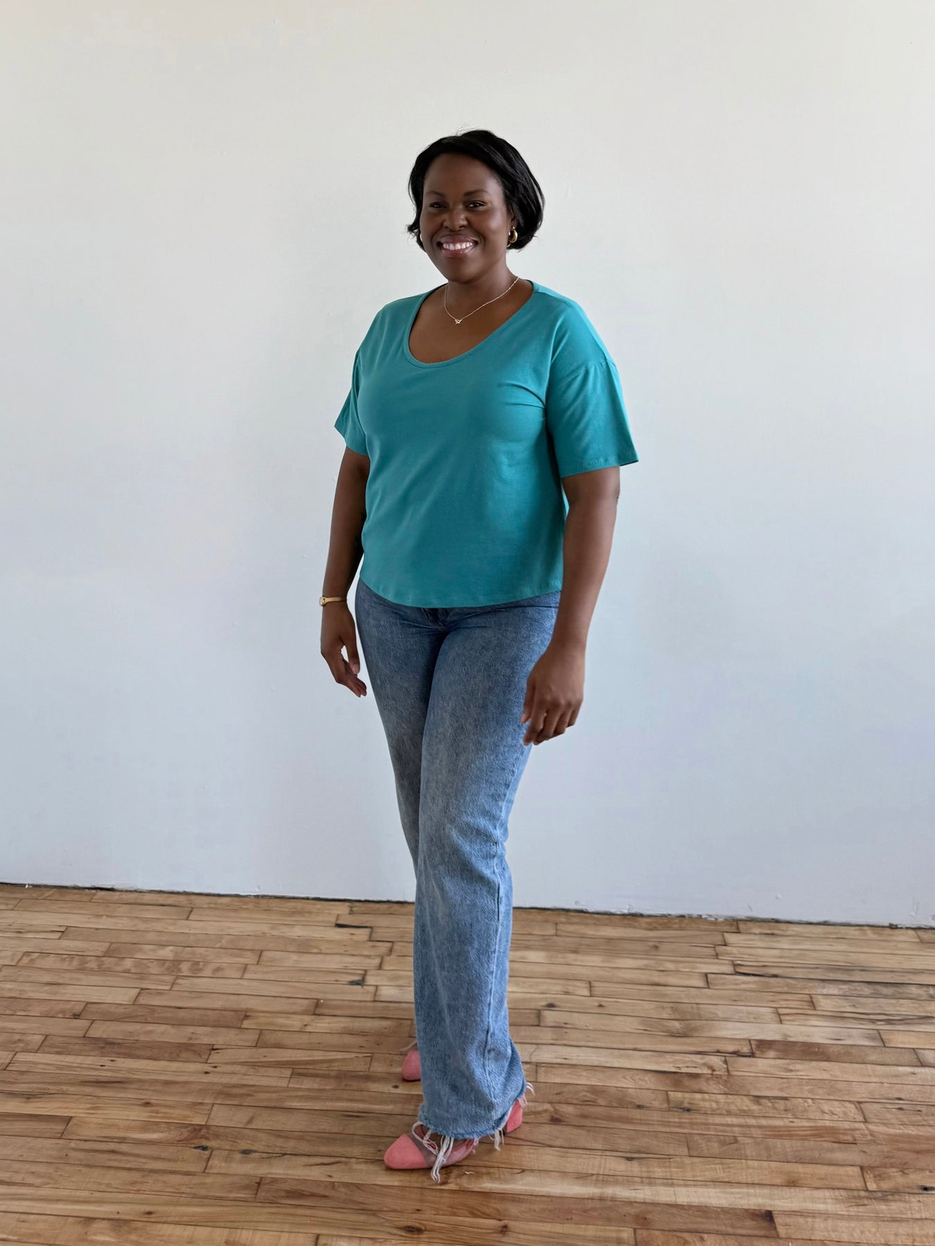 Kim designed this tee with a deep scoop neck and drop-shoulder sleeve. It's not too long, not too cropped, good for layering, and can be tucked or untucked. You'll want multiples of this tee, so enjoy the several color options!