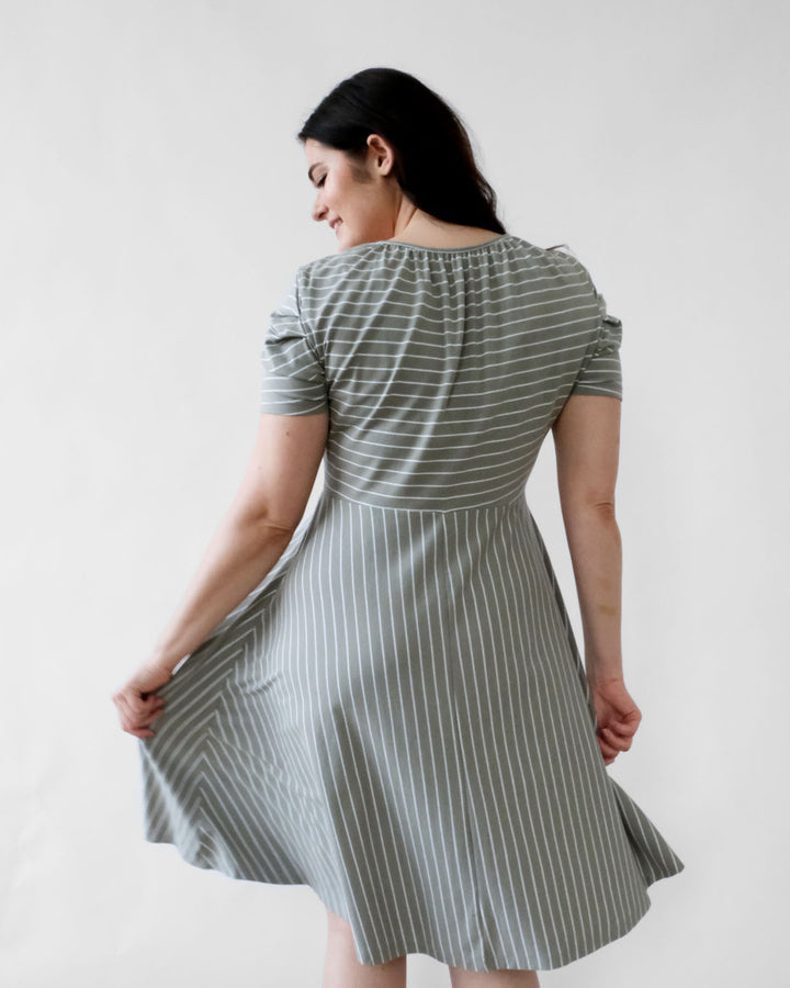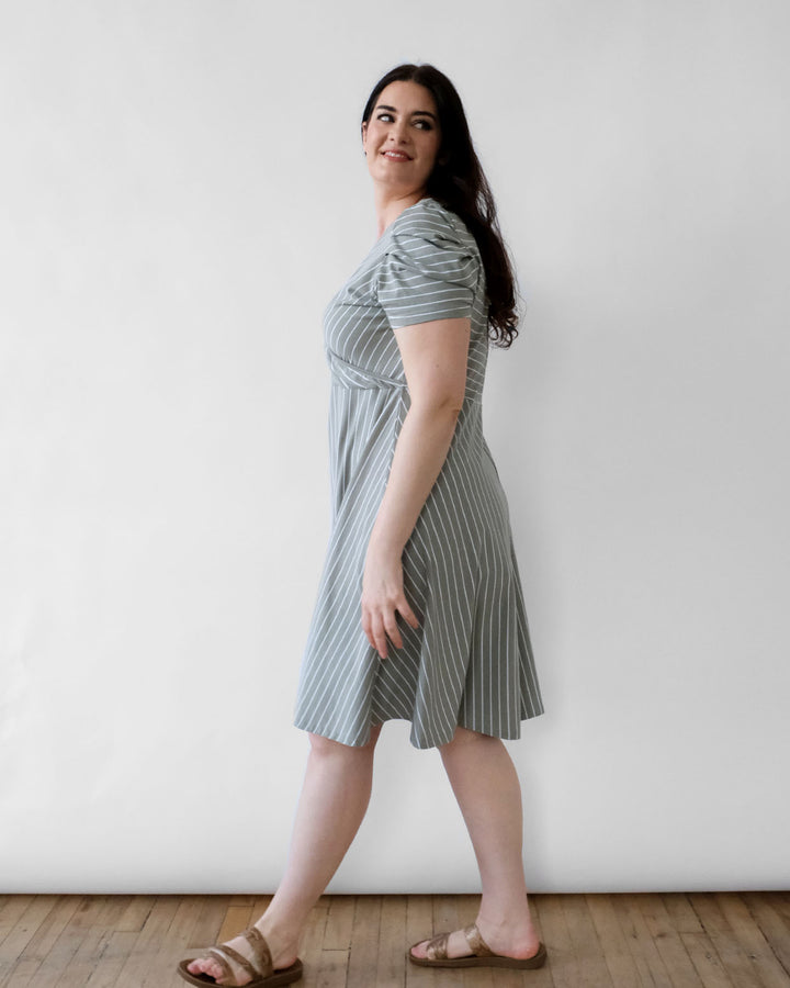 - Not a true wrap dress (easier to get dressed). Slip on and go.