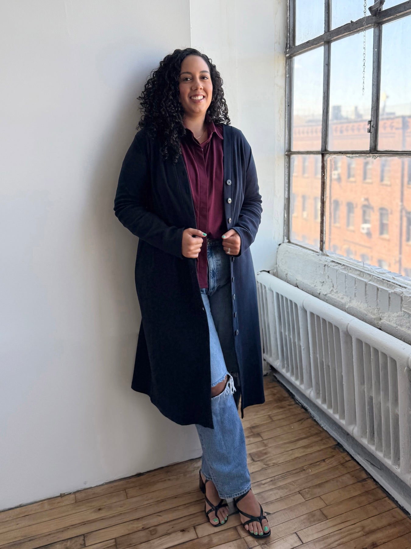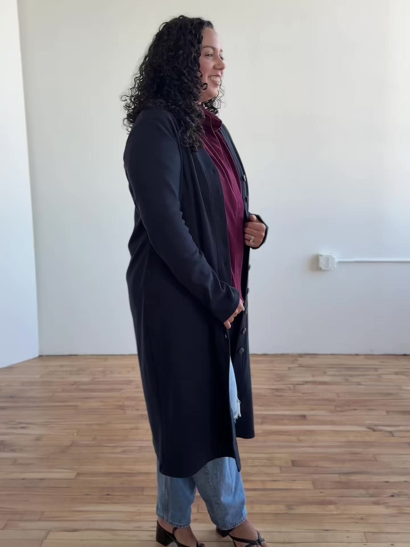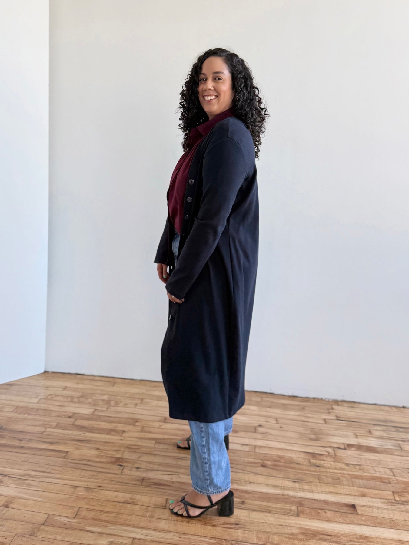 Elena is a dress in thick rib-knit fabric, with a boxy silhouette. With the contouring fabric, your curves can be accentuated! It can be fully buttoned for work, unbuttoned on the bottom for a slit-like effect with jeans, or worn completely open as a duster with jeans and the Kim tee. We chose shades that pair well with a lot of what’s already in your closet, making this the perfect dual-role item.
