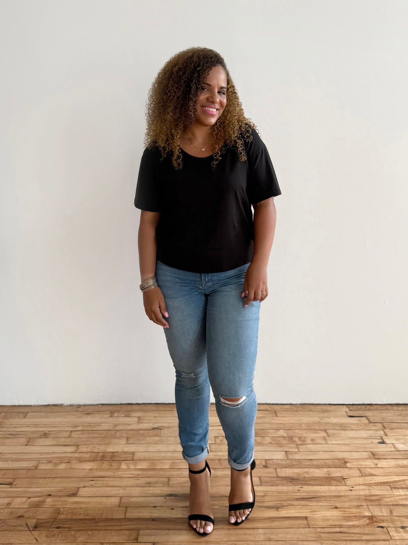 Kim designed this tee with a deep scoop neck and drop-shoulder sleeve. It's not too long, not too cropped, good for layering, and can be tucked or untucked. You'll want multiples of this tee, so enjoy the several color options!