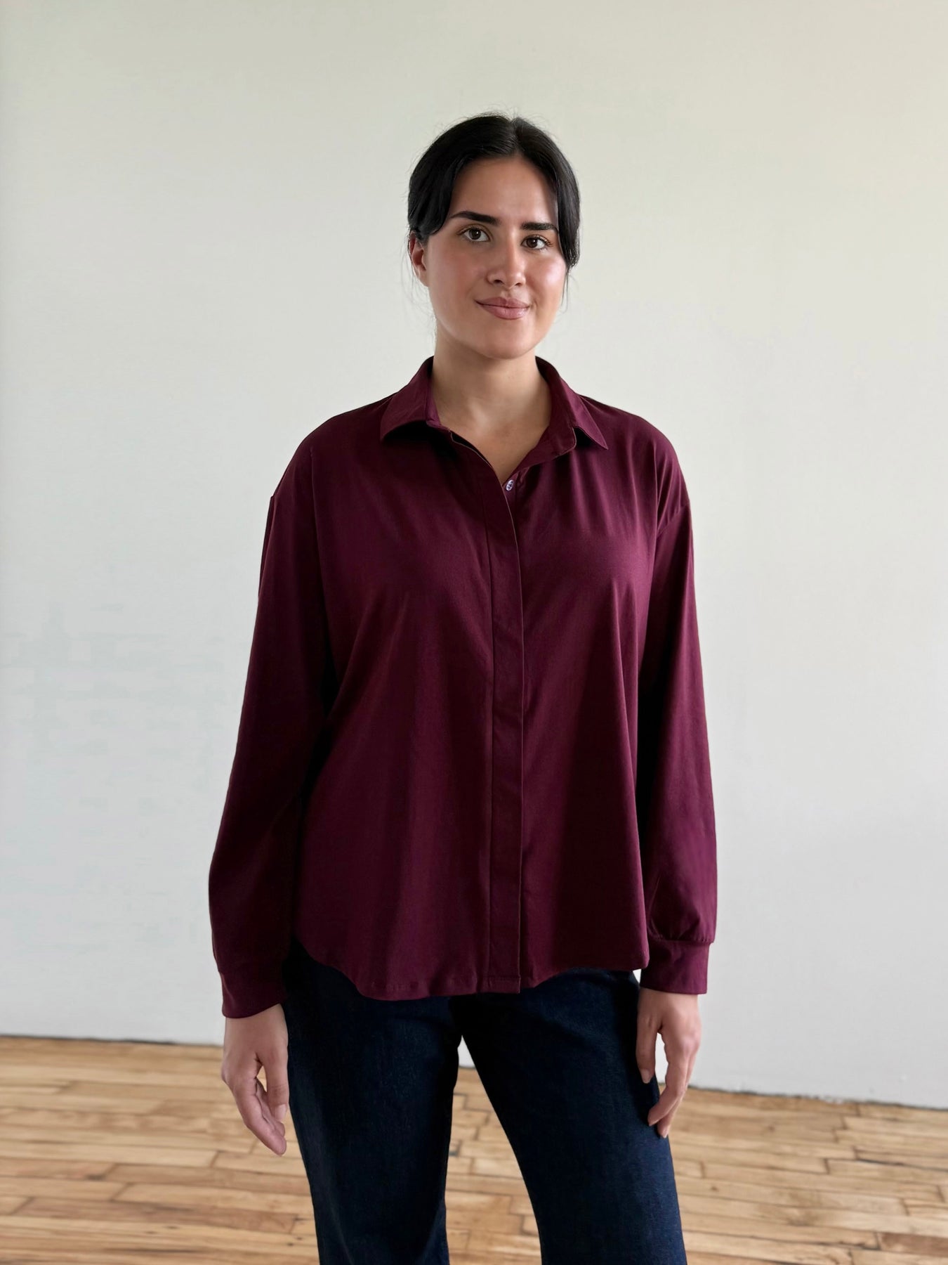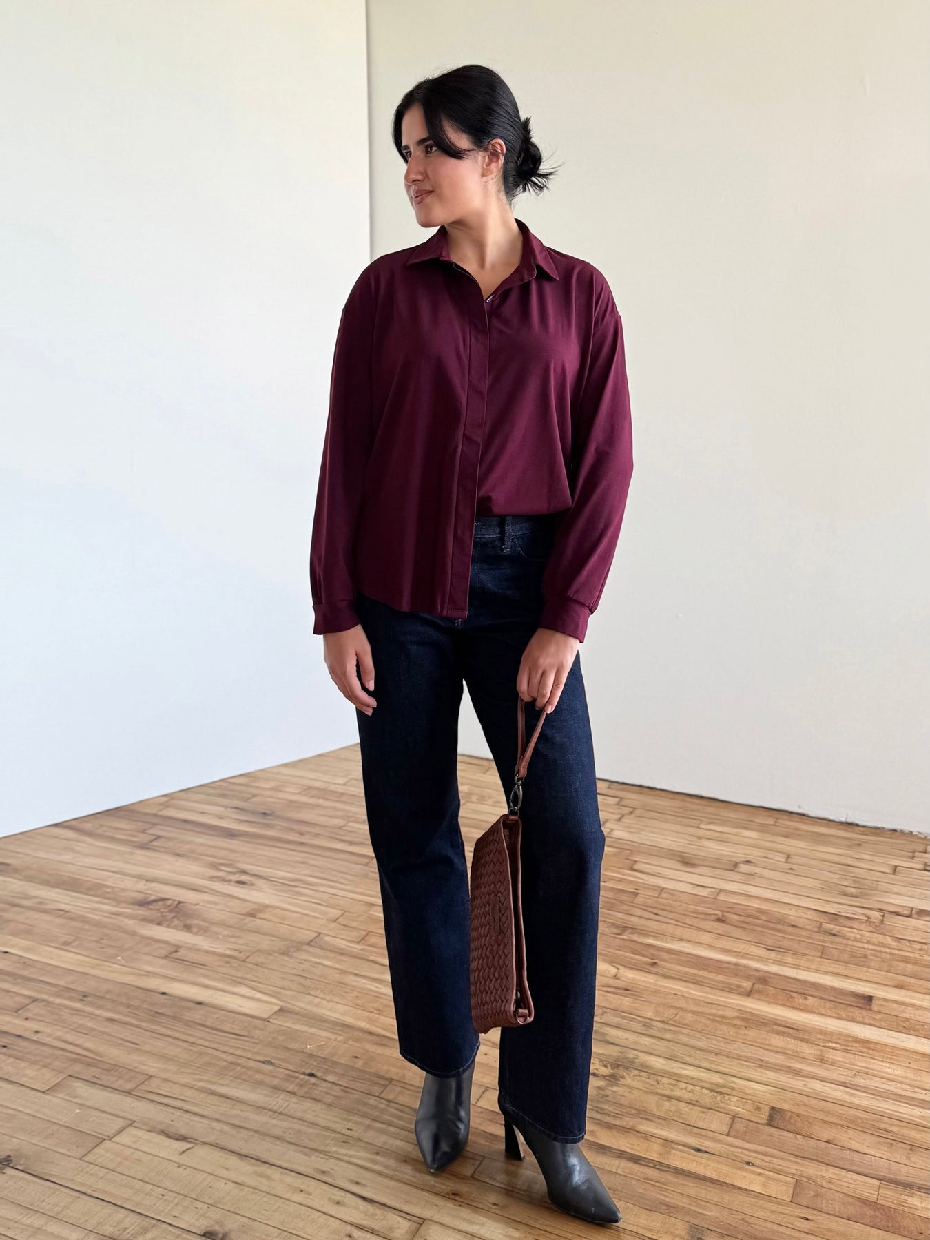 Lindsey designed this with all her favorite features in button down blouses — flowy, sleek front, hi-low hem in back, covered buttons, and a slightly oversized look for a fashion-forward blouse that can be worn tucked, untucked, or half tucked for maxim wear. Pair with the Octavia blazer and jeans for a timeless fall look, or the Octavia blazer and Kenna pants for work, or finally with the Elena dress worn open as a duster and jeans for cozy fall layers.