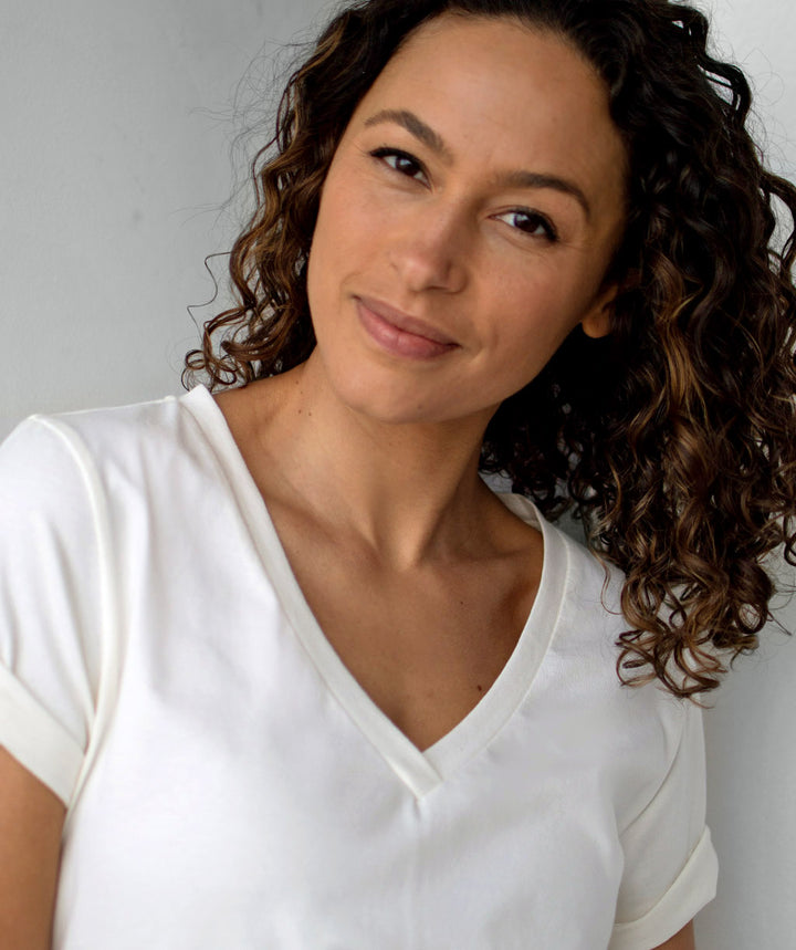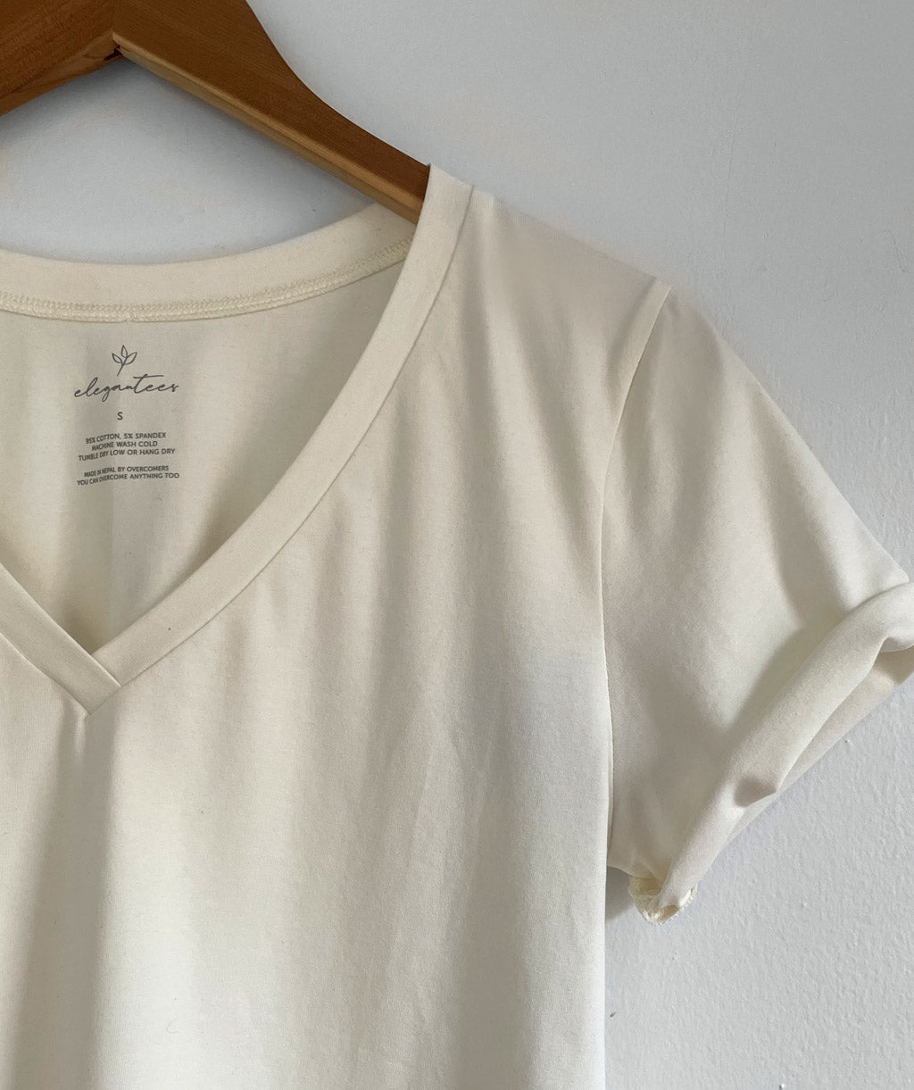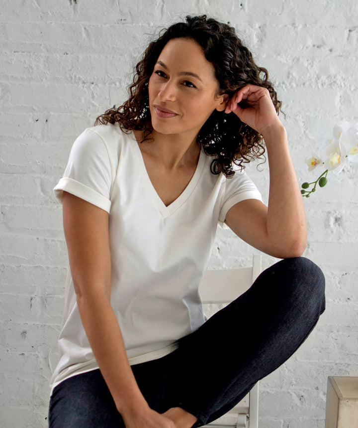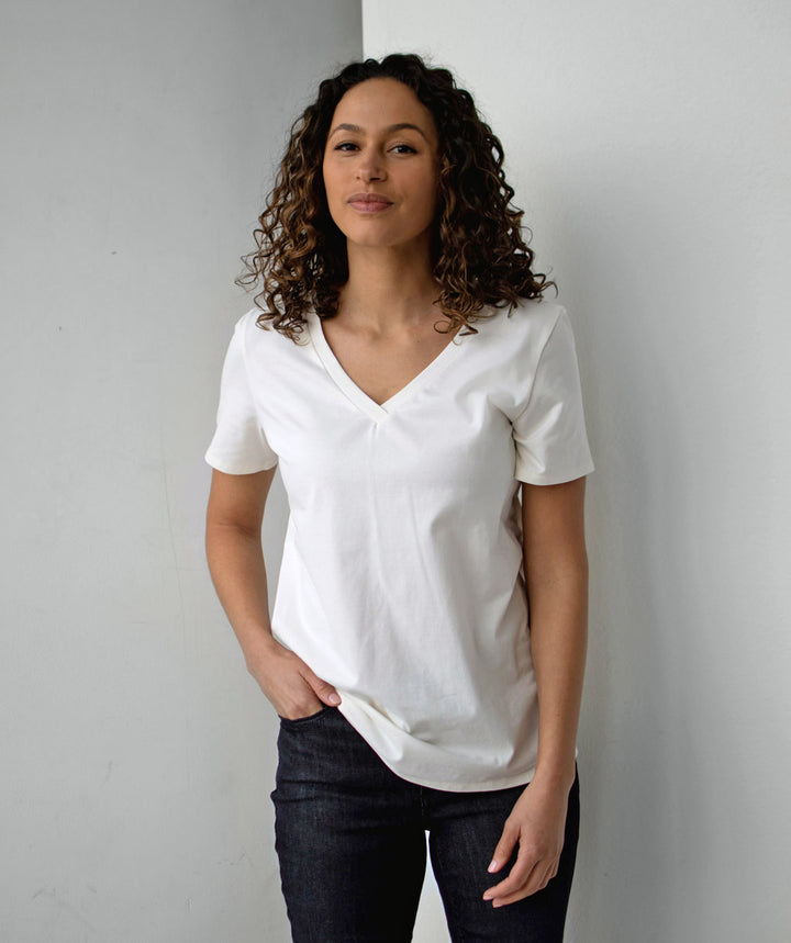 The ivory fabric is intentionally thicker than our usual cotton jersey to keep it from being see-through. This tee may look white, but it has a warm undertone.