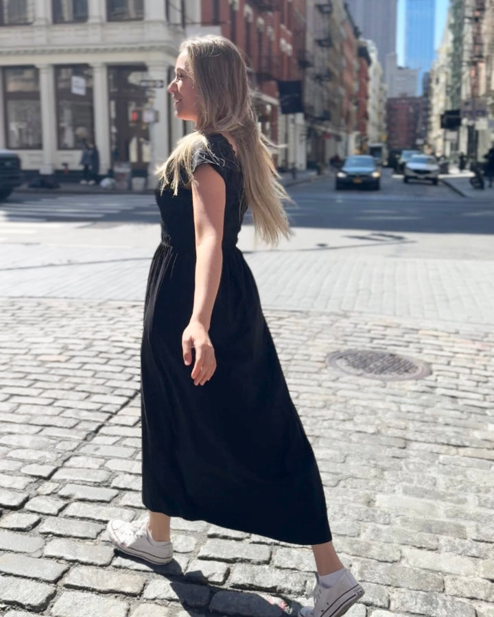 The smocking is completed by hand, and provides a texture that is forgiving to wear. Nursing friendly with stretchy shoulders. Completed to perfection with pockets.
