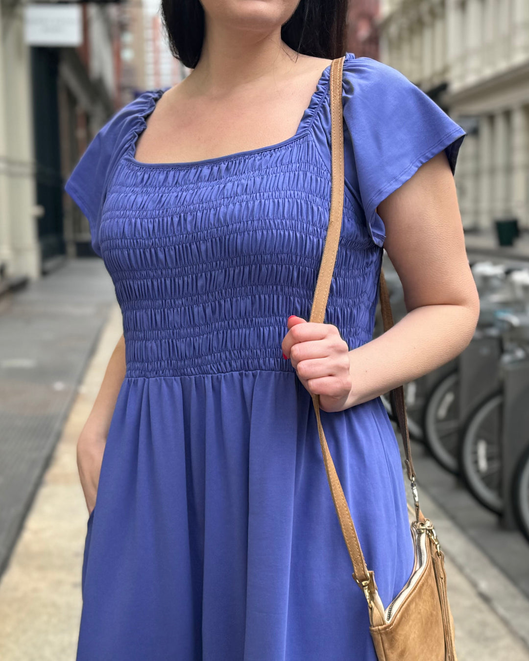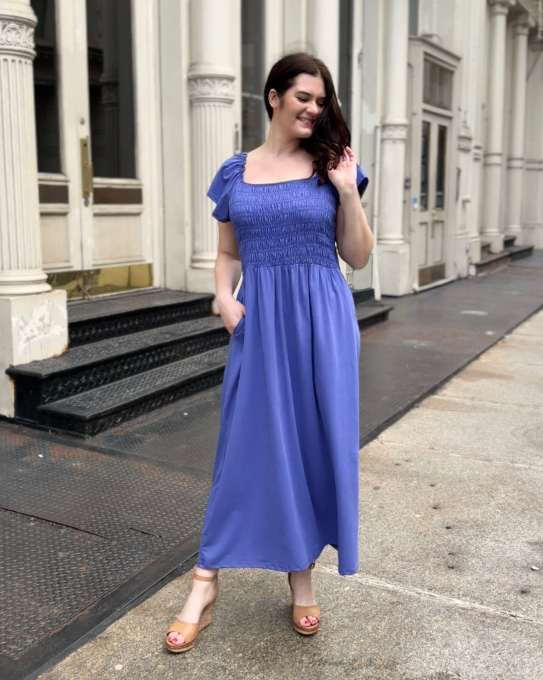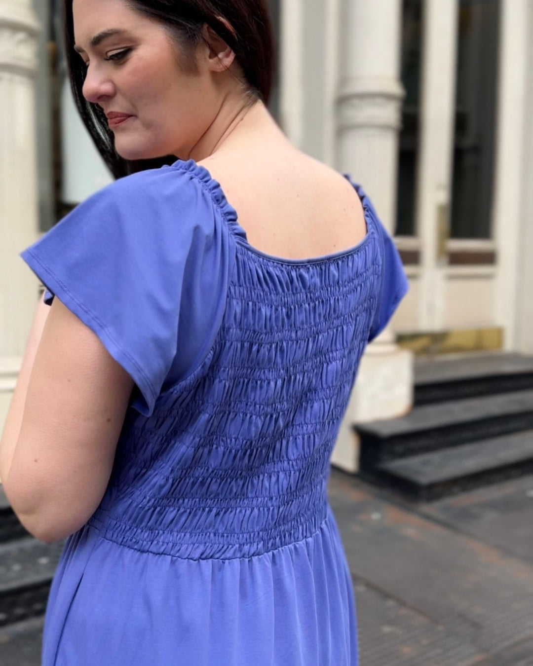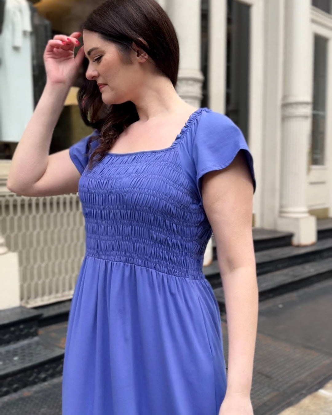 The smocking is completed by hand, and provides a texture that is forgiving to wear. Nursing friendly with stretchy shoulders. Completed to perfection with pockets.
