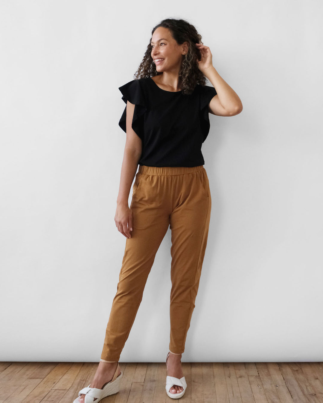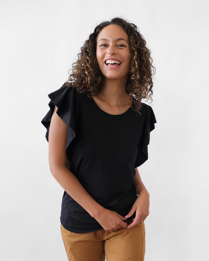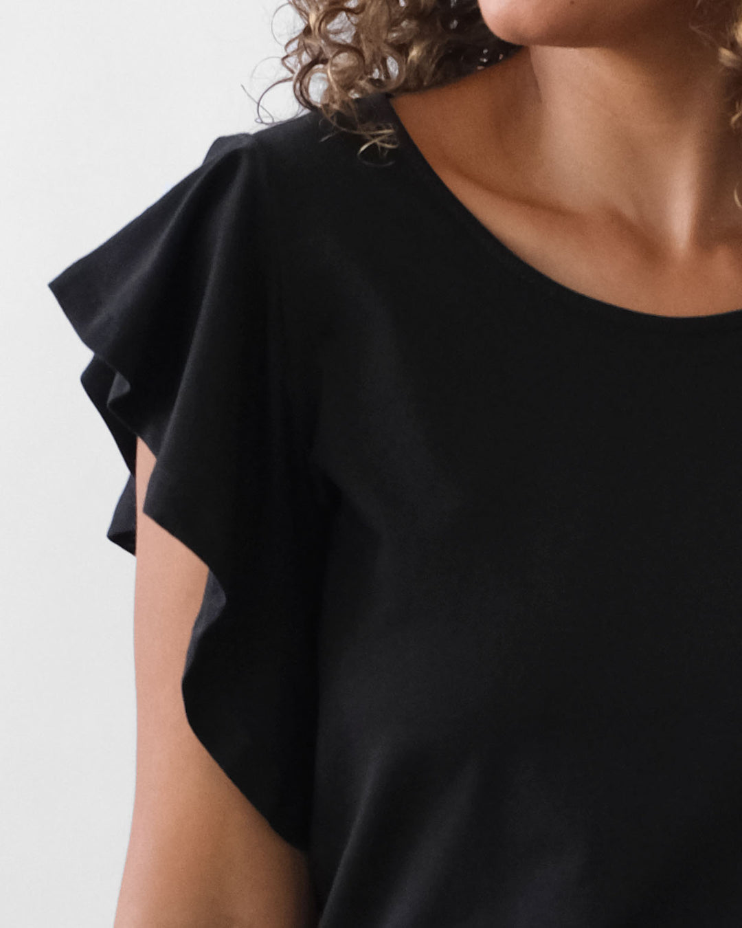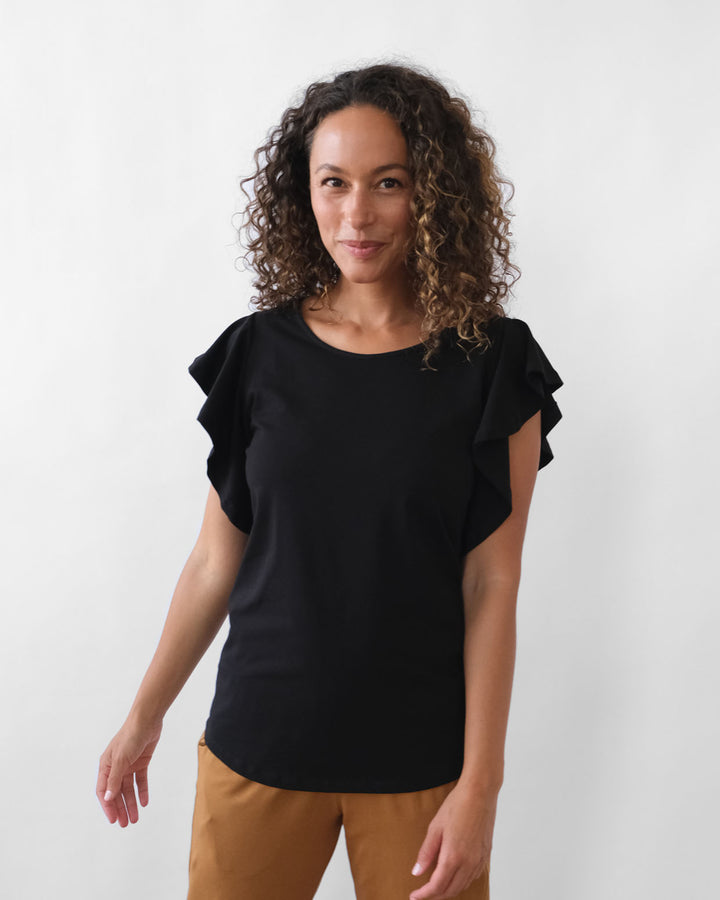 • Don't overthink it.  We have a low return rate overall because most designs are flattering in a size up or down. Our knit fabrics drape in all the right ways!
