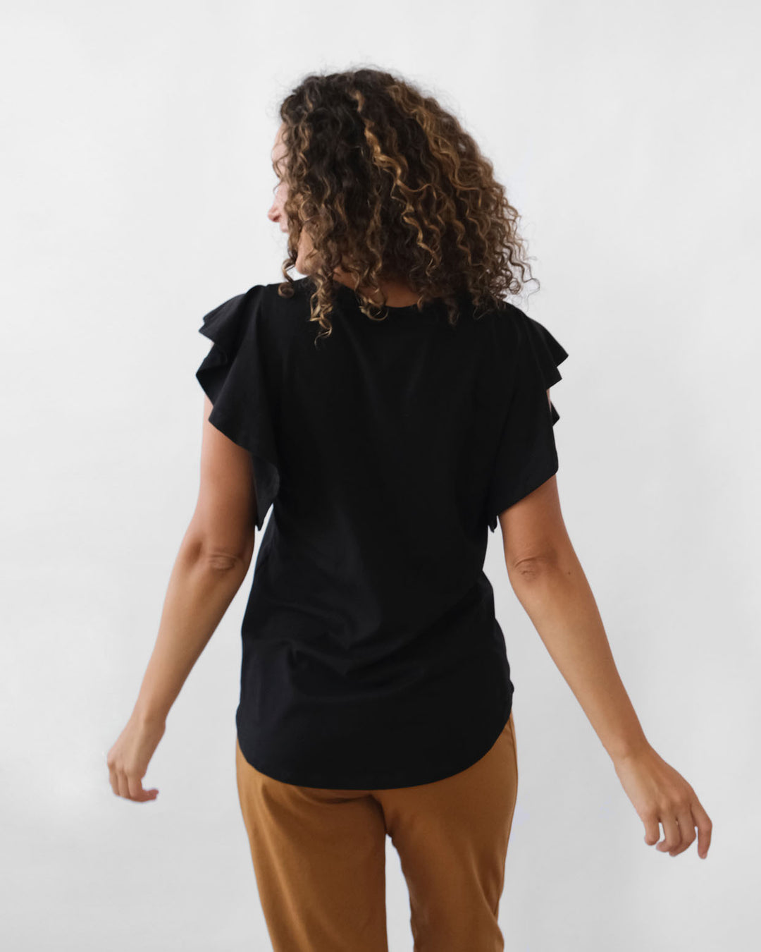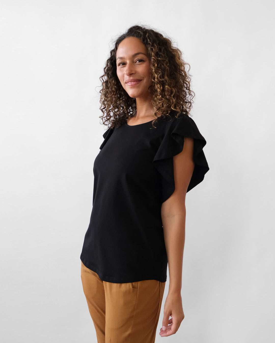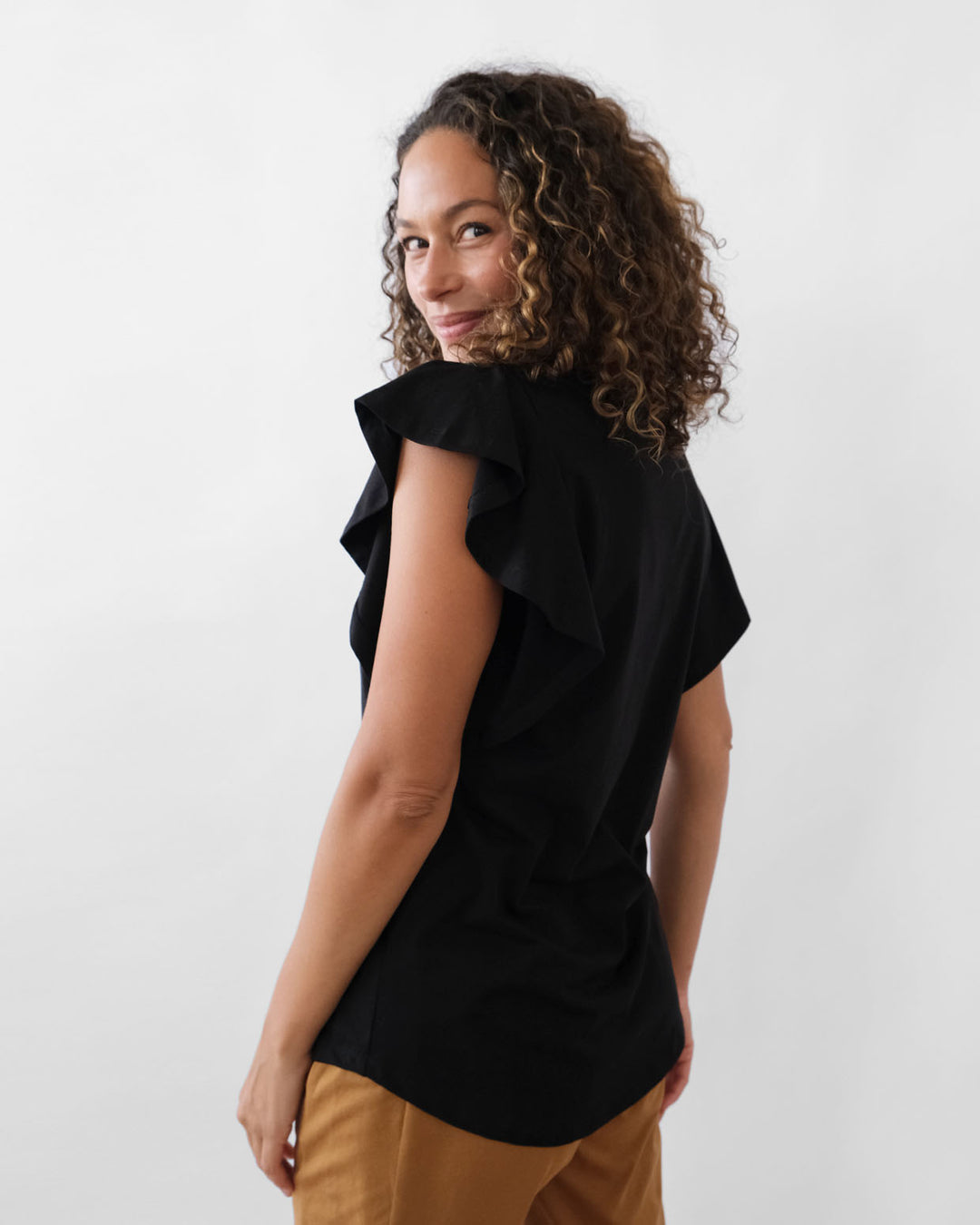 • Don't overthink it.  We have a low return rate overall because most designs are flattering in a size up or down. Our knit fabrics drape in all the right ways!