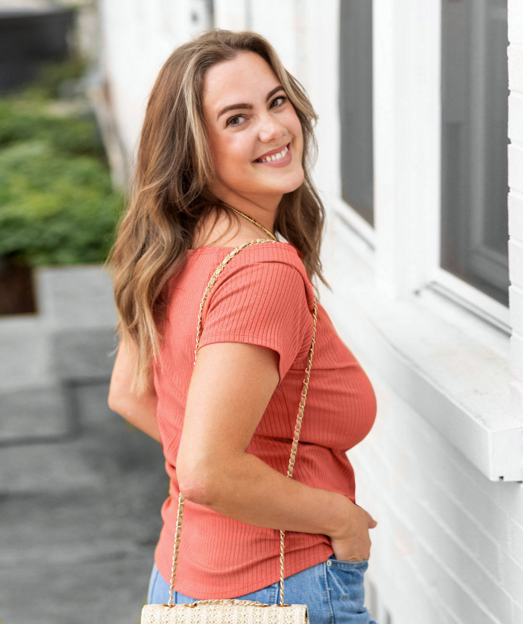 Off-shoulder rib knit tee; made of breathable cotton.