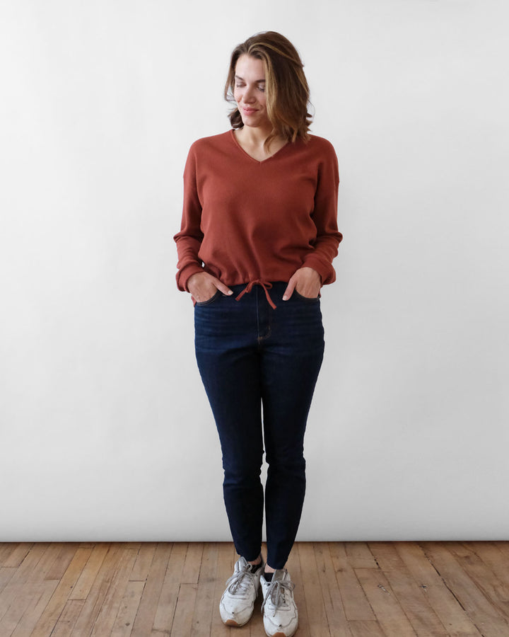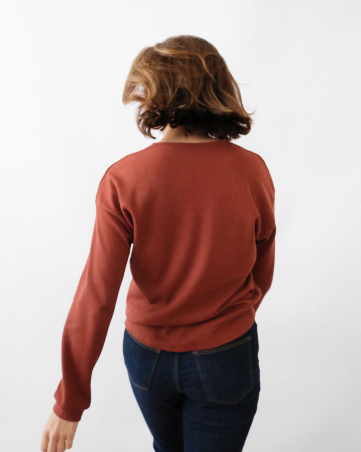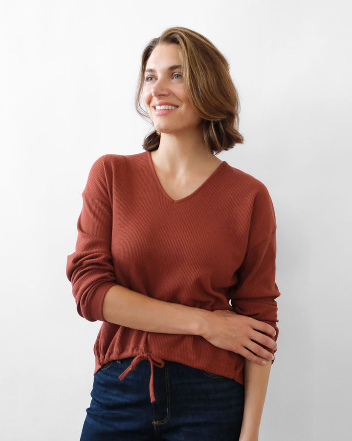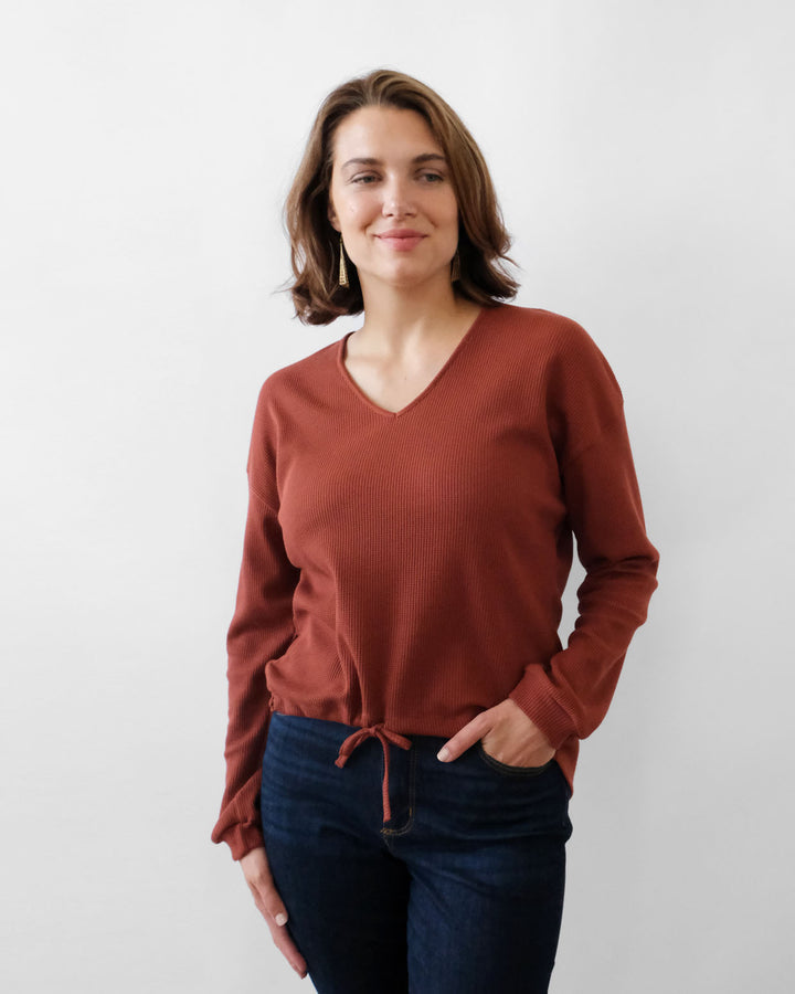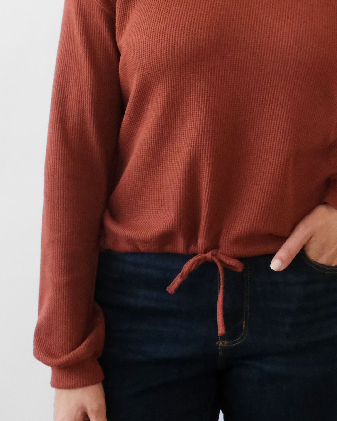 This looser waffle knit pullover. Wear it as a layering piece for extra warmth this season.