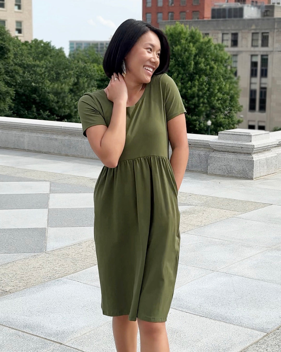 A tee-shirt, but a dress to slip on and go. Can't get easier than that when getting dressed! Flattering silhouette that gives waist definition, and is ultra comfortable at the hip level. Complete with pockets.