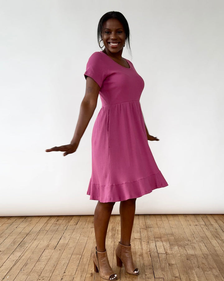 • Don't overthink it.  We have a low return rate overall because most designs are flattering in a size up or down. Our knit fabrics drape in all the right ways!