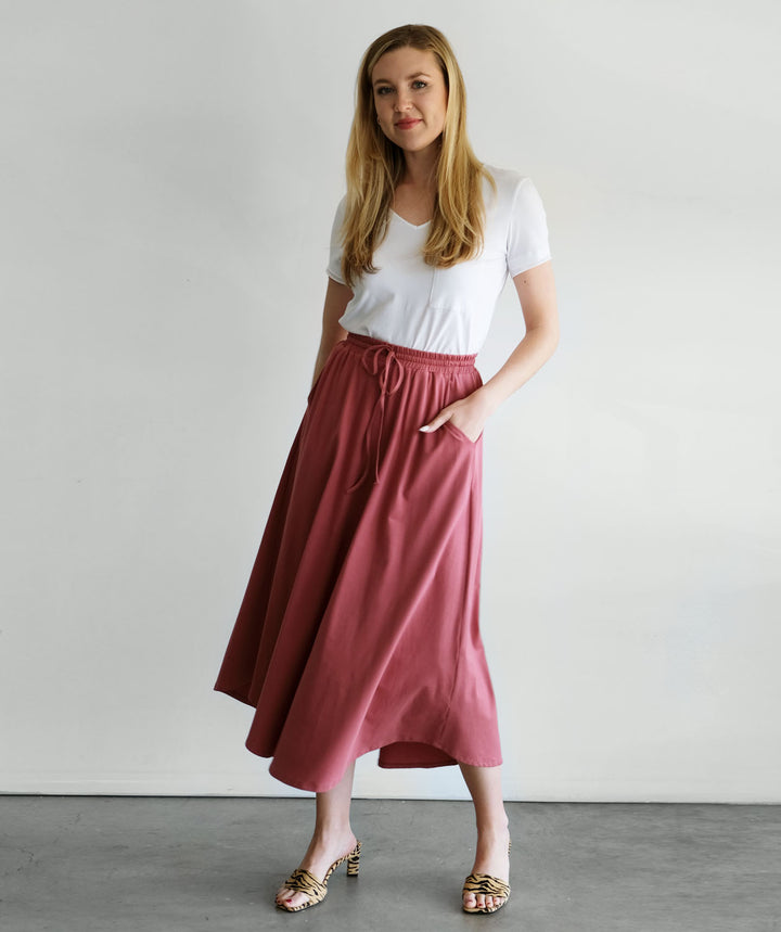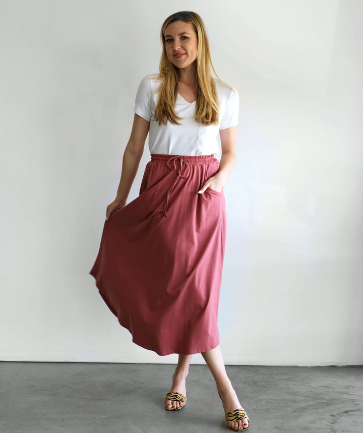 • Don't overthink it.  We have a low return rate overall because most designs are flattering in a size up or down. Our knit fabrics drape in all the right ways!
