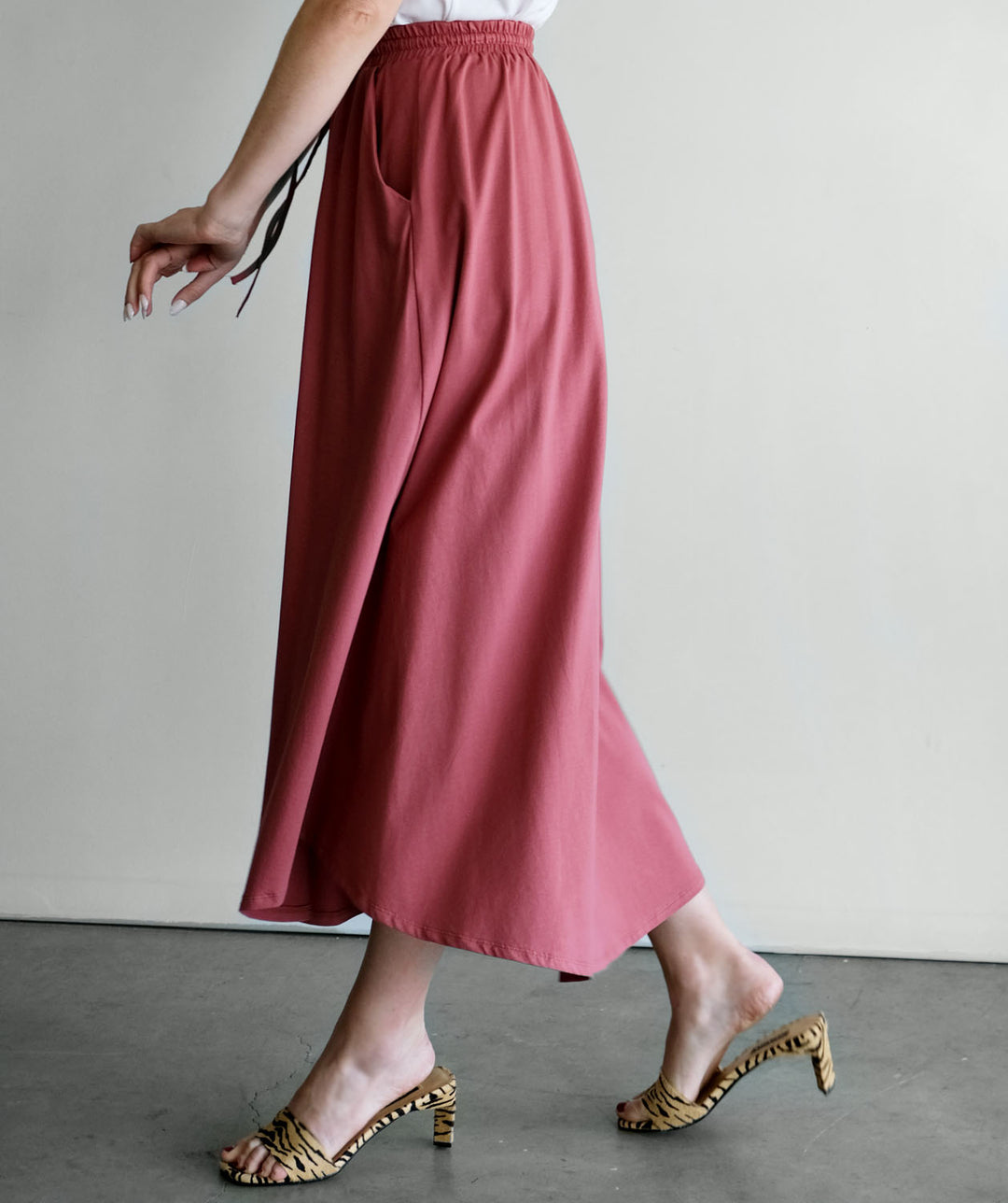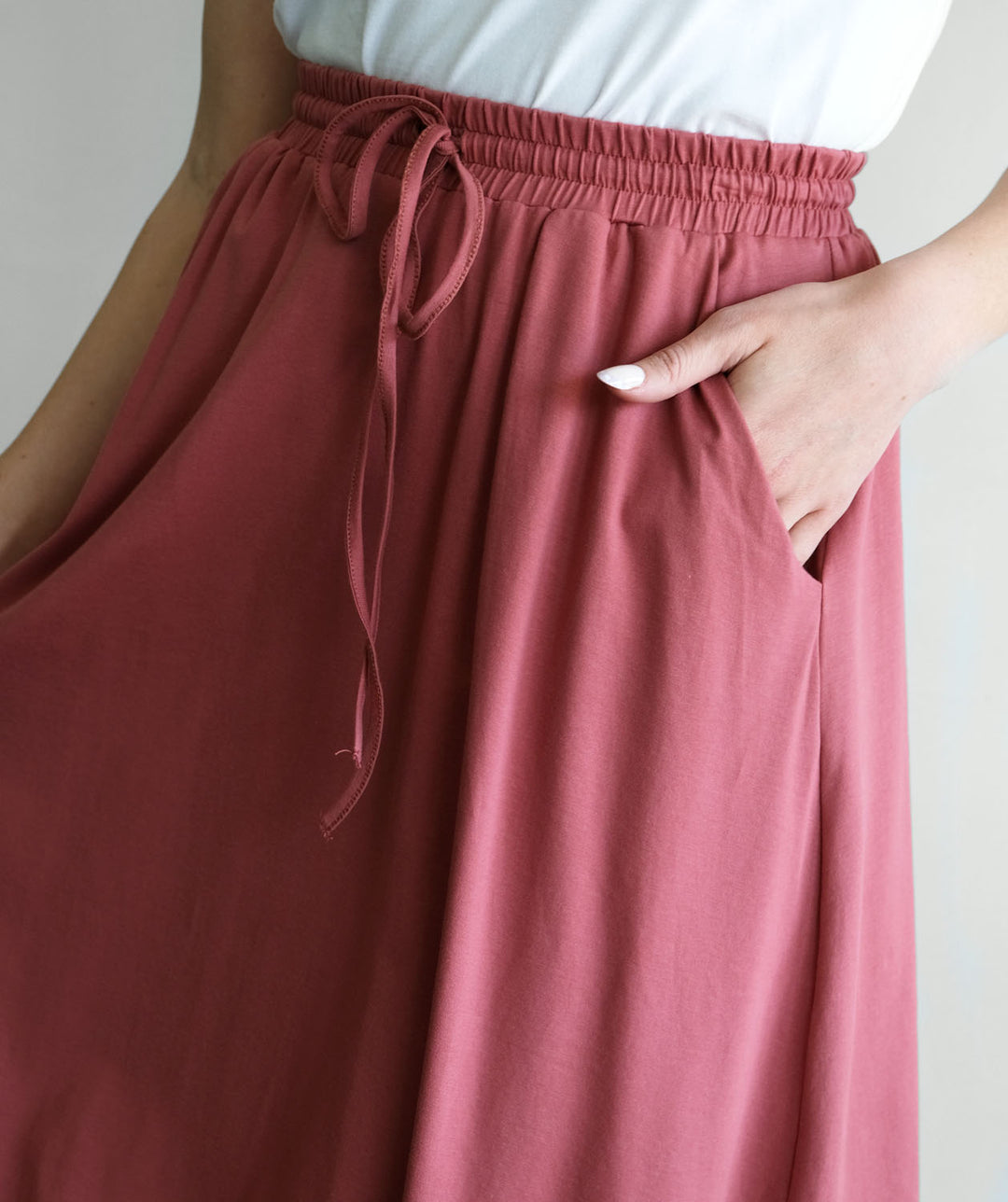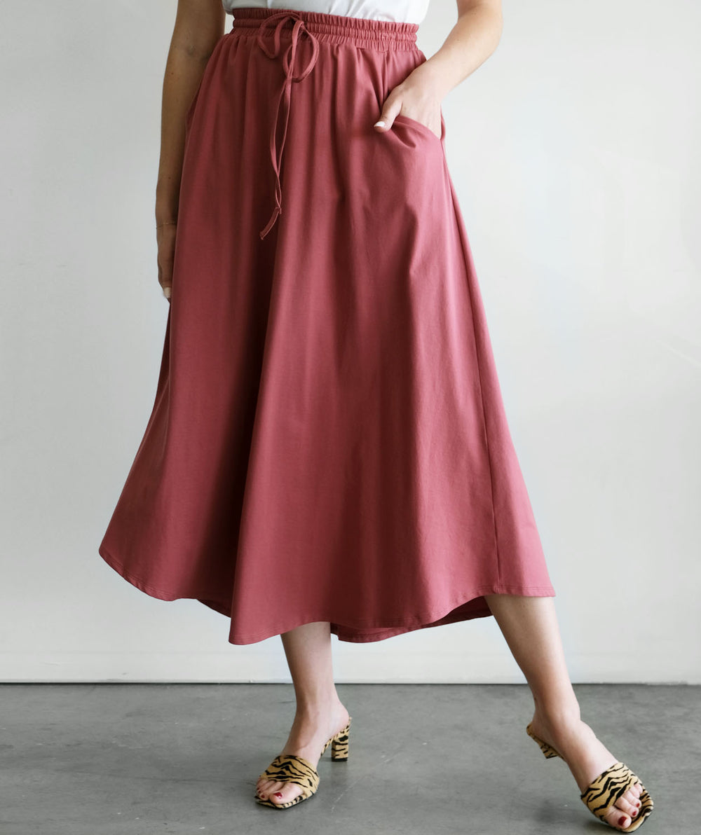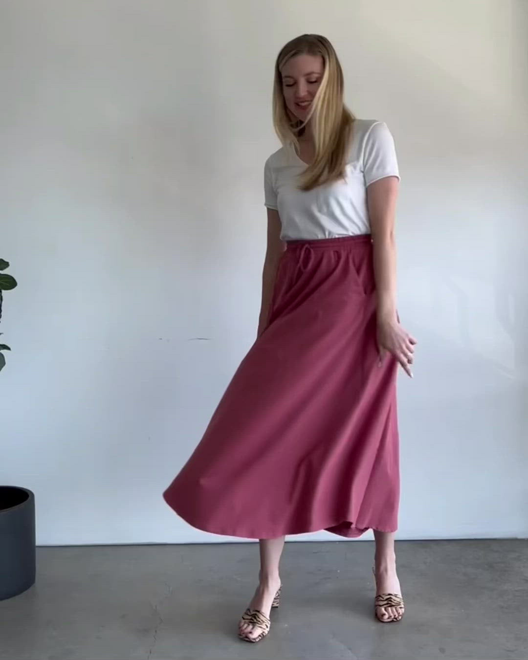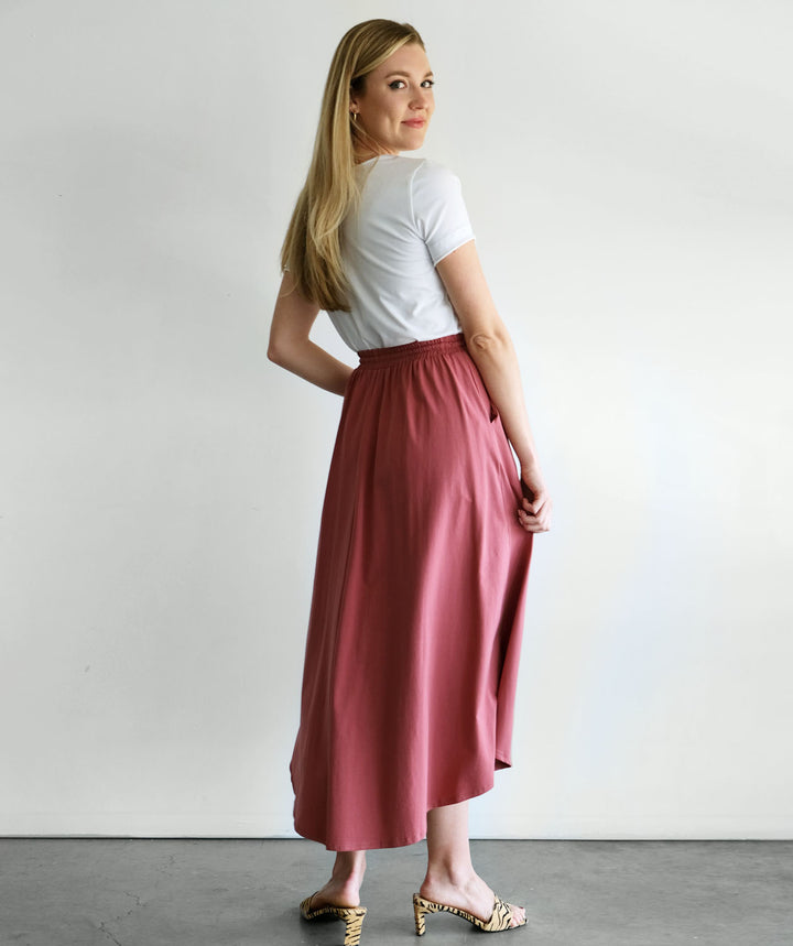 • From top of waistband to hem, length is 35" in the front, and 38" in the back. For shorter women, this will be a maxi length, and for taller women, it's a midi.