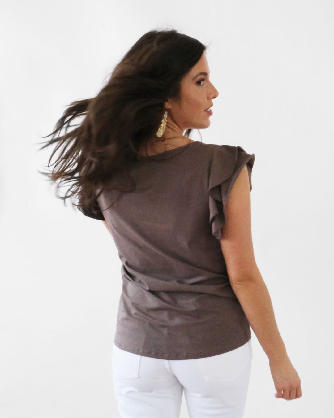 Relaxed, long top, with a voluminous ruffle sleeve.