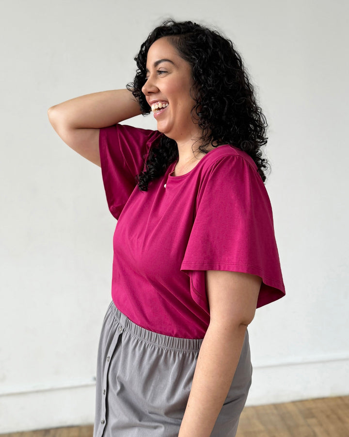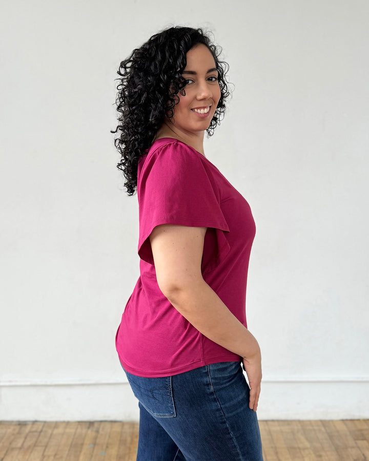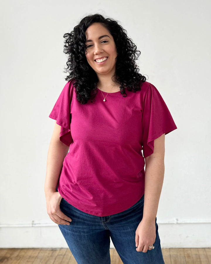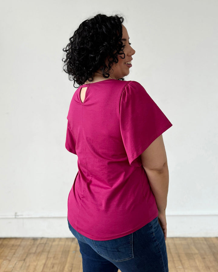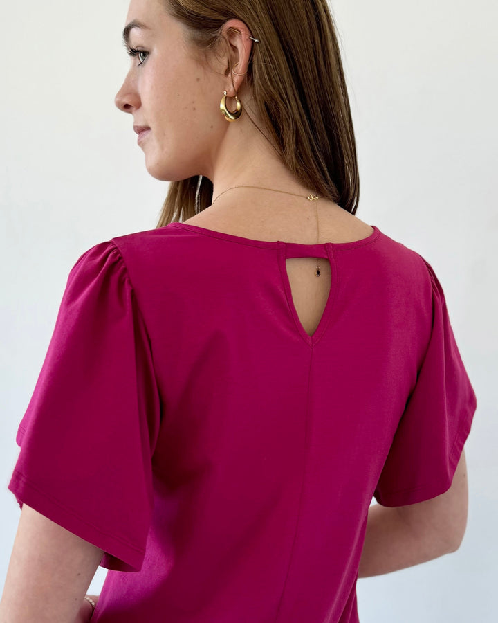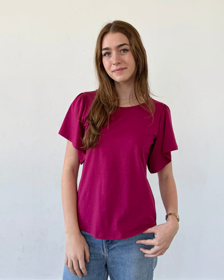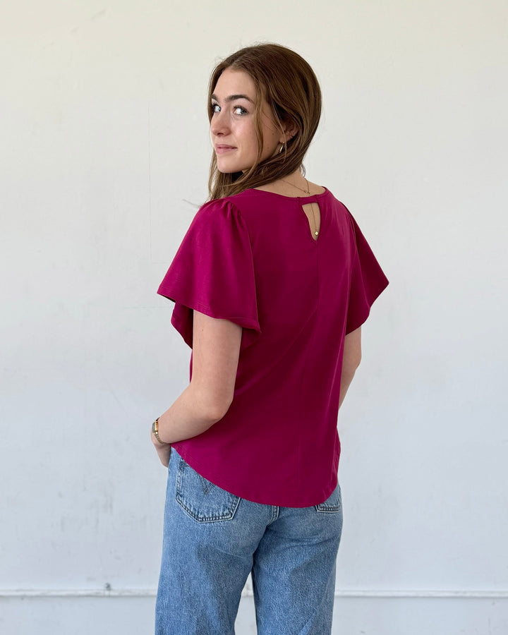 A basic tee with details that make it special. A surprise keyhole in the back and sweet flutter sleeves. Curved hem.
