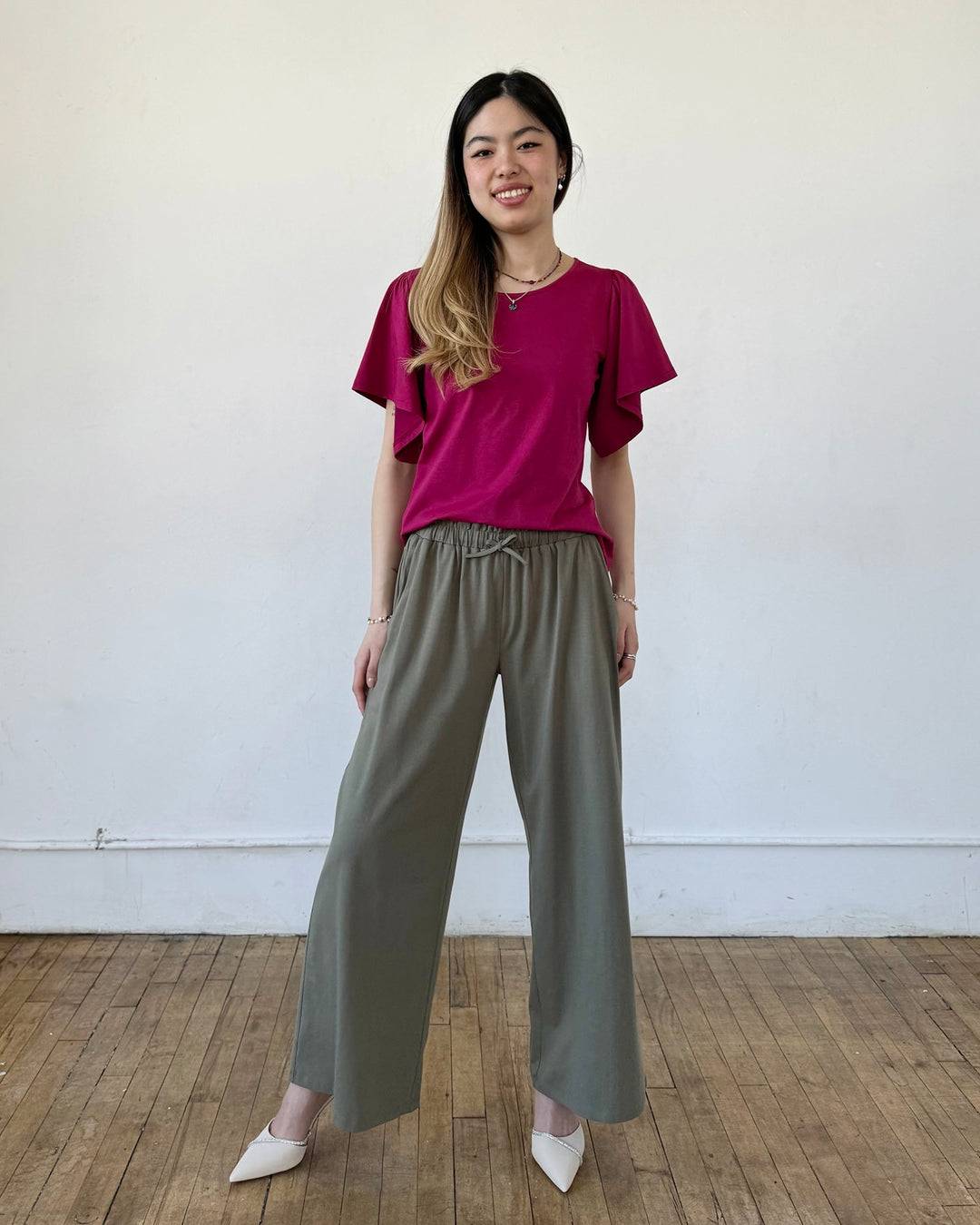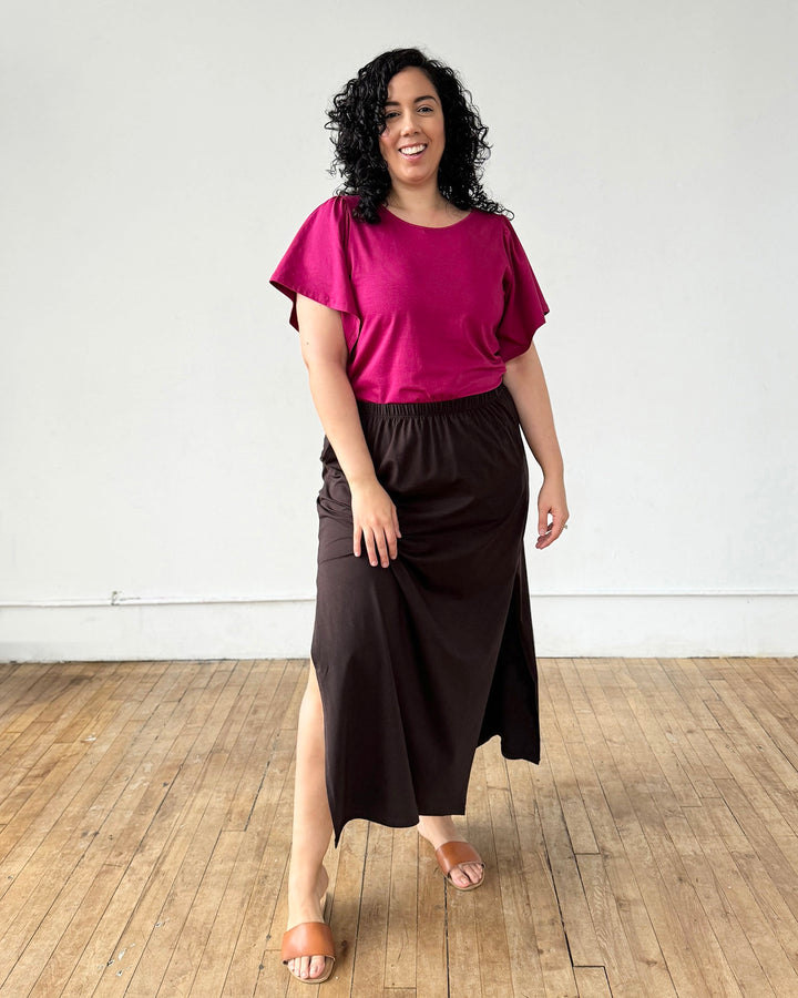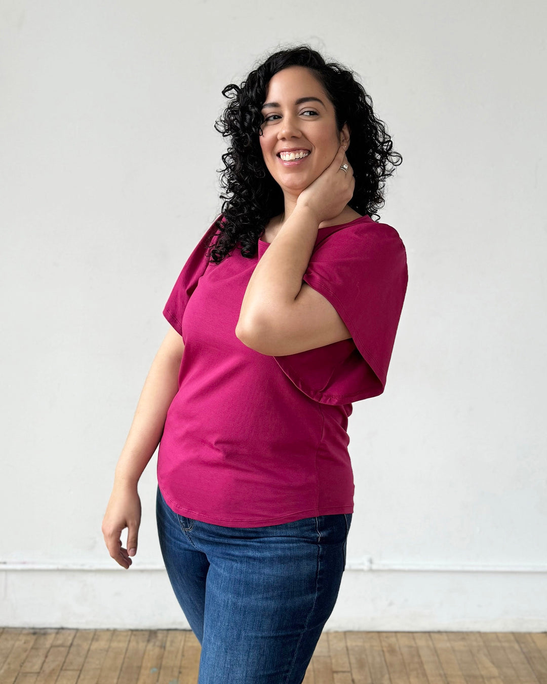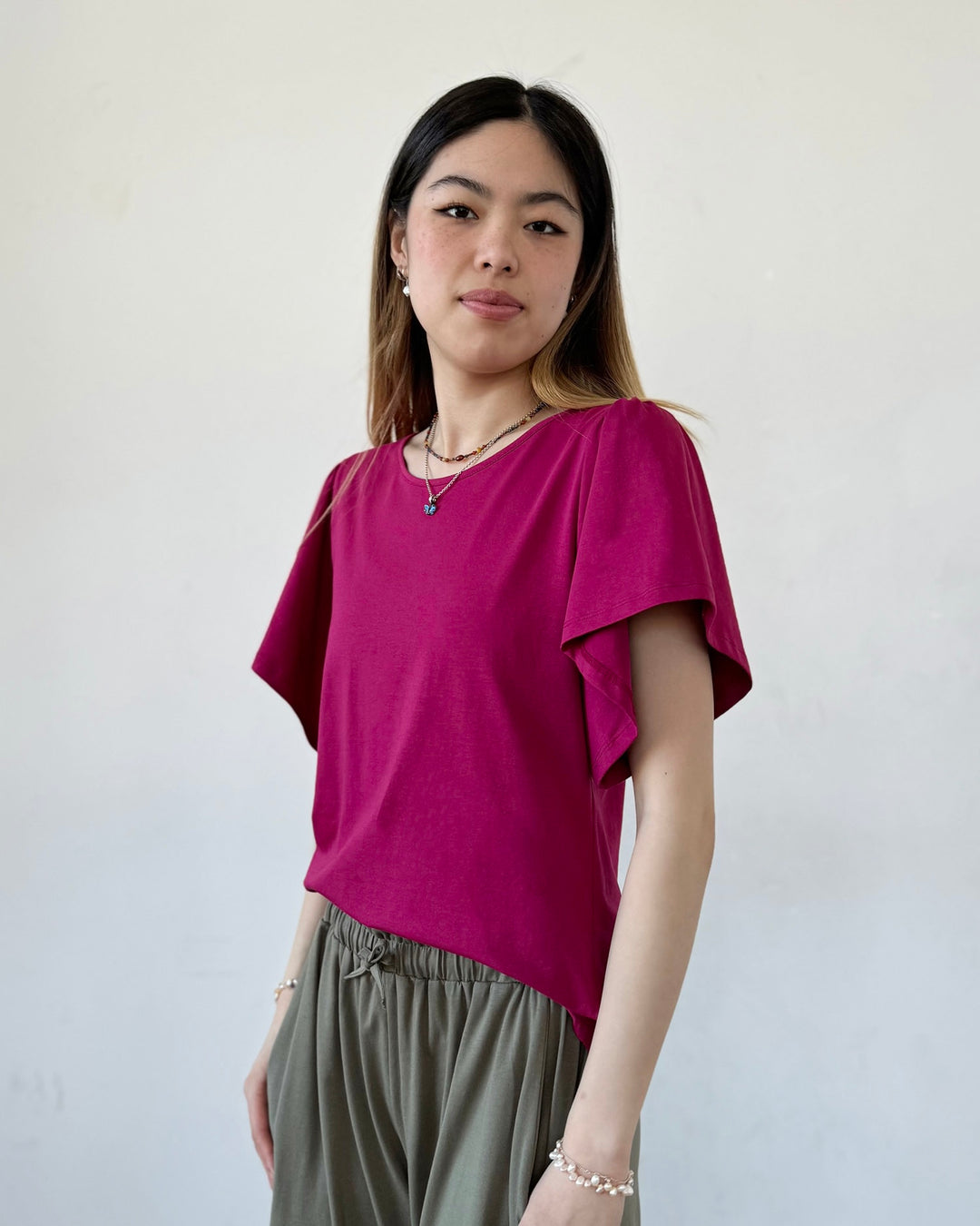 A basic tee with details that make it special. A surprise keyhole in the back and sweet flutter sleeves. Curved hem.