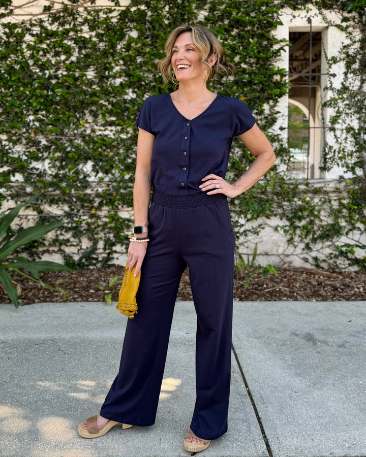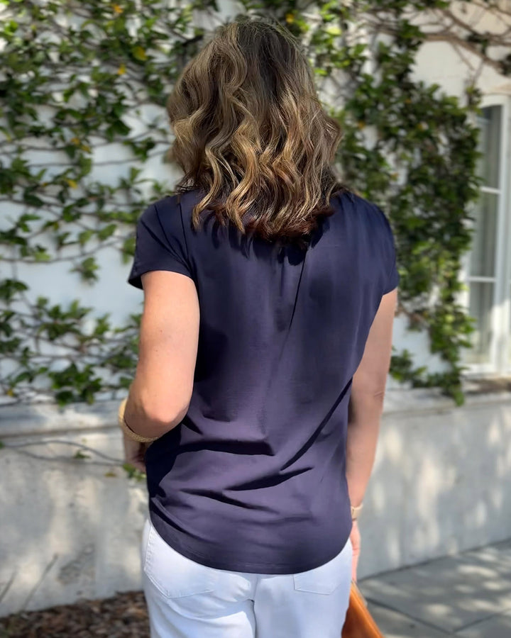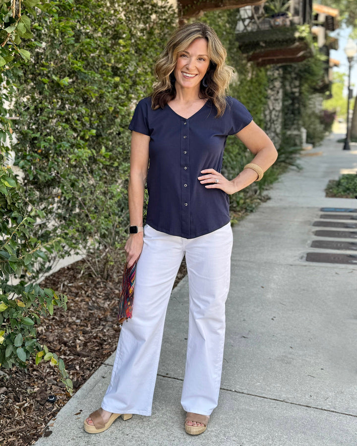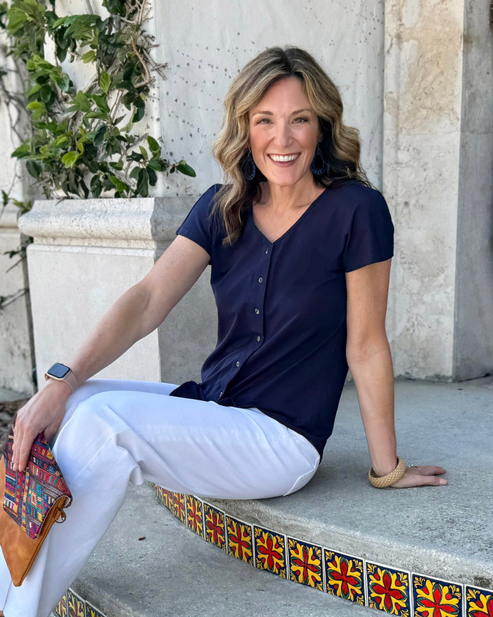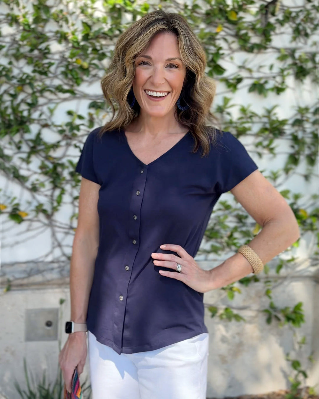 A versatile classic with a twist. Wear it untucked, tucked in, or tied at the front. The functional buttons provide ease for nursing moms, while the back neck gathering creates a comfortable fit.