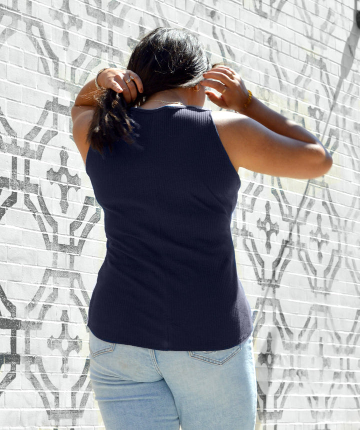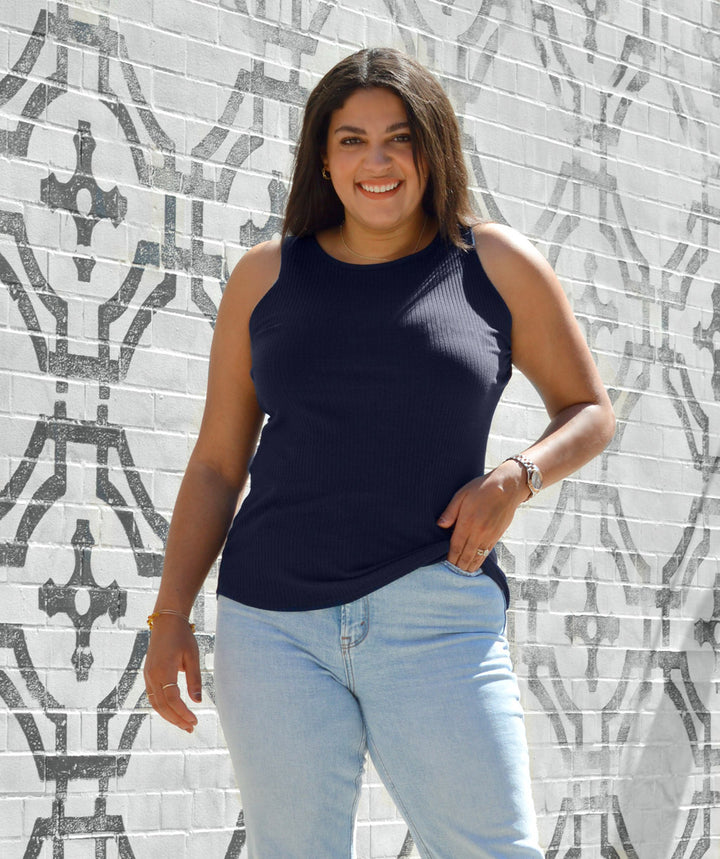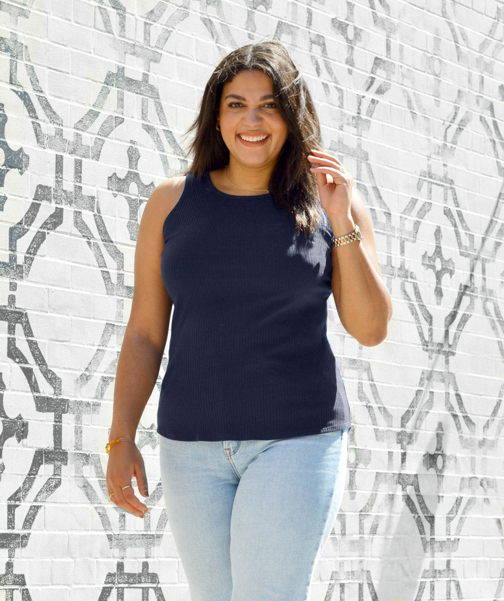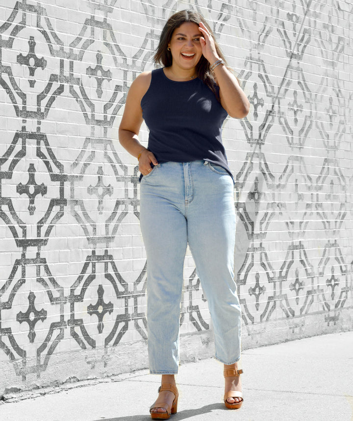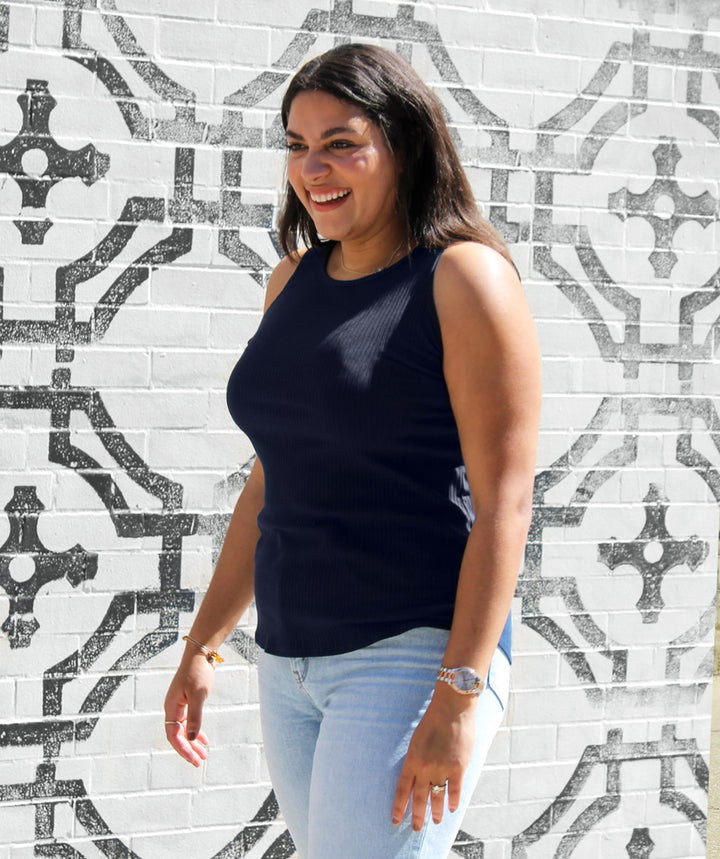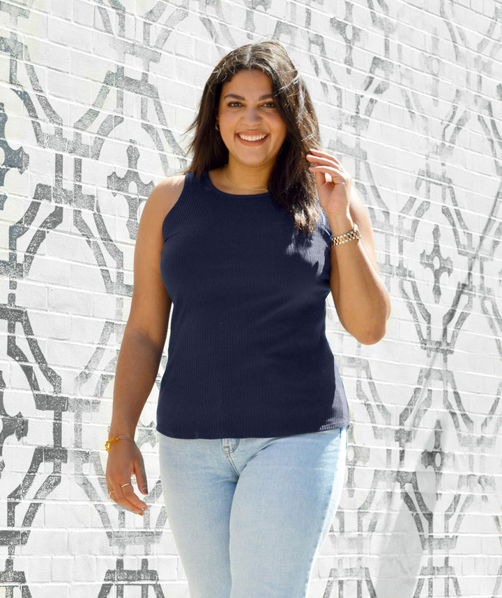 • Don't overthink it.  We have a low return rate overall because most designs are flattering in a size up or down. Our knit fabrics drape in all the right ways!