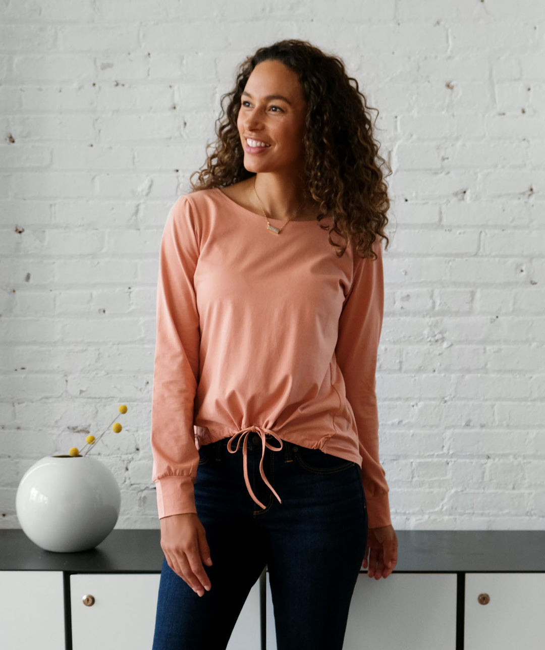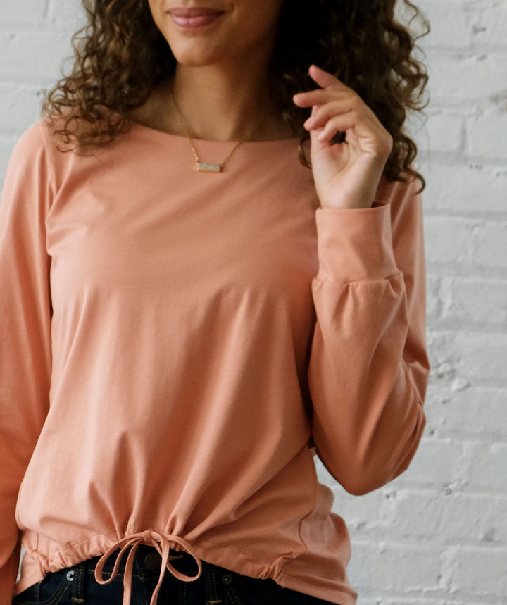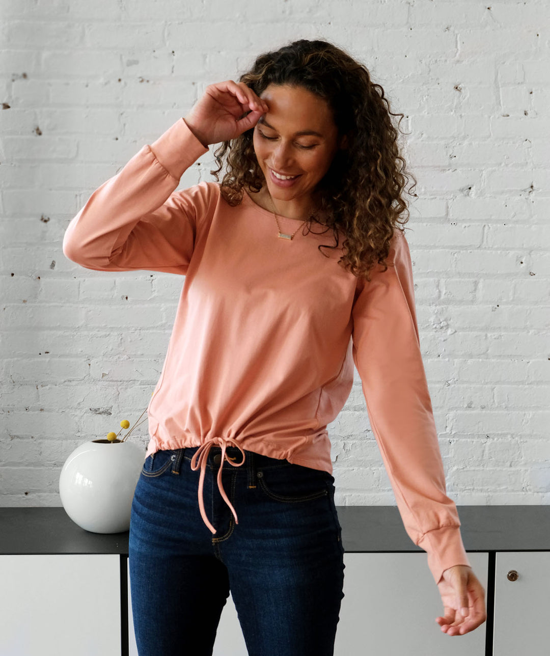 - Drawstring can be worn relaxed, or it can be cinched tighter to raise the top higher for shorter torsos or high-waisted outfits.