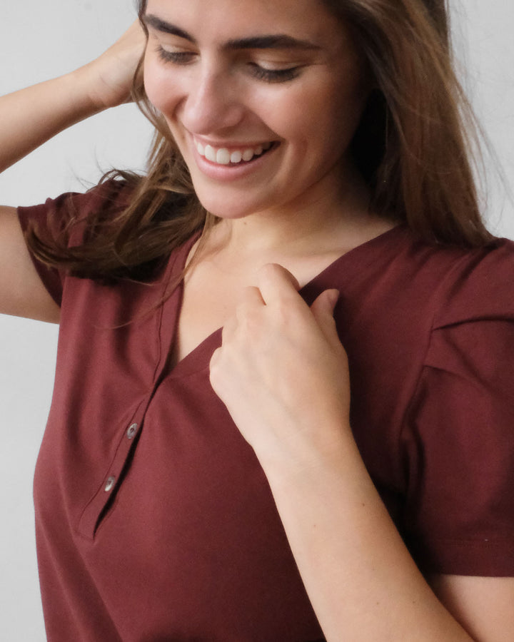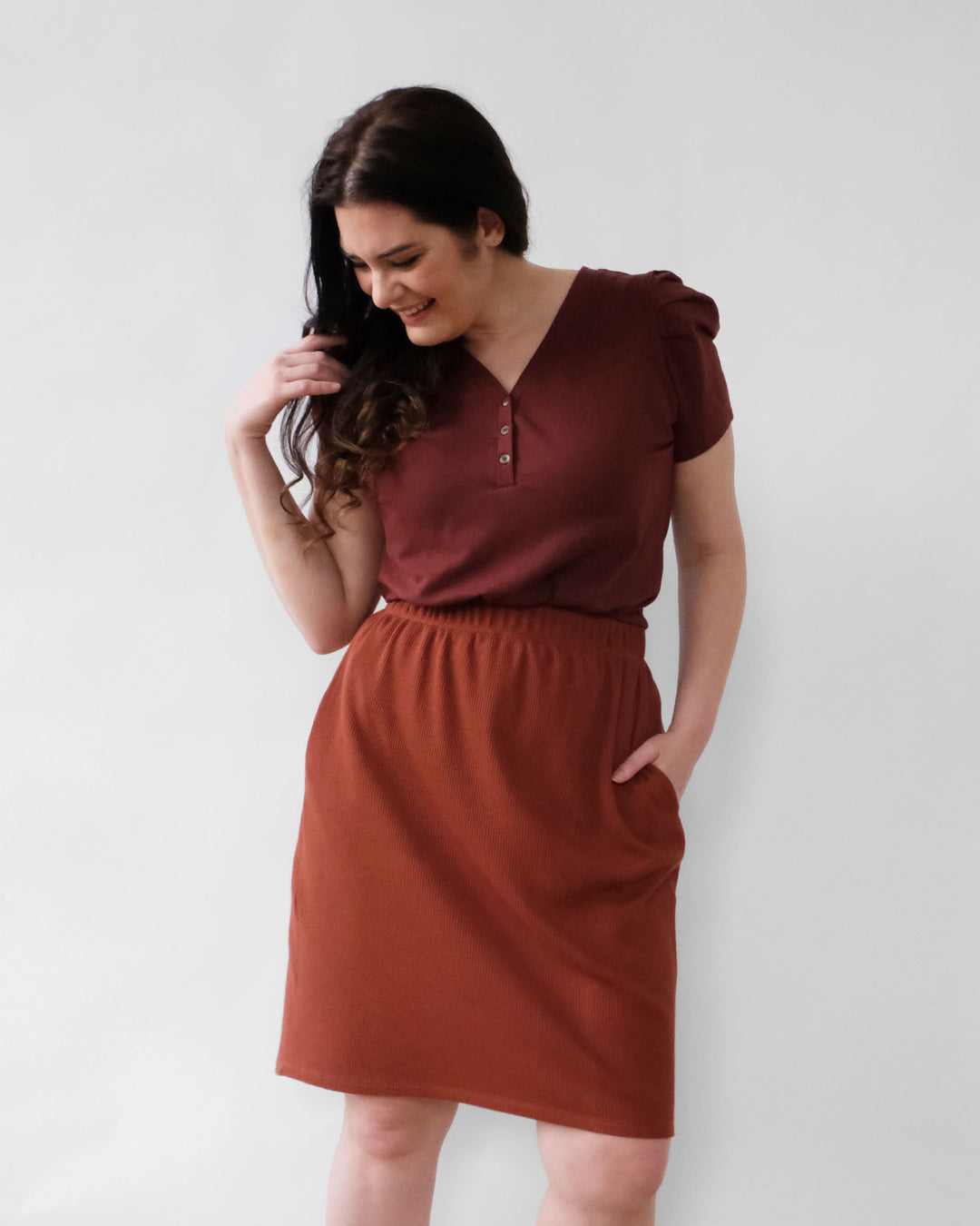 • Don't overthink it.  We have a low return rate overall because most designs are flattering in a size up or down. Our knit fabrics drape in all the right ways!