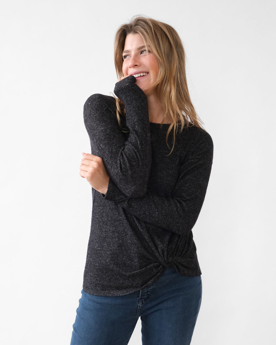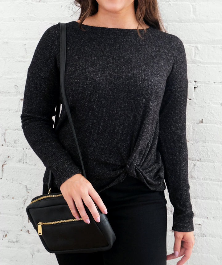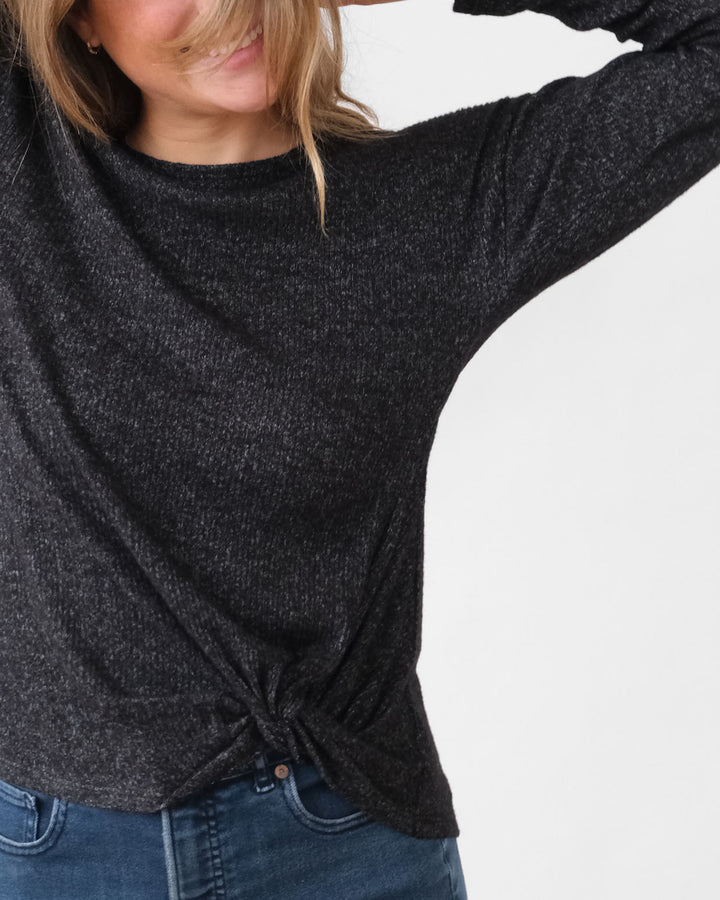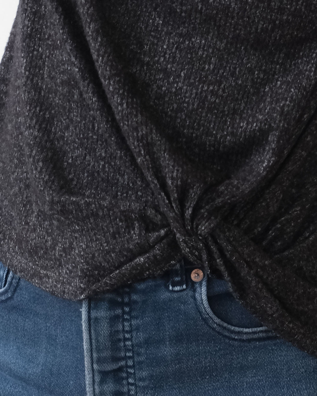 • Front twist is built-in; effortless to slip on. The shortest part of the front is long enough to cover the top of your jeans.