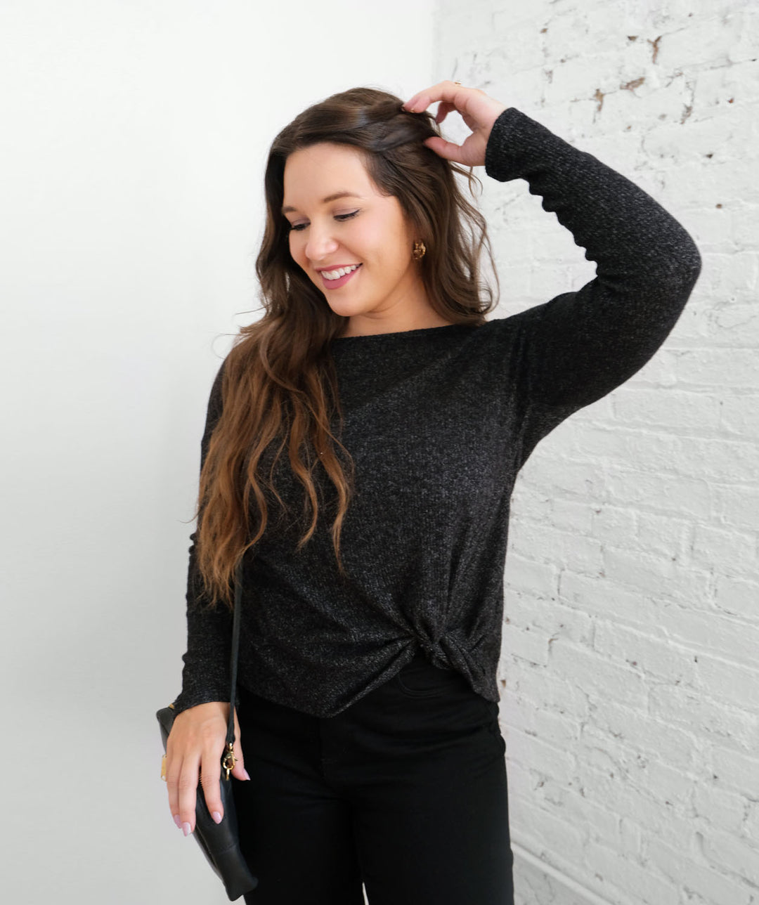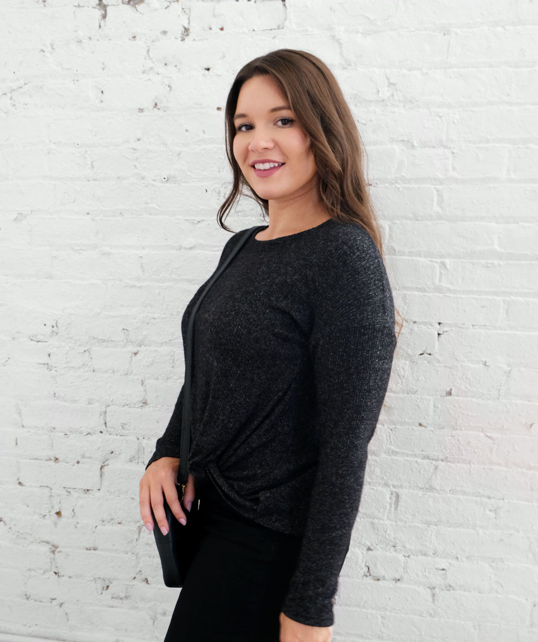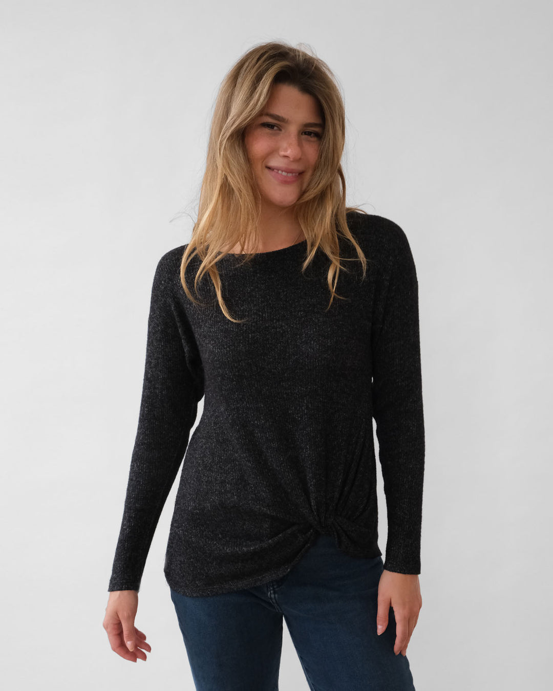 • Front twist is built-in; effortless to slip on. The shortest part of the front is long enough to cover the top of your jeans.