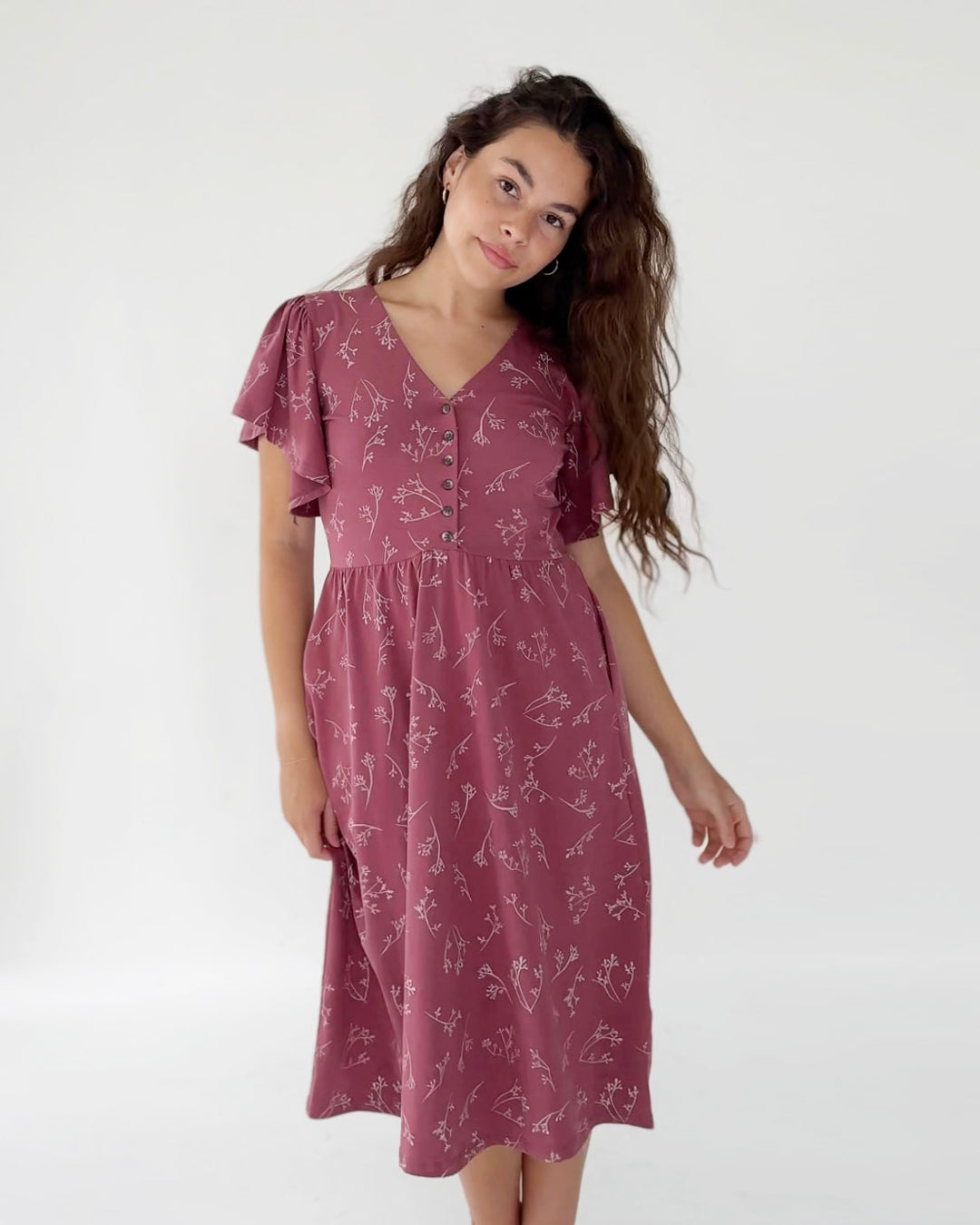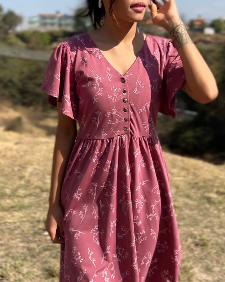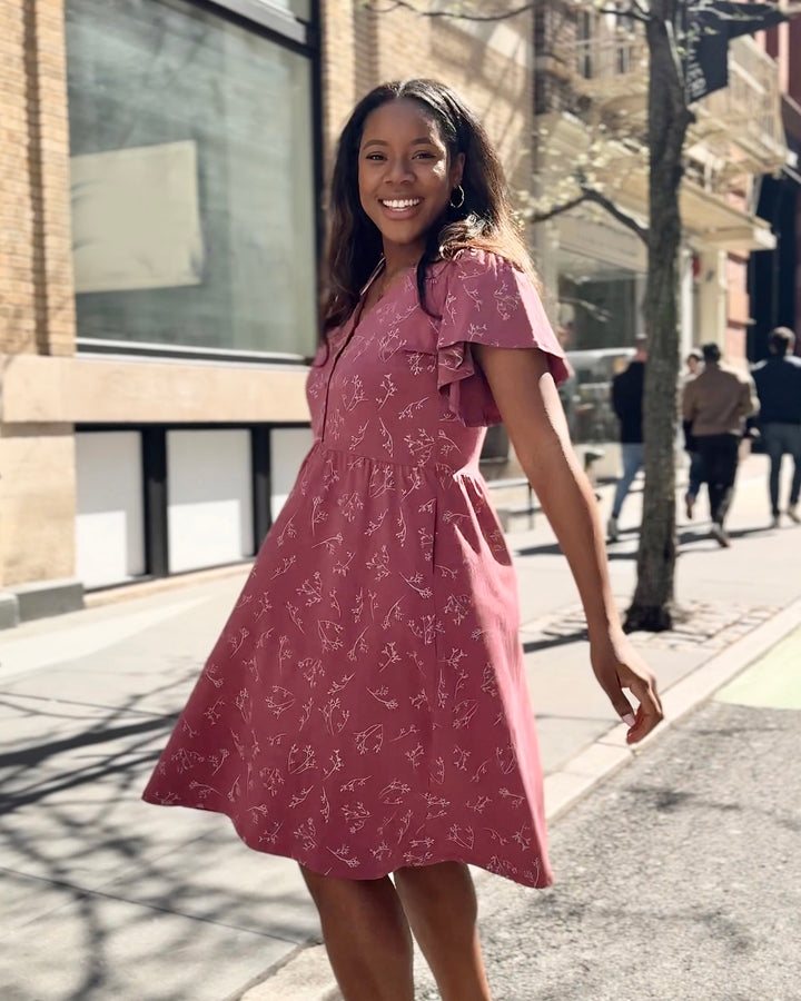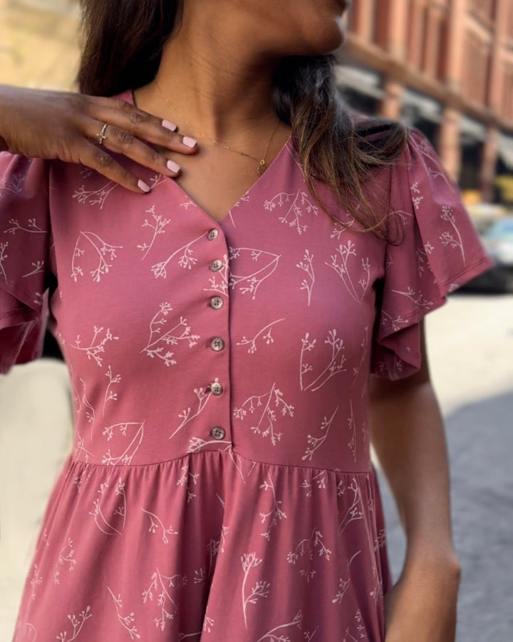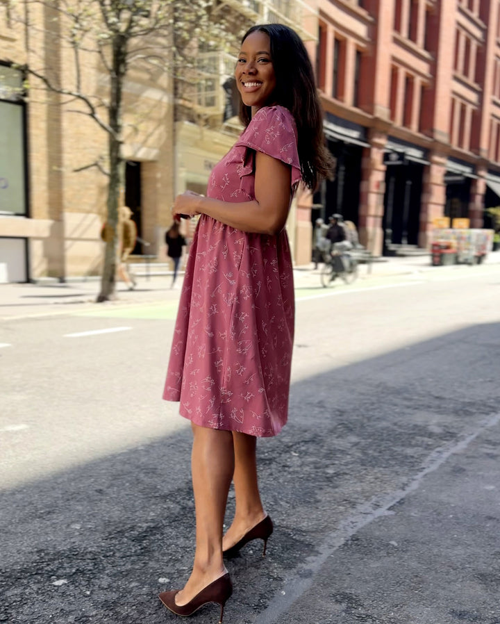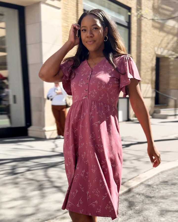 This elegant dress features a nursing-friendly design with functional tortoise shell buttons. The fluttery sleeves add sophistication while the fitted style allows for gentle movement around the hip. Get ready to conquer the day in style and comfort!